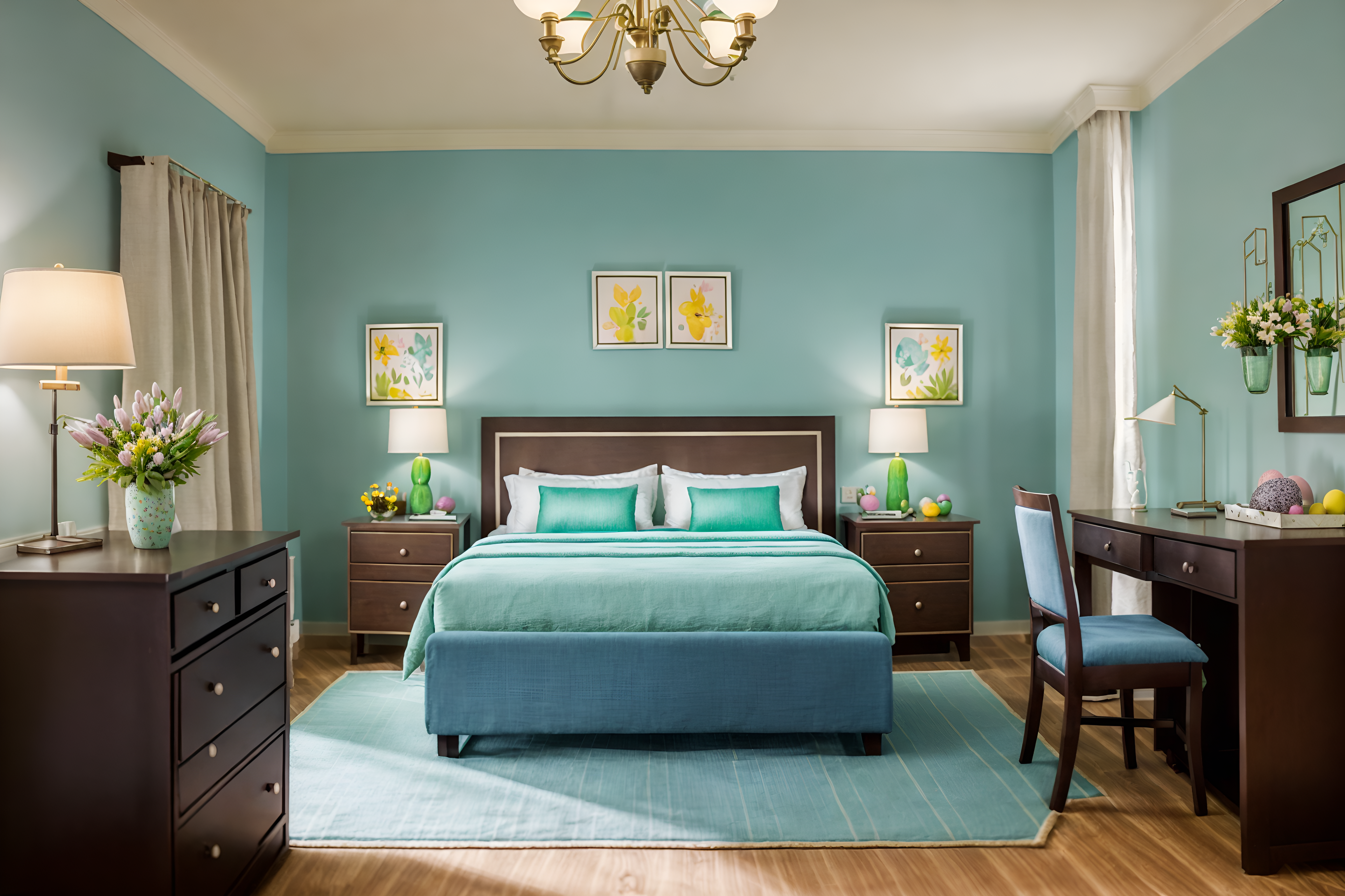 photo from pinterest of easter-style interior designed (hotel room interior) with hotel bathroom and dresser closet and bedside table or night stand and headboard and storage bench or ottoman and night light and working desk with desk chair and plant. . with easter decorations and light blue colors and colorful easter eggs and flowers on table and spring decorations and easter decorations. . cinematic photo, highly detailed, cinematic lighting, ultra-detailed, ultrarealistic, photorealism, 8k. trending on pinterest. easter interior design style. masterpiece, cinematic light, ultrarealistic+, photorealistic+, 8k, raw photo, realistic, sharp focus on eyes, (symmetrical eyes), (intact eyes), hyperrealistic, highest quality, best quality, , highly detailed, masterpiece, best quality, extremely detailed 8k wallpaper, masterpiece, best quality, ultra-detailed, best shadow, detailed background, detailed face, detailed eyes, high contrast, best illumination, detailed face, dulux, caustic, dynamic angle, detailed glow. dramatic lighting. highly detailed, insanely detailed hair, symmetrical, intricate details, professionally retouched, 8k high definition. strong bokeh. award winning photo.