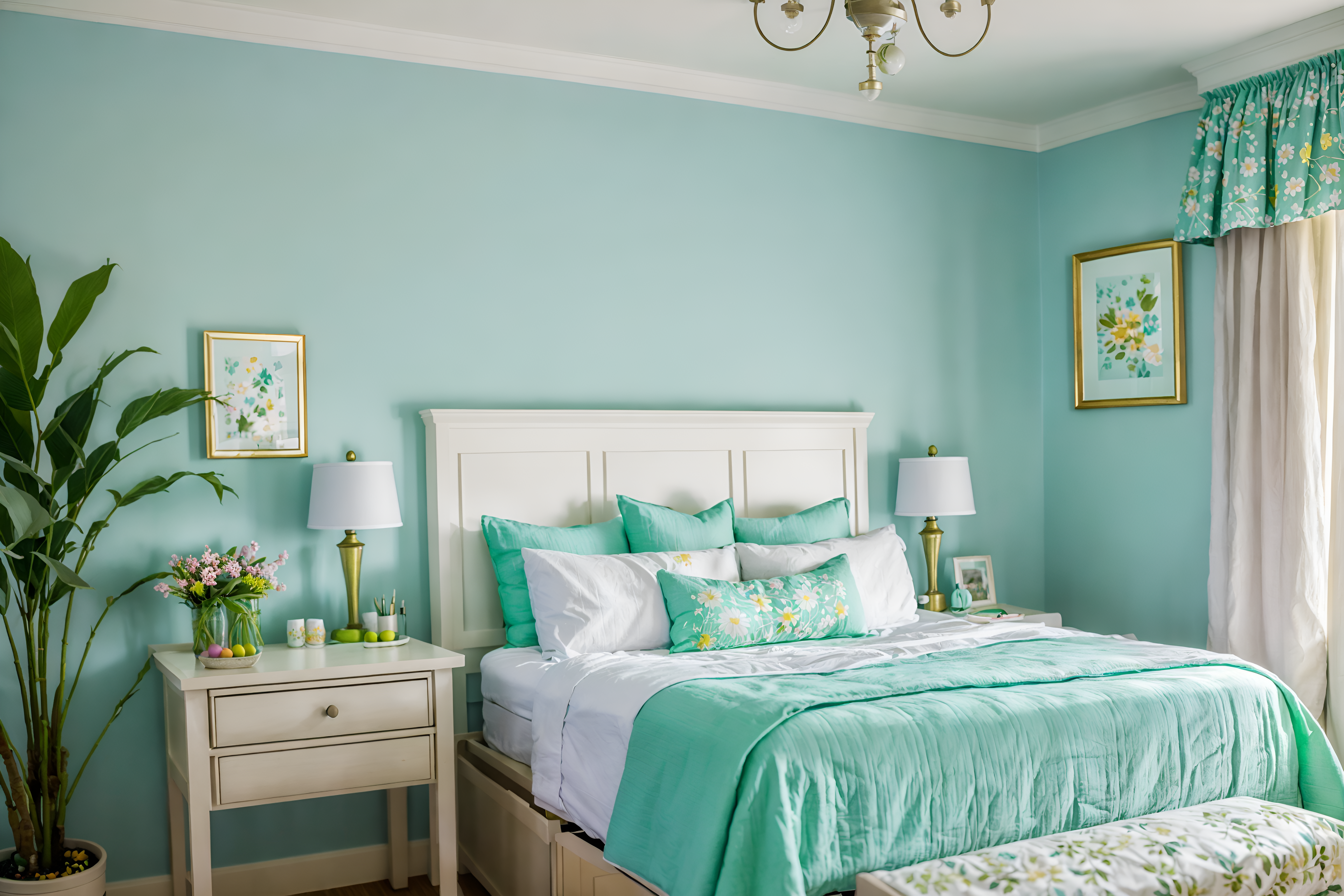 photo from pinterest of easter-style interior designed (hotel room interior) with hotel bathroom and dresser closet and bedside table or night stand and headboard and storage bench or ottoman and night light and working desk with desk chair and plant. . with easter decorations and light blue colors and colorful easter eggs and flowers on table and spring decorations and easter decorations. . cinematic photo, highly detailed, cinematic lighting, ultra-detailed, ultrarealistic, photorealism, 8k. trending on pinterest. easter interior design style. masterpiece, cinematic light, ultrarealistic+, photorealistic+, 8k, raw photo, realistic, sharp focus on eyes, (symmetrical eyes), (intact eyes), hyperrealistic, highest quality, best quality, , highly detailed, masterpiece, best quality, extremely detailed 8k wallpaper, masterpiece, best quality, ultra-detailed, best shadow, detailed background, detailed face, detailed eyes, high contrast, best illumination, detailed face, dulux, caustic, dynamic angle, detailed glow. dramatic lighting. highly detailed, insanely detailed hair, symmetrical, intricate details, professionally retouched, 8k high definition. strong bokeh. award winning photo.