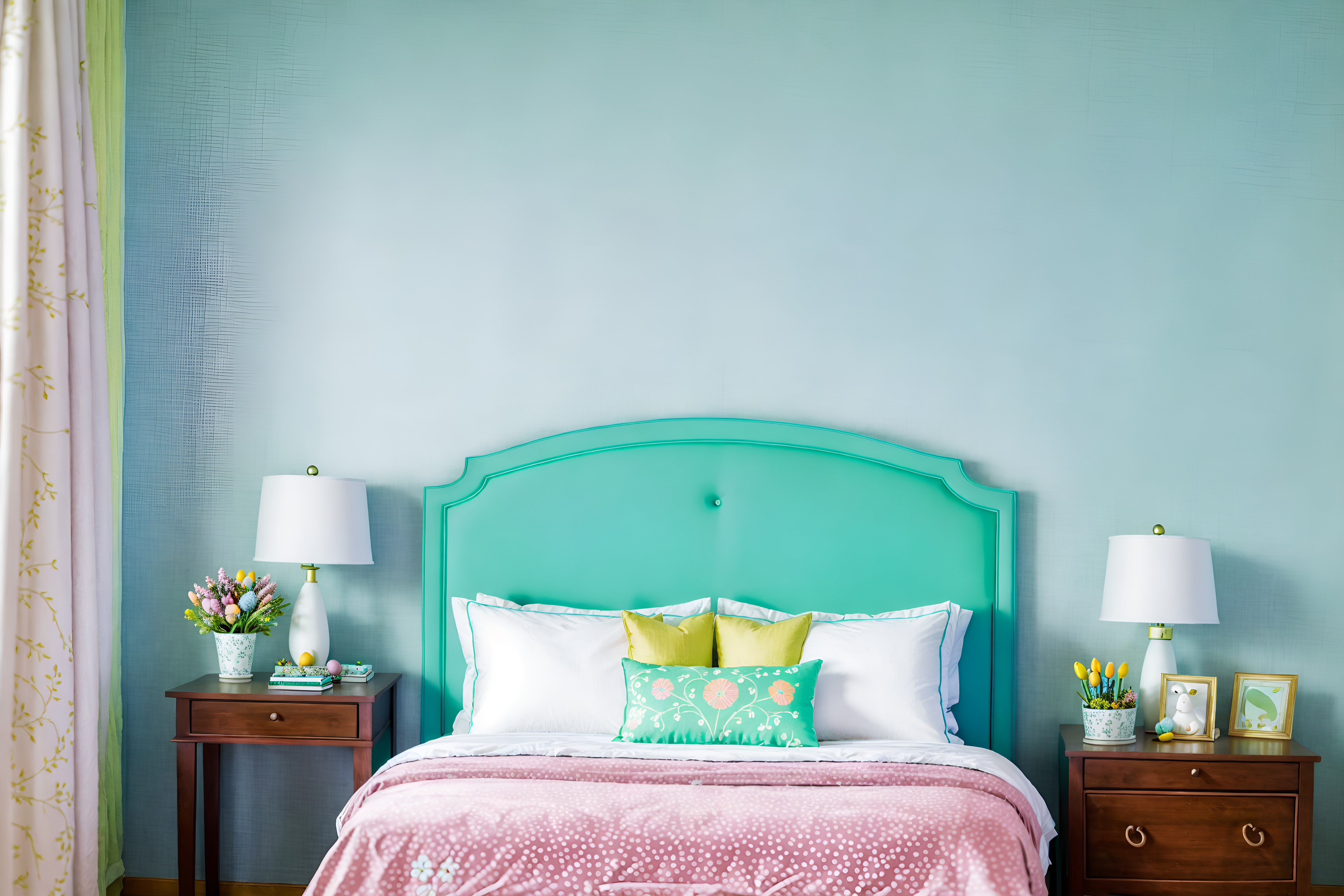 photo from pinterest of easter-style interior designed (hotel room interior) with hotel bathroom and dresser closet and bedside table or night stand and headboard and storage bench or ottoman and night light and working desk with desk chair and plant. . with easter decorations and light blue colors and colorful easter eggs and flowers on table and spring decorations and easter decorations. . cinematic photo, highly detailed, cinematic lighting, ultra-detailed, ultrarealistic, photorealism, 8k. trending on pinterest. easter interior design style. masterpiece, cinematic light, ultrarealistic+, photorealistic+, 8k, raw photo, realistic, sharp focus on eyes, (symmetrical eyes), (intact eyes), hyperrealistic, highest quality, best quality, , highly detailed, masterpiece, best quality, extremely detailed 8k wallpaper, masterpiece, best quality, ultra-detailed, best shadow, detailed background, detailed face, detailed eyes, high contrast, best illumination, detailed face, dulux, caustic, dynamic angle, detailed glow. dramatic lighting. highly detailed, insanely detailed hair, symmetrical, intricate details, professionally retouched, 8k high definition. strong bokeh. award winning photo.