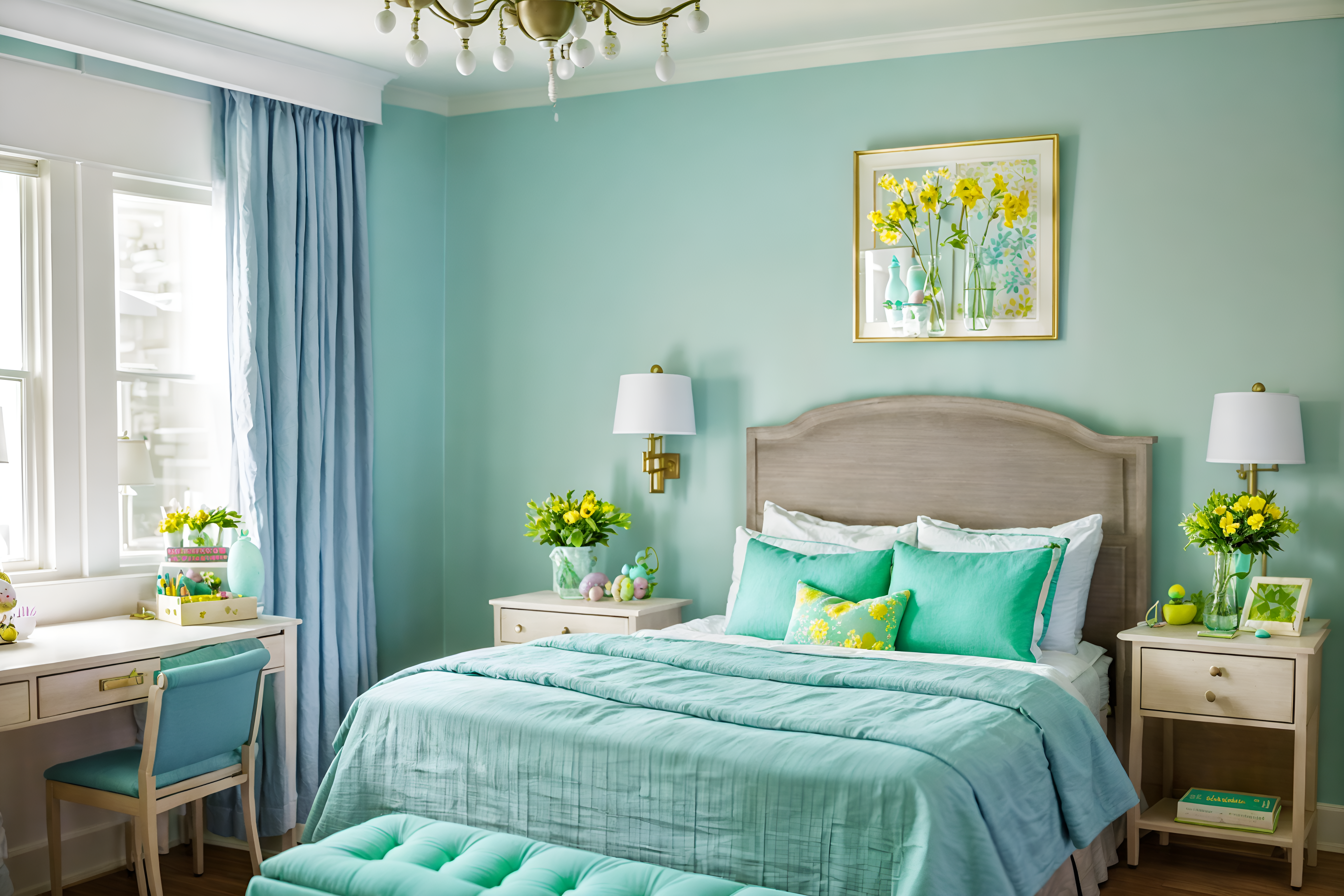 photo from pinterest of easter-style interior designed (hotel room interior) with hotel bathroom and dresser closet and bedside table or night stand and headboard and storage bench or ottoman and night light and working desk with desk chair and plant. . with easter decorations and light blue colors and colorful easter eggs and flowers on table and spring decorations and easter decorations. . cinematic photo, highly detailed, cinematic lighting, ultra-detailed, ultrarealistic, photorealism, 8k. trending on pinterest. easter interior design style. masterpiece, cinematic light, ultrarealistic+, photorealistic+, 8k, raw photo, realistic, sharp focus on eyes, (symmetrical eyes), (intact eyes), hyperrealistic, highest quality, best quality, , highly detailed, masterpiece, best quality, extremely detailed 8k wallpaper, masterpiece, best quality, ultra-detailed, best shadow, detailed background, detailed face, detailed eyes, high contrast, best illumination, detailed face, dulux, caustic, dynamic angle, detailed glow. dramatic lighting. highly detailed, insanely detailed hair, symmetrical, intricate details, professionally retouched, 8k high definition. strong bokeh. award winning photo.