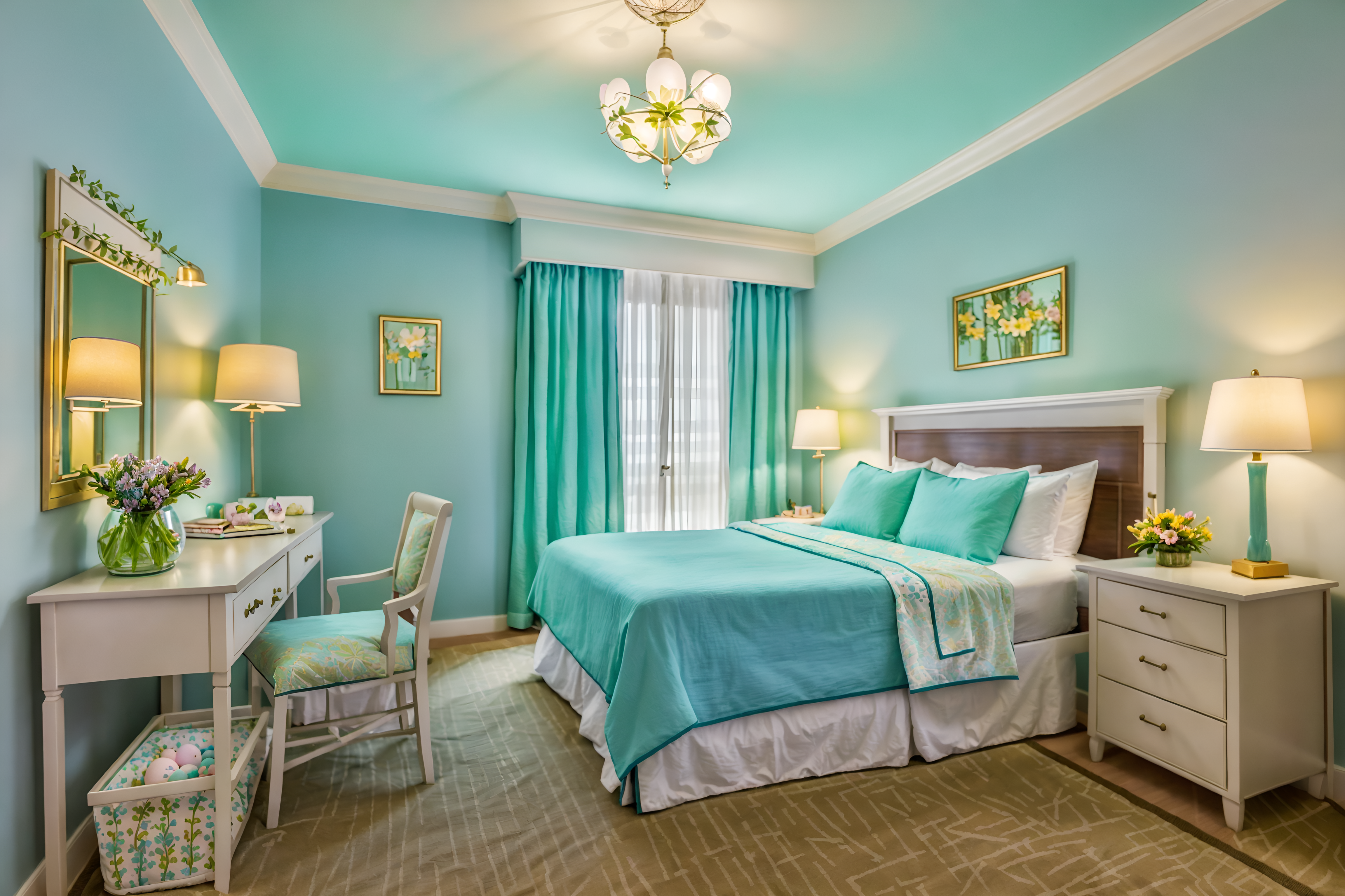 photo from pinterest of easter-style interior designed (hotel room interior) with hotel bathroom and dresser closet and bedside table or night stand and headboard and storage bench or ottoman and night light and working desk with desk chair and plant. . with easter decorations and light blue colors and colorful easter eggs and flowers on table and spring decorations and easter decorations. . cinematic photo, highly detailed, cinematic lighting, ultra-detailed, ultrarealistic, photorealism, 8k. trending on pinterest. easter interior design style. masterpiece, cinematic light, ultrarealistic+, photorealistic+, 8k, raw photo, realistic, sharp focus on eyes, (symmetrical eyes), (intact eyes), hyperrealistic, highest quality, best quality, , highly detailed, masterpiece, best quality, extremely detailed 8k wallpaper, masterpiece, best quality, ultra-detailed, best shadow, detailed background, detailed face, detailed eyes, high contrast, best illumination, detailed face, dulux, caustic, dynamic angle, detailed glow. dramatic lighting. highly detailed, insanely detailed hair, symmetrical, intricate details, professionally retouched, 8k high definition. strong bokeh. award winning photo.