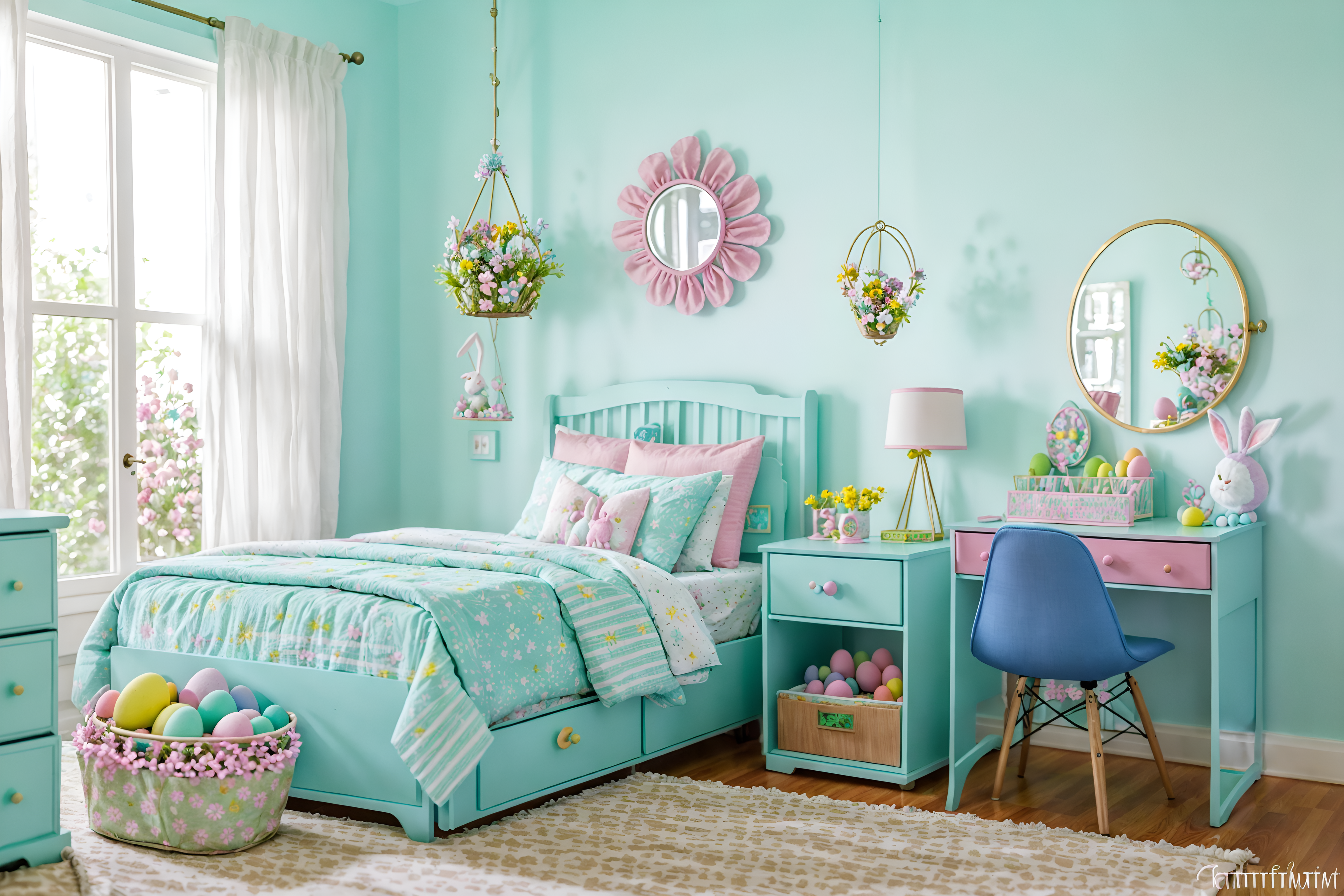 photo from pinterest of easter-style interior designed (kids room interior) with bedside table or night stand and mirror and night light and headboard and accent chair and plant and kids desk and storage bench or ottoman. . with easter decorations and colorful easter eggs and light blue colors and spring decorations and flowers on table and easter decorations. . cinematic photo, highly detailed, cinematic lighting, ultra-detailed, ultrarealistic, photorealism, 8k. trending on pinterest. easter interior design style. masterpiece, cinematic light, ultrarealistic+, photorealistic+, 8k, raw photo, realistic, sharp focus on eyes, (symmetrical eyes), (intact eyes), hyperrealistic, highest quality, best quality, , highly detailed, masterpiece, best quality, extremely detailed 8k wallpaper, masterpiece, best quality, ultra-detailed, best shadow, detailed background, detailed face, detailed eyes, high contrast, best illumination, detailed face, dulux, caustic, dynamic angle, detailed glow. dramatic lighting. highly detailed, insanely detailed hair, symmetrical, intricate details, professionally retouched, 8k high definition. strong bokeh. award winning photo.