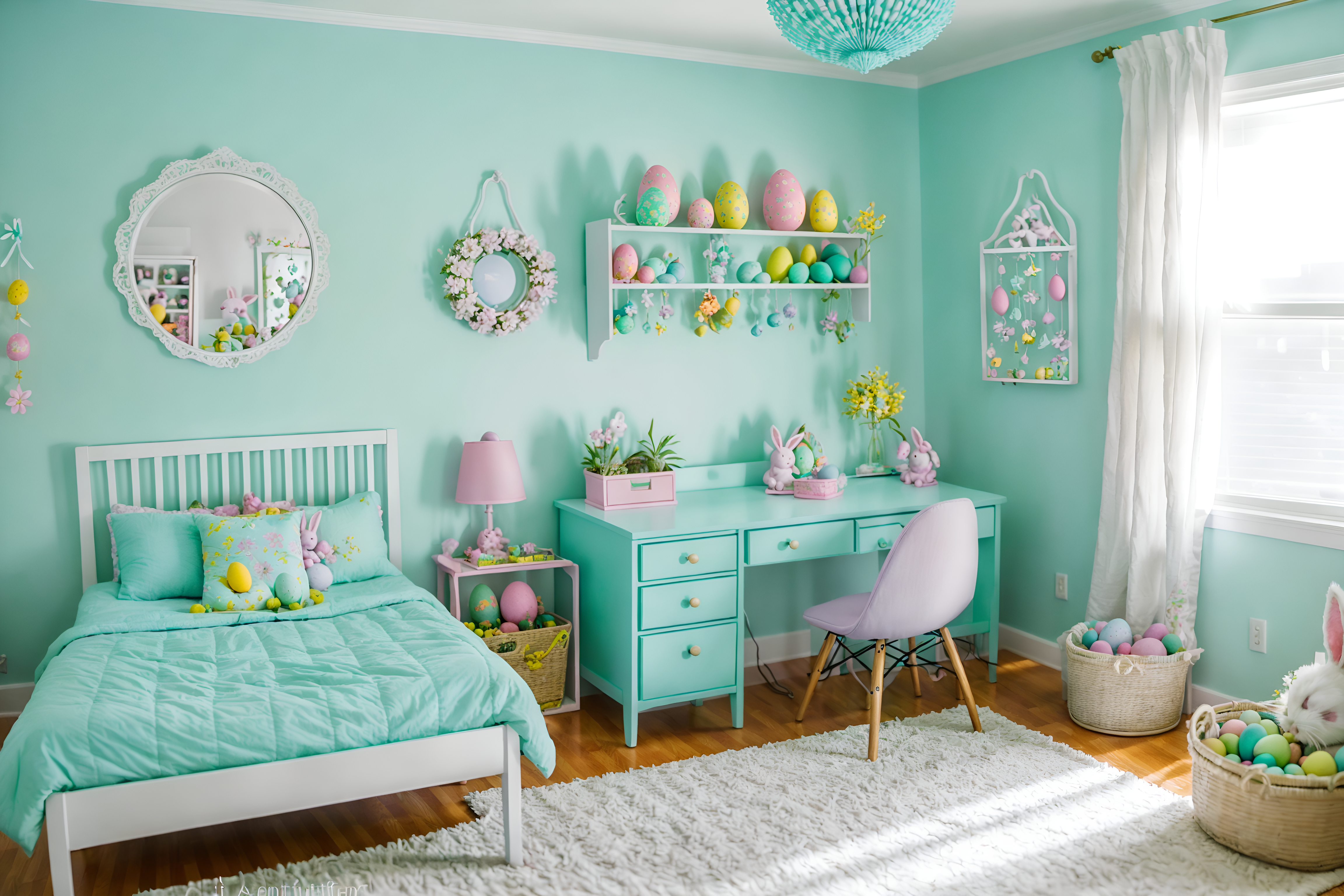 photo from pinterest of easter-style interior designed (kids room interior) with bedside table or night stand and mirror and night light and headboard and accent chair and plant and kids desk and storage bench or ottoman. . with easter decorations and colorful easter eggs and light blue colors and spring decorations and flowers on table and easter decorations. . cinematic photo, highly detailed, cinematic lighting, ultra-detailed, ultrarealistic, photorealism, 8k. trending on pinterest. easter interior design style. masterpiece, cinematic light, ultrarealistic+, photorealistic+, 8k, raw photo, realistic, sharp focus on eyes, (symmetrical eyes), (intact eyes), hyperrealistic, highest quality, best quality, , highly detailed, masterpiece, best quality, extremely detailed 8k wallpaper, masterpiece, best quality, ultra-detailed, best shadow, detailed background, detailed face, detailed eyes, high contrast, best illumination, detailed face, dulux, caustic, dynamic angle, detailed glow. dramatic lighting. highly detailed, insanely detailed hair, symmetrical, intricate details, professionally retouched, 8k high definition. strong bokeh. award winning photo.