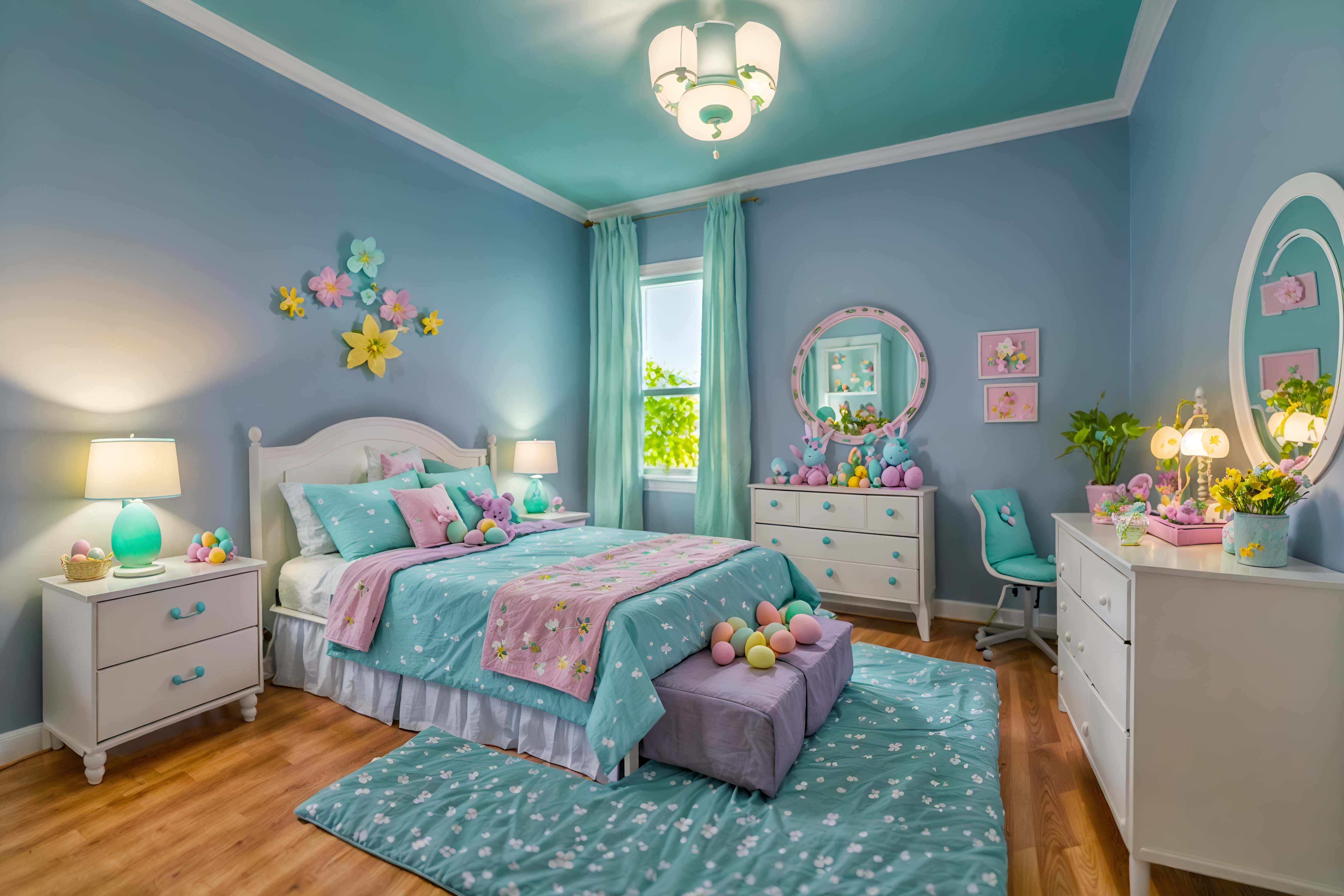 photo from pinterest of easter-style interior designed (kids room interior) with headboard and bedside table or night stand and bed and mirror and kids desk and accent chair and night light and plant. . with spring decorations and flowers on table and light blue colors and easter decorations and colorful easter eggs and spring decorations. . cinematic photo, highly detailed, cinematic lighting, ultra-detailed, ultrarealistic, photorealism, 8k. trending on pinterest. easter interior design style. masterpiece, cinematic light, ultrarealistic+, photorealistic+, 8k, raw photo, realistic, sharp focus on eyes, (symmetrical eyes), (intact eyes), hyperrealistic, highest quality, best quality, , highly detailed, masterpiece, best quality, extremely detailed 8k wallpaper, masterpiece, best quality, ultra-detailed, best shadow, detailed background, detailed face, detailed eyes, high contrast, best illumination, detailed face, dulux, caustic, dynamic angle, detailed glow. dramatic lighting. highly detailed, insanely detailed hair, symmetrical, intricate details, professionally retouched, 8k high definition. strong bokeh. award winning photo.
