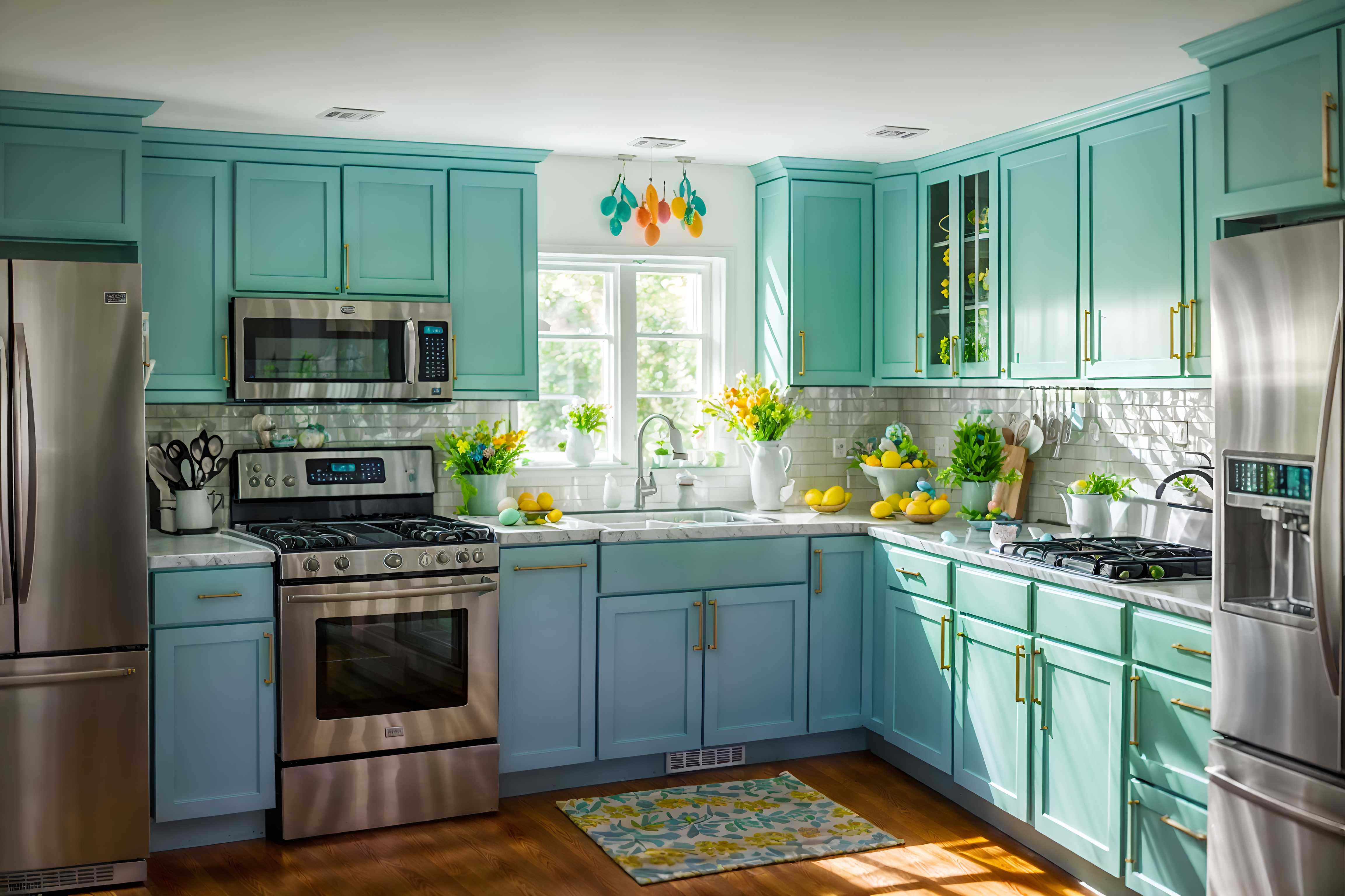 photo from pinterest of easter-style interior designed (kitchen interior) with kitchen cabinets and sink and refrigerator and plant and stove and worktops and kitchen cabinets. . with easter decorations and light blue colors and spring decorations and colorful easter eggs and flowers on table and easter decorations. . cinematic photo, highly detailed, cinematic lighting, ultra-detailed, ultrarealistic, photorealism, 8k. trending on pinterest. easter interior design style. masterpiece, cinematic light, ultrarealistic+, photorealistic+, 8k, raw photo, realistic, sharp focus on eyes, (symmetrical eyes), (intact eyes), hyperrealistic, highest quality, best quality, , highly detailed, masterpiece, best quality, extremely detailed 8k wallpaper, masterpiece, best quality, ultra-detailed, best shadow, detailed background, detailed face, detailed eyes, high contrast, best illumination, detailed face, dulux, caustic, dynamic angle, detailed glow. dramatic lighting. highly detailed, insanely detailed hair, symmetrical, intricate details, professionally retouched, 8k high definition. strong bokeh. award winning photo.