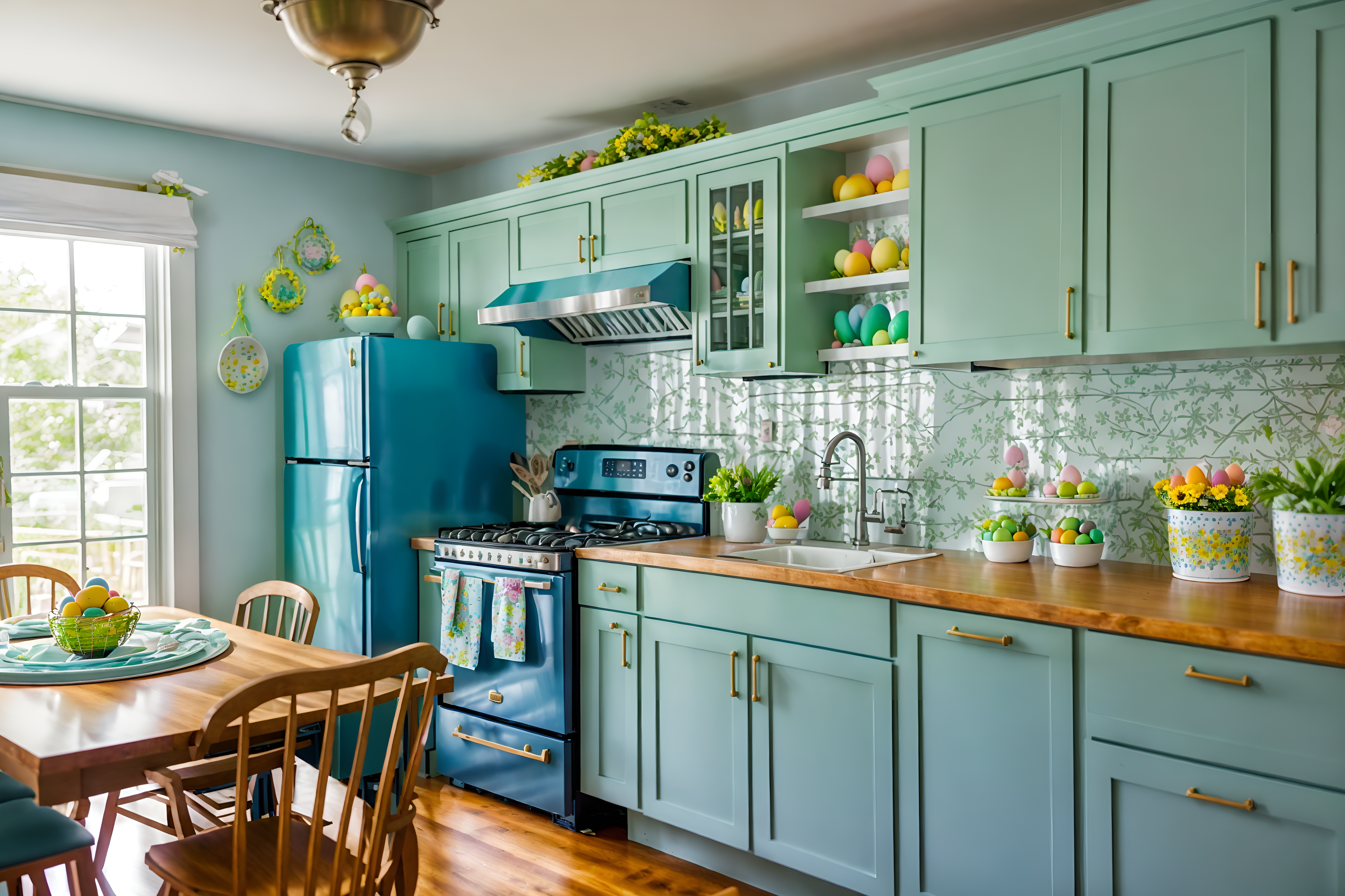 photo from pinterest of easter-style interior designed (kitchen interior) with kitchen cabinets and sink and refrigerator and plant and stove and worktops and kitchen cabinets. . with easter decorations and light blue colors and spring decorations and colorful easter eggs and flowers on table and easter decorations. . cinematic photo, highly detailed, cinematic lighting, ultra-detailed, ultrarealistic, photorealism, 8k. trending on pinterest. easter interior design style. masterpiece, cinematic light, ultrarealistic+, photorealistic+, 8k, raw photo, realistic, sharp focus on eyes, (symmetrical eyes), (intact eyes), hyperrealistic, highest quality, best quality, , highly detailed, masterpiece, best quality, extremely detailed 8k wallpaper, masterpiece, best quality, ultra-detailed, best shadow, detailed background, detailed face, detailed eyes, high contrast, best illumination, detailed face, dulux, caustic, dynamic angle, detailed glow. dramatic lighting. highly detailed, insanely detailed hair, symmetrical, intricate details, professionally retouched, 8k high definition. strong bokeh. award winning photo.