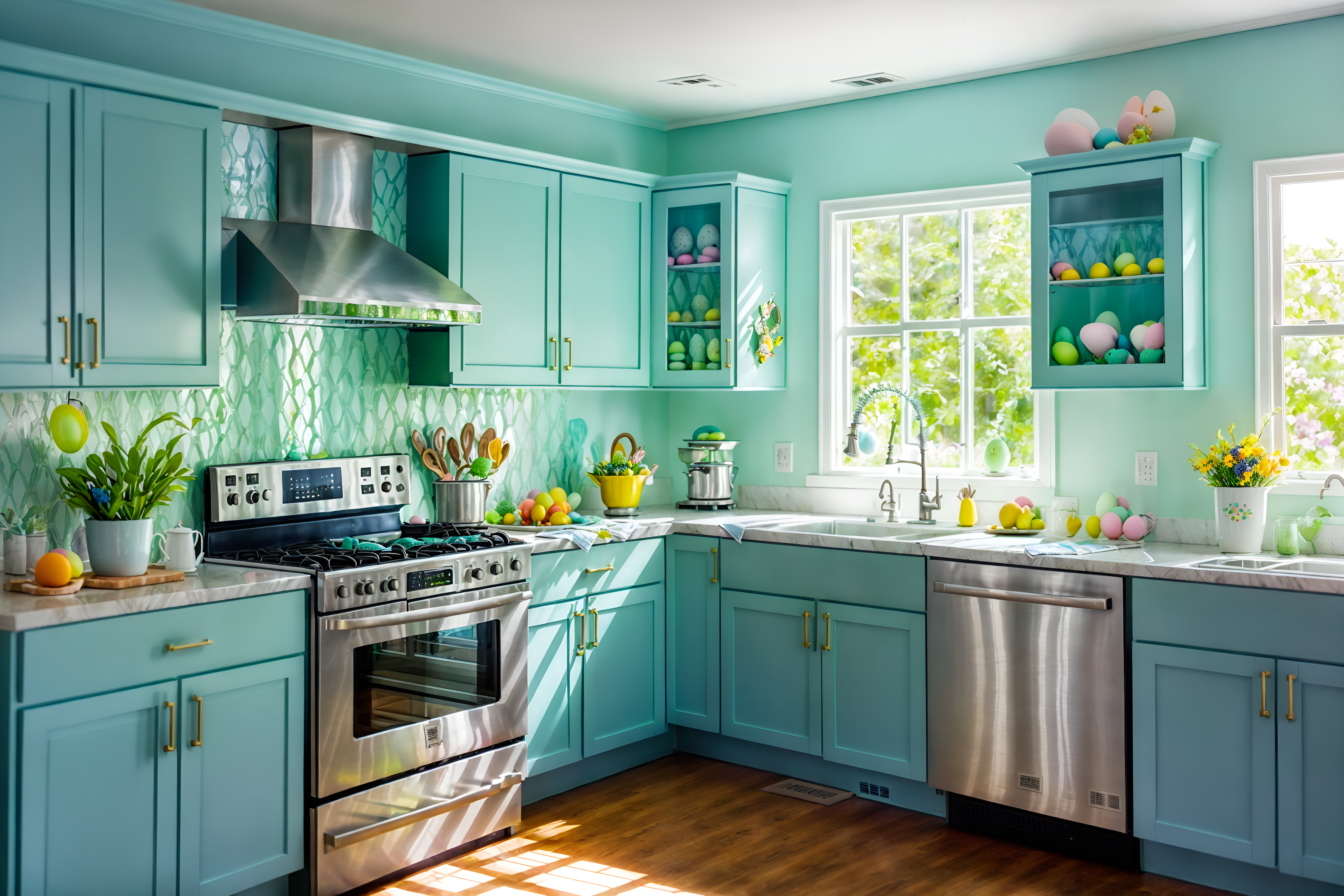 photo from pinterest of easter-style interior designed (kitchen interior) with kitchen cabinets and sink and refrigerator and plant and stove and worktops and kitchen cabinets. . with easter decorations and light blue colors and spring decorations and colorful easter eggs and flowers on table and easter decorations. . cinematic photo, highly detailed, cinematic lighting, ultra-detailed, ultrarealistic, photorealism, 8k. trending on pinterest. easter interior design style. masterpiece, cinematic light, ultrarealistic+, photorealistic+, 8k, raw photo, realistic, sharp focus on eyes, (symmetrical eyes), (intact eyes), hyperrealistic, highest quality, best quality, , highly detailed, masterpiece, best quality, extremely detailed 8k wallpaper, masterpiece, best quality, ultra-detailed, best shadow, detailed background, detailed face, detailed eyes, high contrast, best illumination, detailed face, dulux, caustic, dynamic angle, detailed glow. dramatic lighting. highly detailed, insanely detailed hair, symmetrical, intricate details, professionally retouched, 8k high definition. strong bokeh. award winning photo.