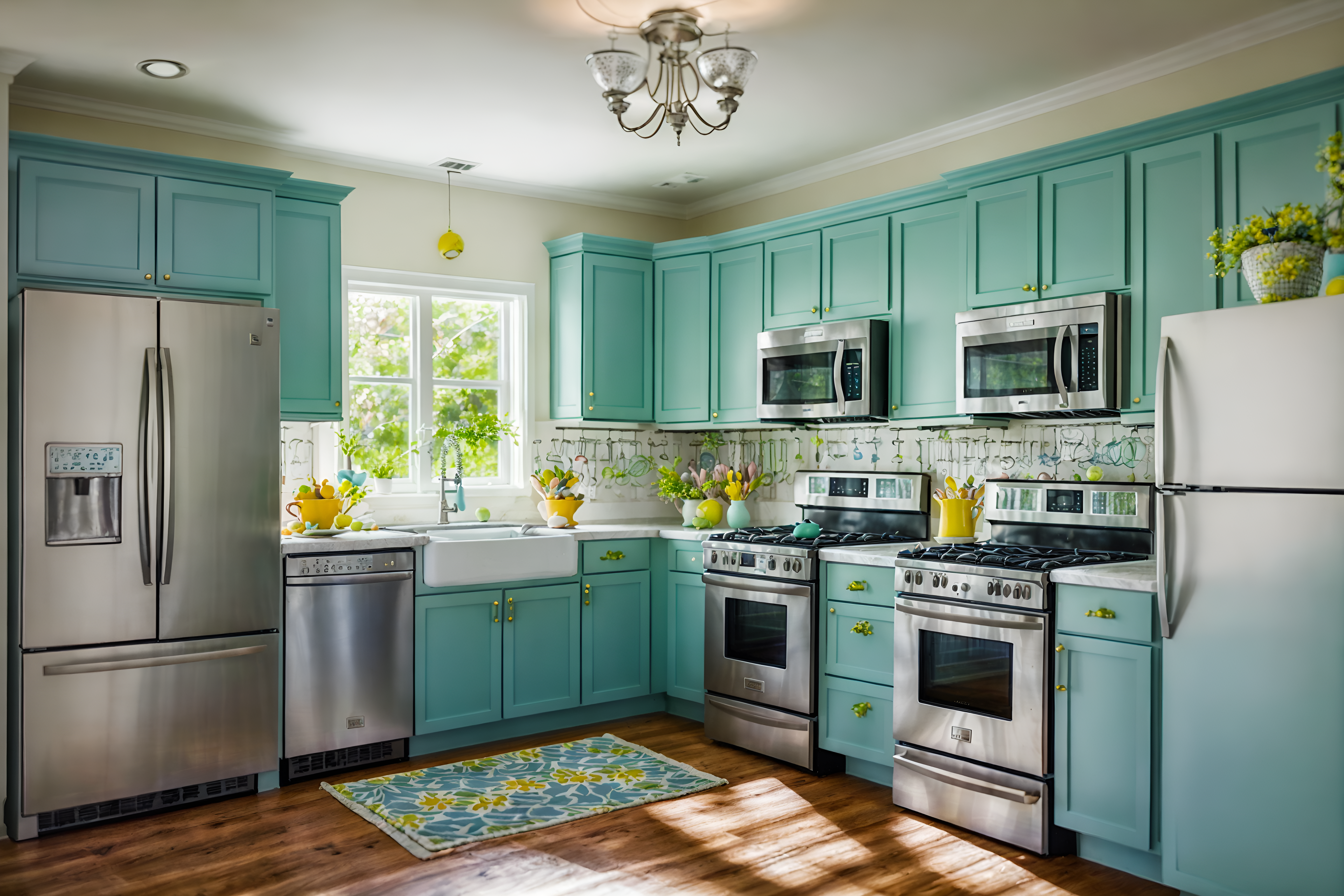 photo from pinterest of easter-style interior designed (kitchen interior) with kitchen cabinets and sink and refrigerator and plant and stove and worktops and kitchen cabinets. . with easter decorations and light blue colors and spring decorations and colorful easter eggs and flowers on table and easter decorations. . cinematic photo, highly detailed, cinematic lighting, ultra-detailed, ultrarealistic, photorealism, 8k. trending on pinterest. easter interior design style. masterpiece, cinematic light, ultrarealistic+, photorealistic+, 8k, raw photo, realistic, sharp focus on eyes, (symmetrical eyes), (intact eyes), hyperrealistic, highest quality, best quality, , highly detailed, masterpiece, best quality, extremely detailed 8k wallpaper, masterpiece, best quality, ultra-detailed, best shadow, detailed background, detailed face, detailed eyes, high contrast, best illumination, detailed face, dulux, caustic, dynamic angle, detailed glow. dramatic lighting. highly detailed, insanely detailed hair, symmetrical, intricate details, professionally retouched, 8k high definition. strong bokeh. award winning photo.