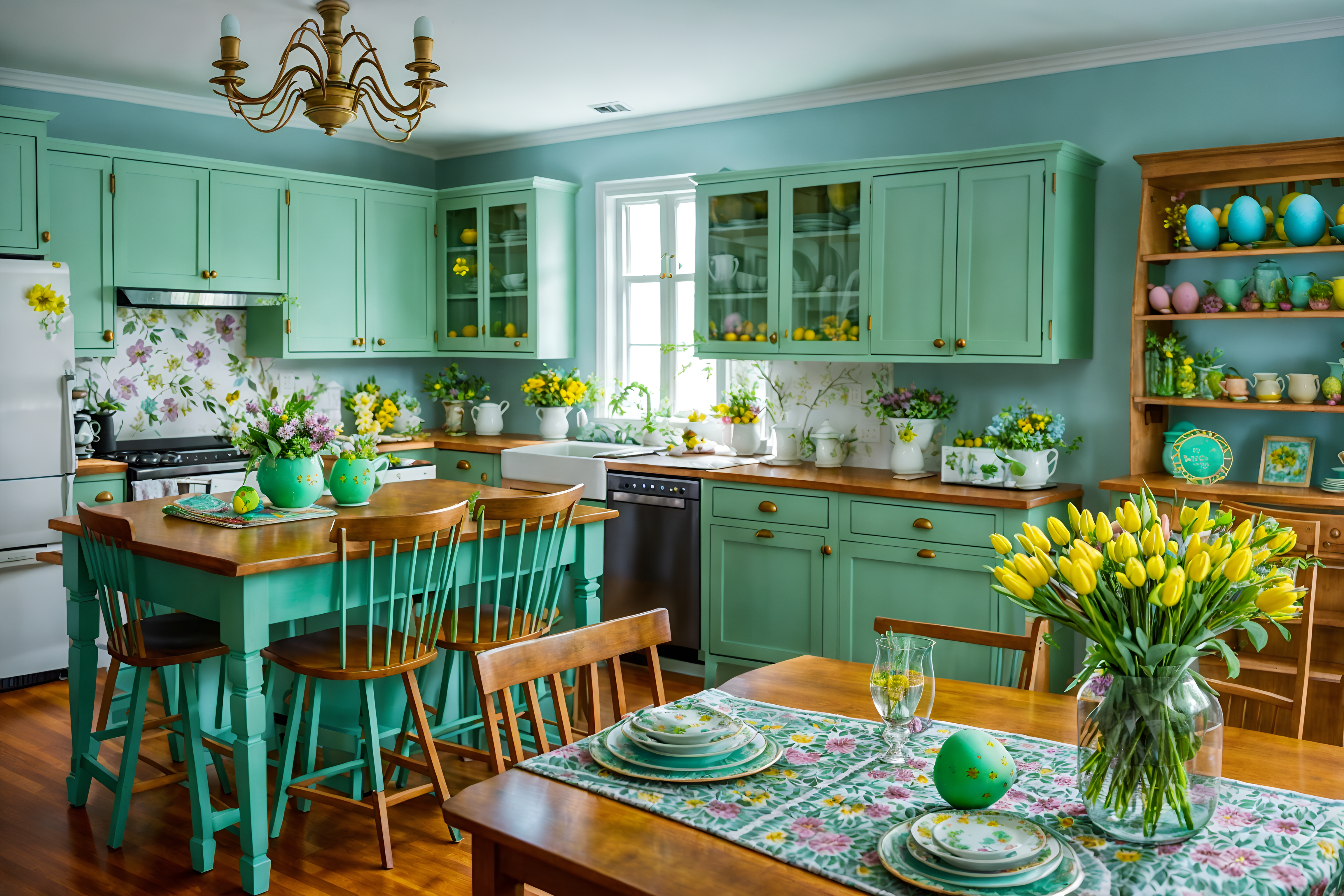 photo from pinterest of easter-style interior designed (kitchen living combo interior) with coffee tables and worktops and bookshelves and sink and stove and chairs and televisions and electric lamps. . with flowers on table and easter decorations and spring decorations and colorful easter eggs and light blue colors and flowers on table. . cinematic photo, highly detailed, cinematic lighting, ultra-detailed, ultrarealistic, photorealism, 8k. trending on pinterest. easter interior design style. masterpiece, cinematic light, ultrarealistic+, photorealistic+, 8k, raw photo, realistic, sharp focus on eyes, (symmetrical eyes), (intact eyes), hyperrealistic, highest quality, best quality, , highly detailed, masterpiece, best quality, extremely detailed 8k wallpaper, masterpiece, best quality, ultra-detailed, best shadow, detailed background, detailed face, detailed eyes, high contrast, best illumination, detailed face, dulux, caustic, dynamic angle, detailed glow. dramatic lighting. highly detailed, insanely detailed hair, symmetrical, intricate details, professionally retouched, 8k high definition. strong bokeh. award winning photo.