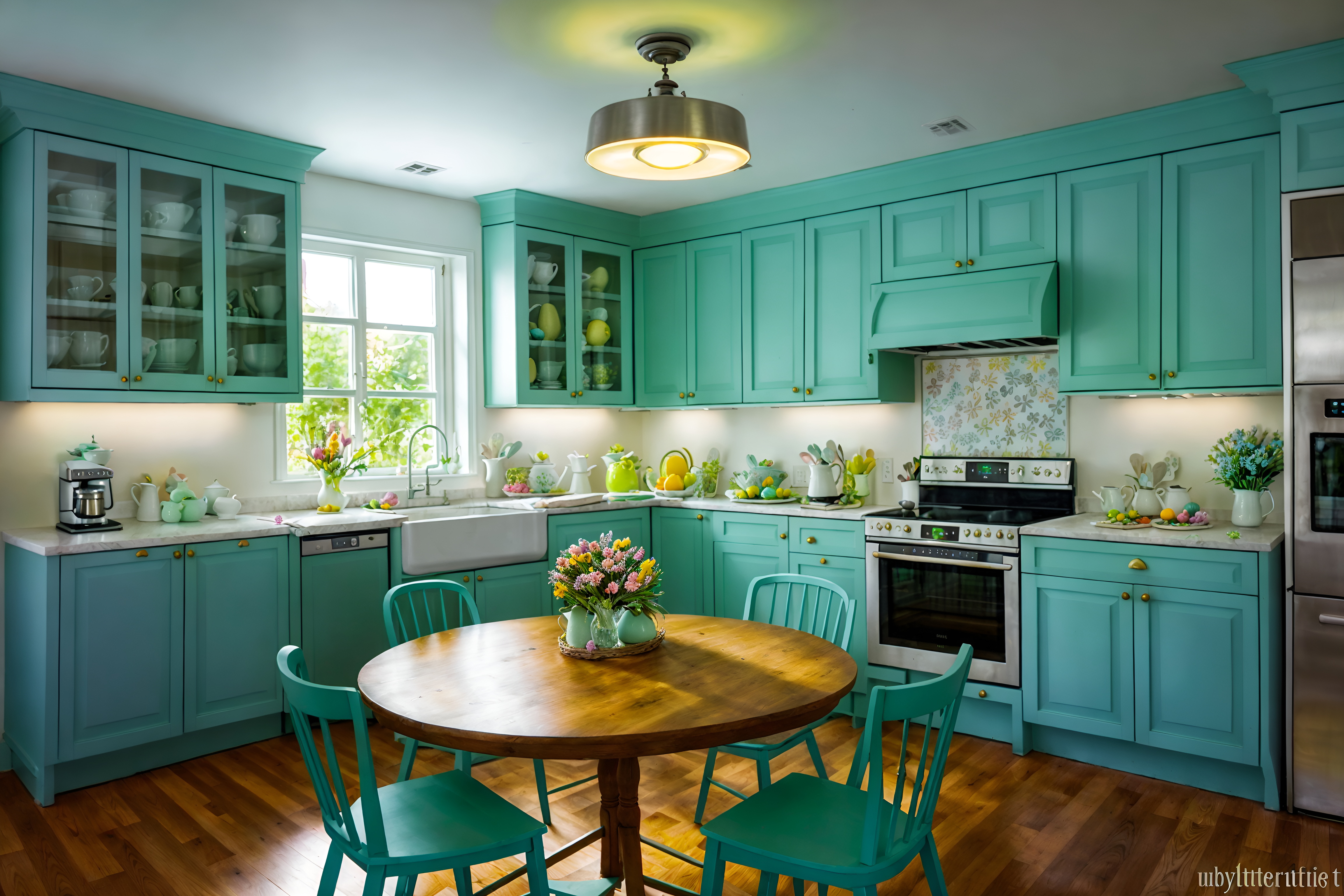 photo from pinterest of easter-style interior designed (kitchen living combo interior) with coffee tables and worktops and bookshelves and sink and stove and chairs and televisions and electric lamps. . with flowers on table and easter decorations and spring decorations and colorful easter eggs and light blue colors and flowers on table. . cinematic photo, highly detailed, cinematic lighting, ultra-detailed, ultrarealistic, photorealism, 8k. trending on pinterest. easter interior design style. masterpiece, cinematic light, ultrarealistic+, photorealistic+, 8k, raw photo, realistic, sharp focus on eyes, (symmetrical eyes), (intact eyes), hyperrealistic, highest quality, best quality, , highly detailed, masterpiece, best quality, extremely detailed 8k wallpaper, masterpiece, best quality, ultra-detailed, best shadow, detailed background, detailed face, detailed eyes, high contrast, best illumination, detailed face, dulux, caustic, dynamic angle, detailed glow. dramatic lighting. highly detailed, insanely detailed hair, symmetrical, intricate details, professionally retouched, 8k high definition. strong bokeh. award winning photo.