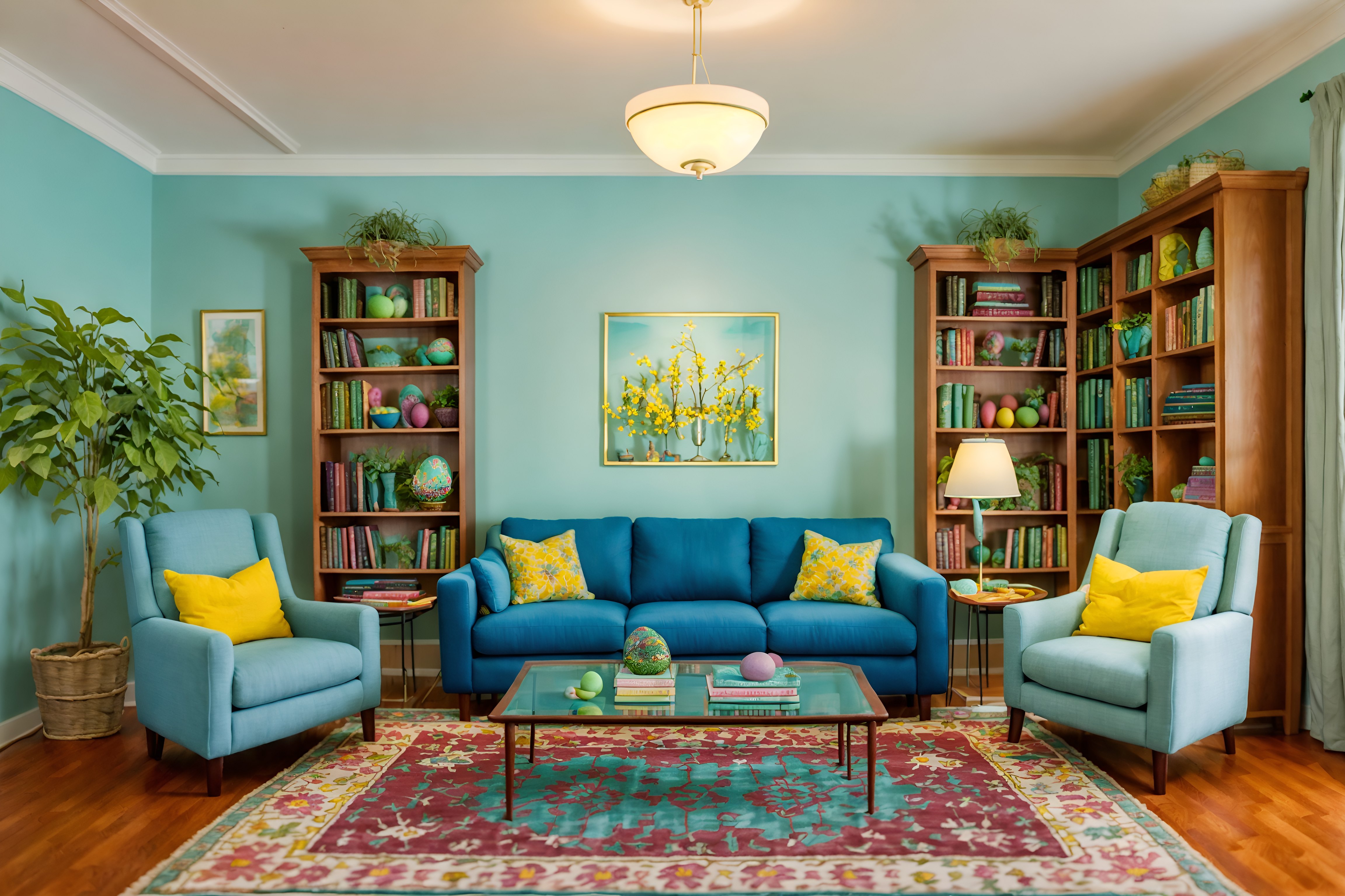 photo from pinterest of easter-style interior designed (living room interior) with rug and bookshelves and plant and televisions and furniture and chairs and electric lamps and occasional tables. . with colorful easter eggs and flowers on table and spring decorations and easter decorations and light blue colors and colorful easter eggs. . cinematic photo, highly detailed, cinematic lighting, ultra-detailed, ultrarealistic, photorealism, 8k. trending on pinterest. easter interior design style. masterpiece, cinematic light, ultrarealistic+, photorealistic+, 8k, raw photo, realistic, sharp focus on eyes, (symmetrical eyes), (intact eyes), hyperrealistic, highest quality, best quality, , highly detailed, masterpiece, best quality, extremely detailed 8k wallpaper, masterpiece, best quality, ultra-detailed, best shadow, detailed background, detailed face, detailed eyes, high contrast, best illumination, detailed face, dulux, caustic, dynamic angle, detailed glow. dramatic lighting. highly detailed, insanely detailed hair, symmetrical, intricate details, professionally retouched, 8k high definition. strong bokeh. award winning photo.