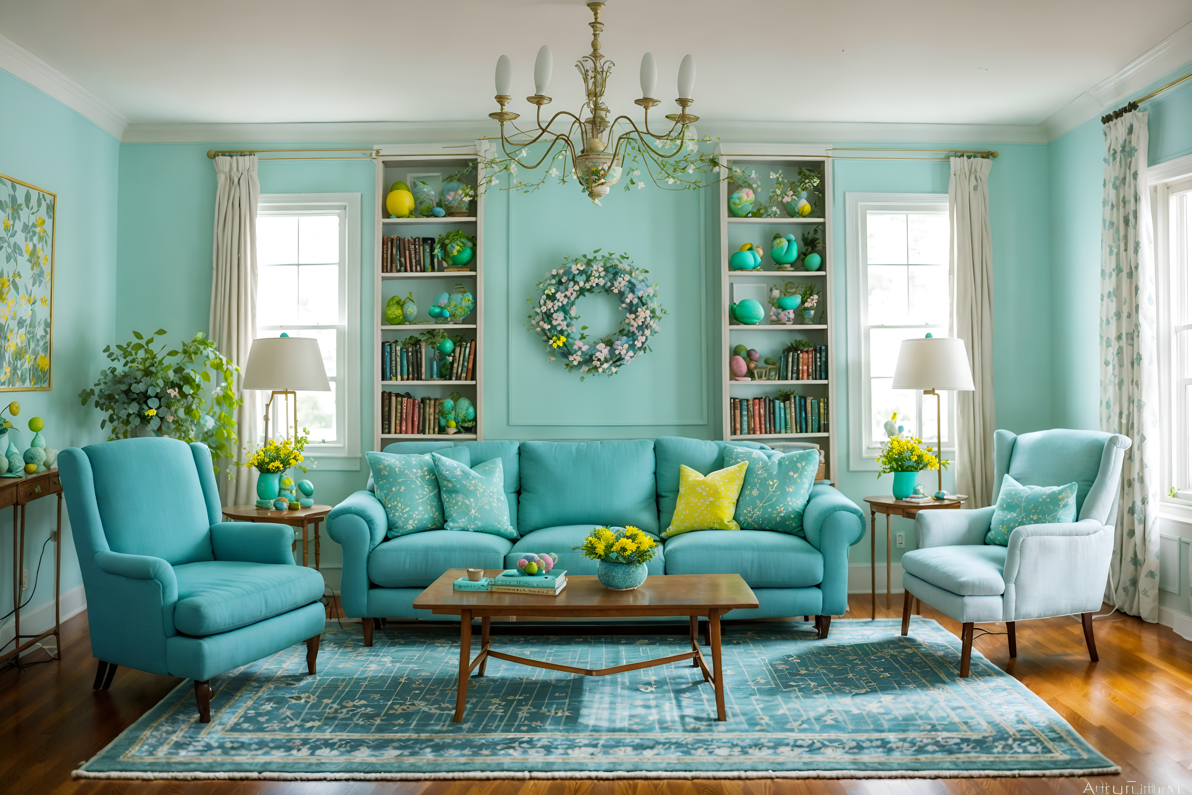 easter living roomsinterior decorate this living room with easter style. . . with furniture and sofa and bookshelves and coffee tables and electric lamps and plant and televisions and chairs. . with easter decorations and flowers on table and light blue colors and colorful easter eggs and spring decorations and easter decorations. . .