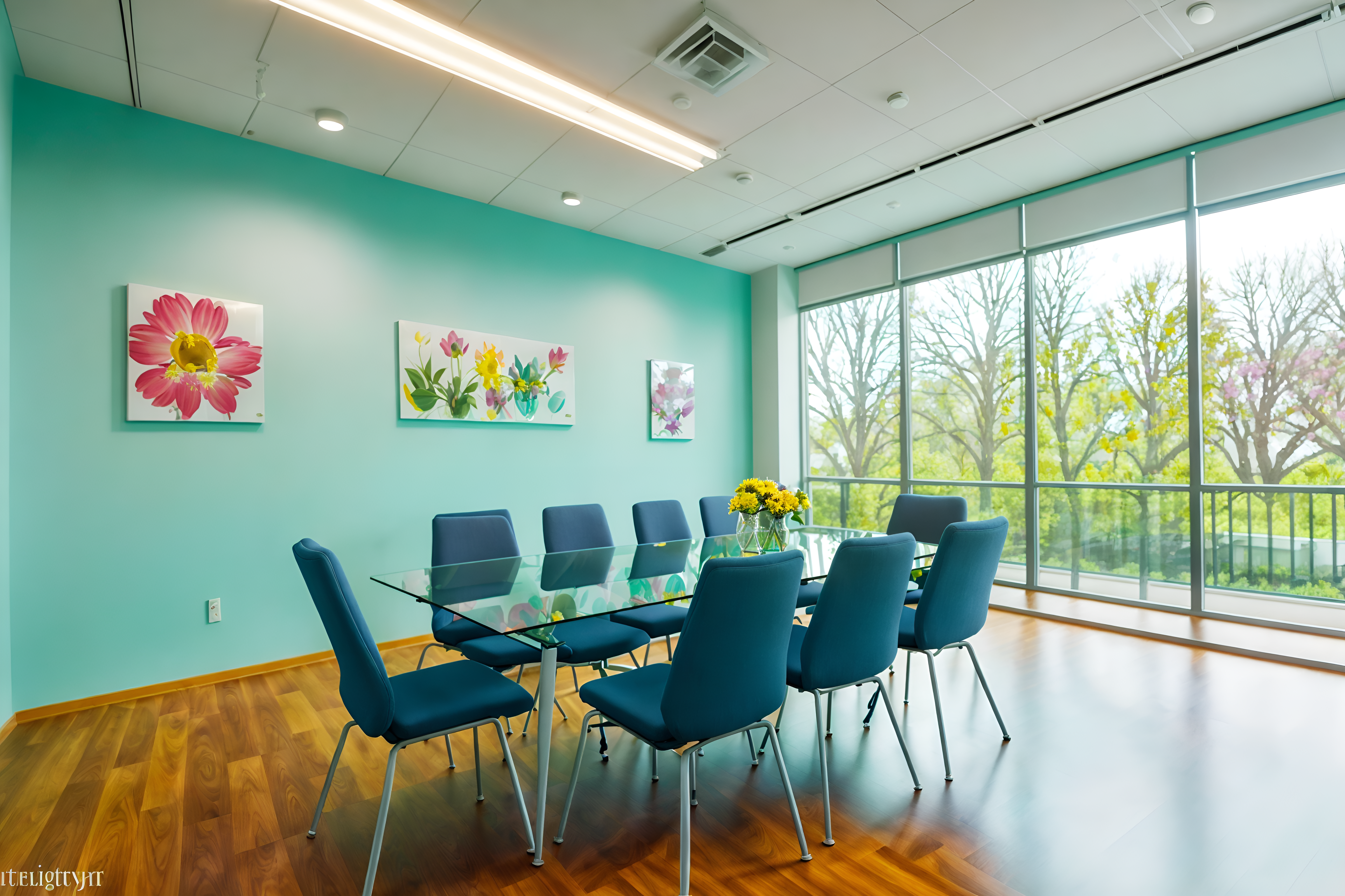 photo from pinterest of easter-style interior designed (meeting room interior) with cabinets and boardroom table and painting or photo on wall and office chairs and vase and plant and glass walls and glass doors. . with spring decorations and flowers on table and colorful easter eggs and easter decorations and light blue colors and spring decorations. . cinematic photo, highly detailed, cinematic lighting, ultra-detailed, ultrarealistic, photorealism, 8k. trending on pinterest. easter interior design style. masterpiece, cinematic light, ultrarealistic+, photorealistic+, 8k, raw photo, realistic, sharp focus on eyes, (symmetrical eyes), (intact eyes), hyperrealistic, highest quality, best quality, , highly detailed, masterpiece, best quality, extremely detailed 8k wallpaper, masterpiece, best quality, ultra-detailed, best shadow, detailed background, detailed face, detailed eyes, high contrast, best illumination, detailed face, dulux, caustic, dynamic angle, detailed glow. dramatic lighting. highly detailed, insanely detailed hair, symmetrical, intricate details, professionally retouched, 8k high definition. strong bokeh. award winning photo.