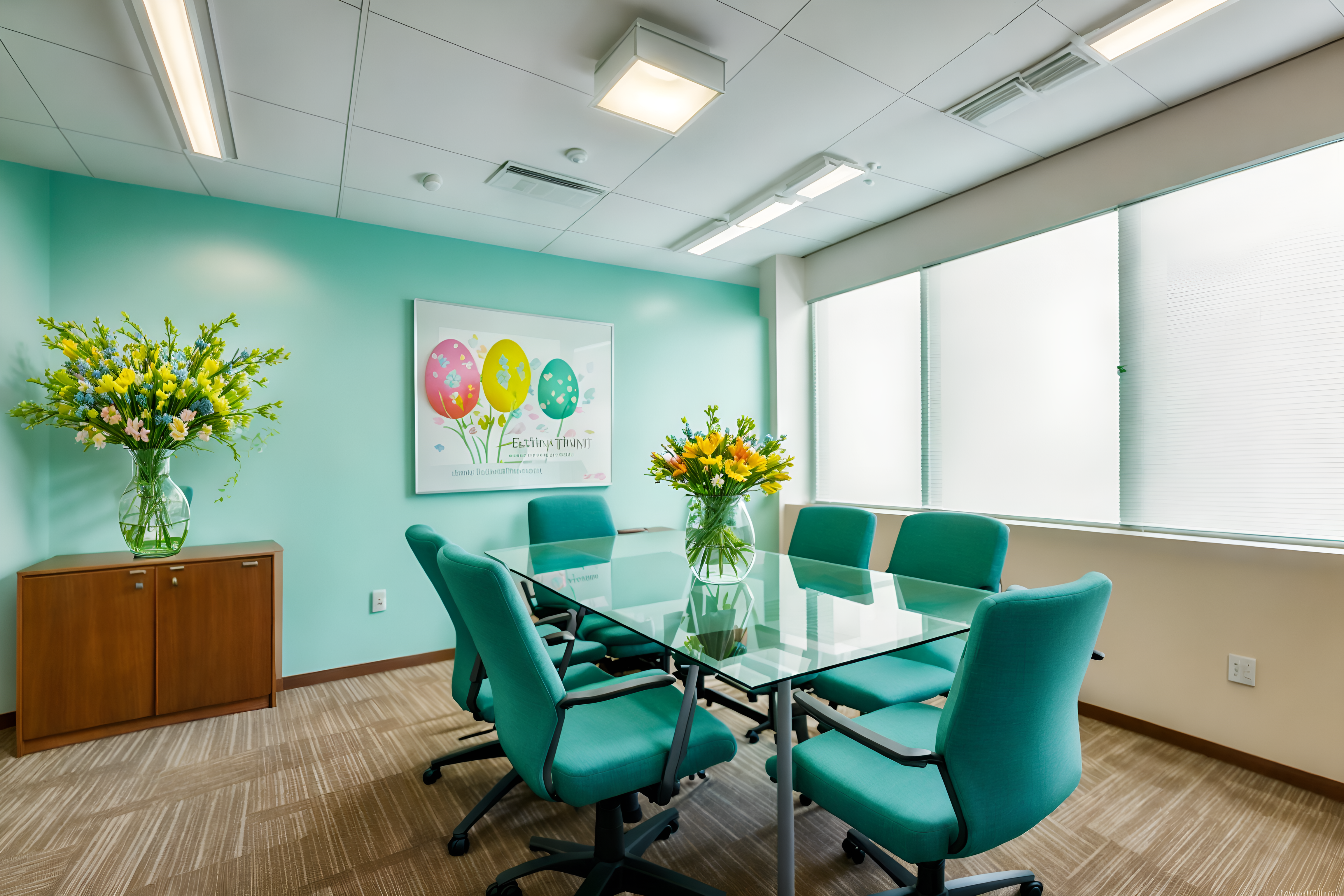 photo from pinterest of easter-style interior designed (meeting room interior) with cabinets and boardroom table and painting or photo on wall and office chairs and vase and plant and glass walls and glass doors. . with spring decorations and flowers on table and colorful easter eggs and easter decorations and light blue colors and spring decorations. . cinematic photo, highly detailed, cinematic lighting, ultra-detailed, ultrarealistic, photorealism, 8k. trending on pinterest. easter interior design style. masterpiece, cinematic light, ultrarealistic+, photorealistic+, 8k, raw photo, realistic, sharp focus on eyes, (symmetrical eyes), (intact eyes), hyperrealistic, highest quality, best quality, , highly detailed, masterpiece, best quality, extremely detailed 8k wallpaper, masterpiece, best quality, ultra-detailed, best shadow, detailed background, detailed face, detailed eyes, high contrast, best illumination, detailed face, dulux, caustic, dynamic angle, detailed glow. dramatic lighting. highly detailed, insanely detailed hair, symmetrical, intricate details, professionally retouched, 8k high definition. strong bokeh. award winning photo.