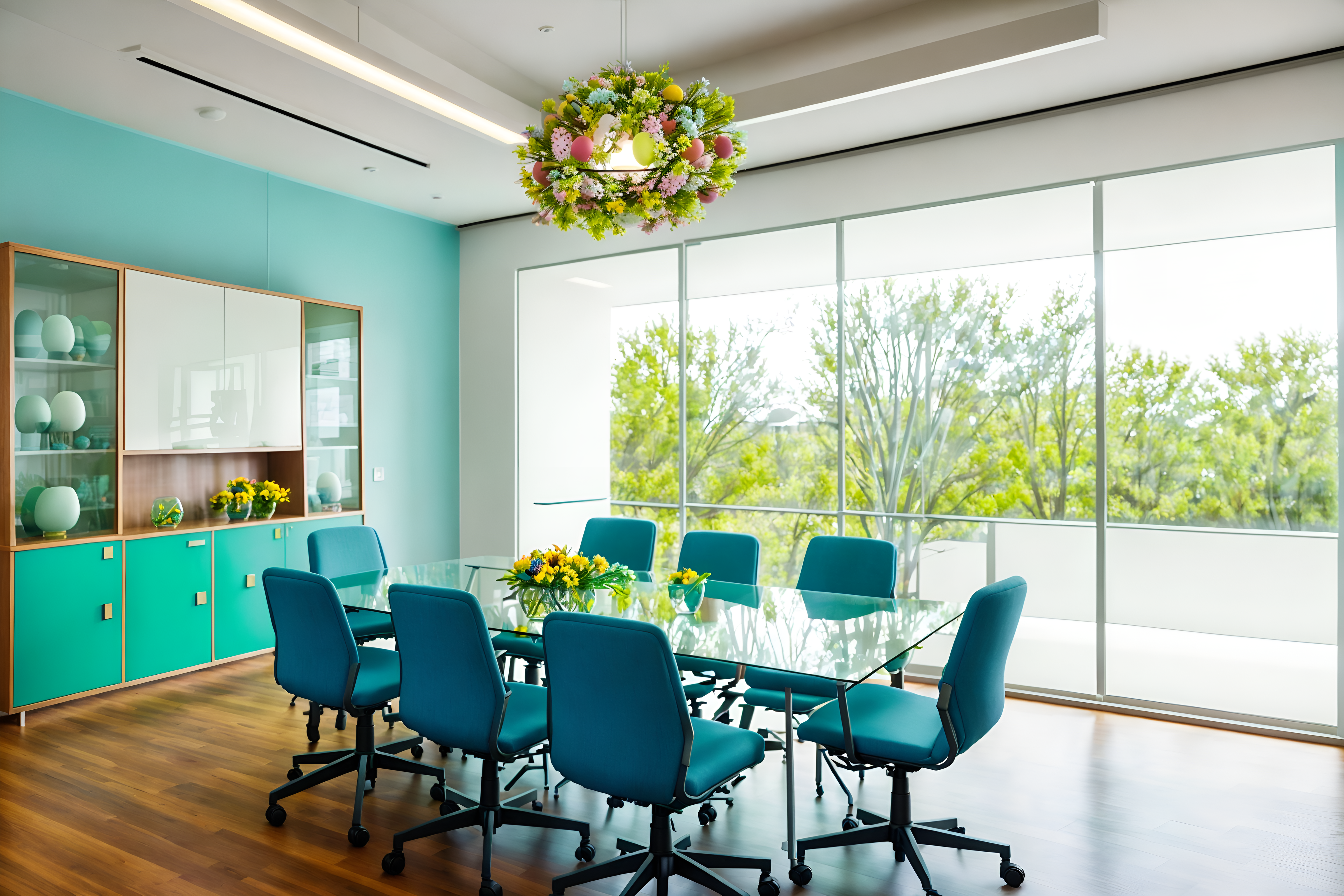 photo from pinterest of easter-style interior designed (meeting room interior) with cabinets and boardroom table and painting or photo on wall and office chairs and vase and plant and glass walls and glass doors. . with spring decorations and flowers on table and colorful easter eggs and easter decorations and light blue colors and spring decorations. . cinematic photo, highly detailed, cinematic lighting, ultra-detailed, ultrarealistic, photorealism, 8k. trending on pinterest. easter interior design style. masterpiece, cinematic light, ultrarealistic+, photorealistic+, 8k, raw photo, realistic, sharp focus on eyes, (symmetrical eyes), (intact eyes), hyperrealistic, highest quality, best quality, , highly detailed, masterpiece, best quality, extremely detailed 8k wallpaper, masterpiece, best quality, ultra-detailed, best shadow, detailed background, detailed face, detailed eyes, high contrast, best illumination, detailed face, dulux, caustic, dynamic angle, detailed glow. dramatic lighting. highly detailed, insanely detailed hair, symmetrical, intricate details, professionally retouched, 8k high definition. strong bokeh. award winning photo.