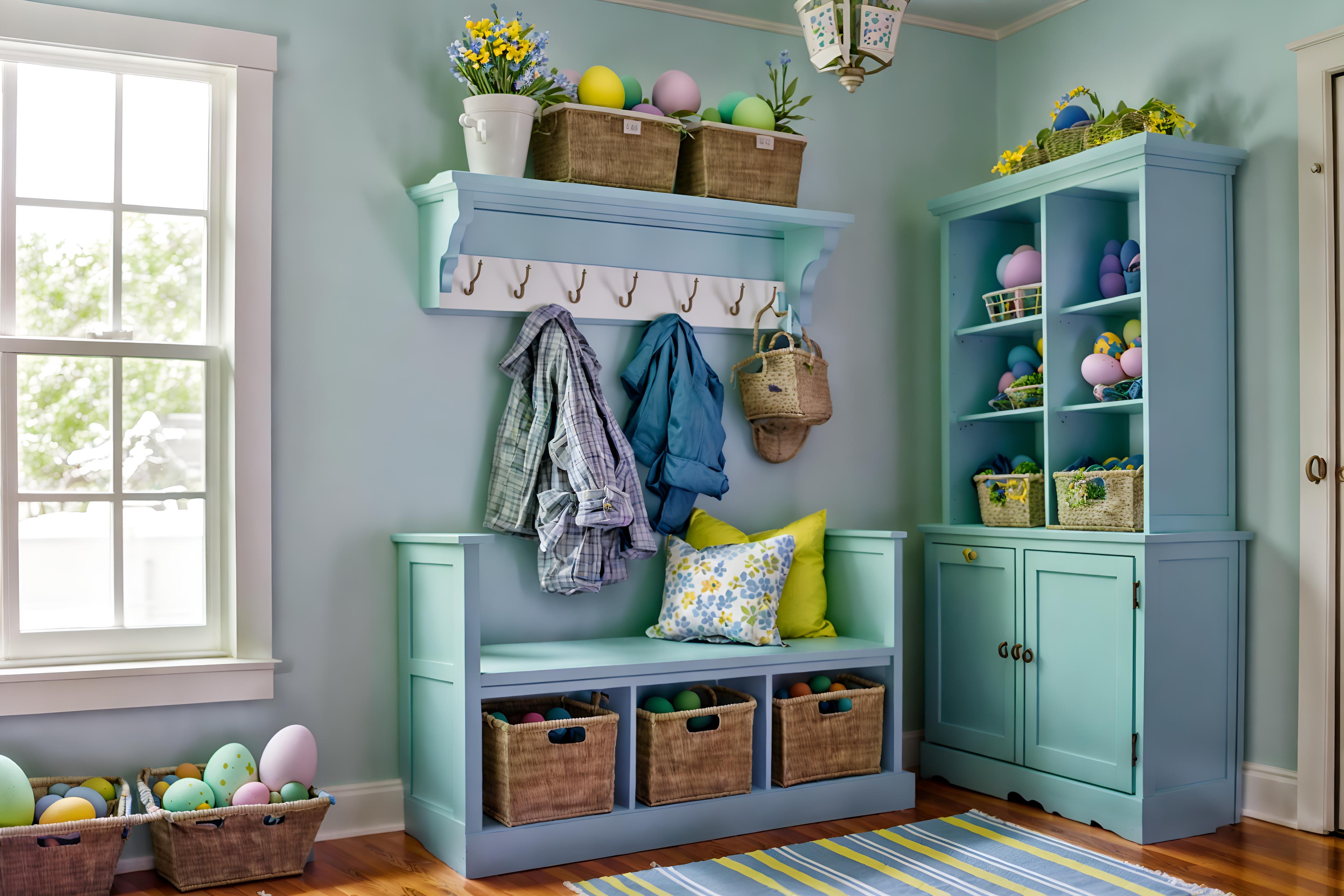 photo from pinterest of easter-style interior designed (mudroom interior) with a bench and cubbies and storage drawers and wall hooks for coats and cabinets and shelves for shoes and storage baskets and high up storage. . with spring decorations and light blue colors and colorful easter eggs and flowers on table and easter decorations and spring decorations. . cinematic photo, highly detailed, cinematic lighting, ultra-detailed, ultrarealistic, photorealism, 8k. trending on pinterest. easter interior design style. masterpiece, cinematic light, ultrarealistic+, photorealistic+, 8k, raw photo, realistic, sharp focus on eyes, (symmetrical eyes), (intact eyes), hyperrealistic, highest quality, best quality, , highly detailed, masterpiece, best quality, extremely detailed 8k wallpaper, masterpiece, best quality, ultra-detailed, best shadow, detailed background, detailed face, detailed eyes, high contrast, best illumination, detailed face, dulux, caustic, dynamic angle, detailed glow. dramatic lighting. highly detailed, insanely detailed hair, symmetrical, intricate details, professionally retouched, 8k high definition. strong bokeh. award winning photo.