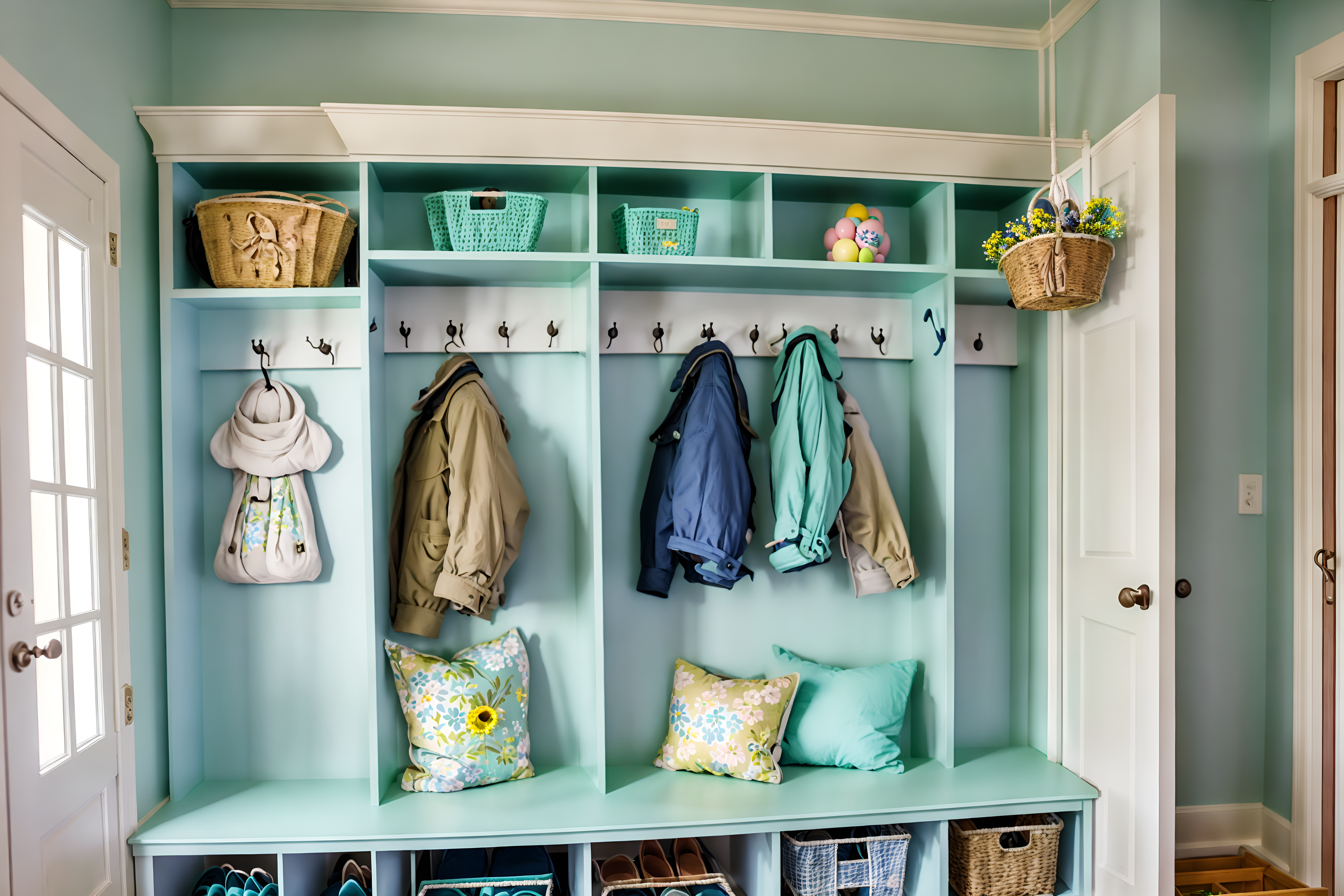 easter mudroomsinterior decorate this mudroom with easter style. . . with a bench and cabinets and storage baskets and wall hooks for coats and storage drawers and shelves for shoes and high up storage and cubbies. . with light blue colors and easter decorations and flowers on table and colorful easter eggs and spring decorations and light blue colors. . .