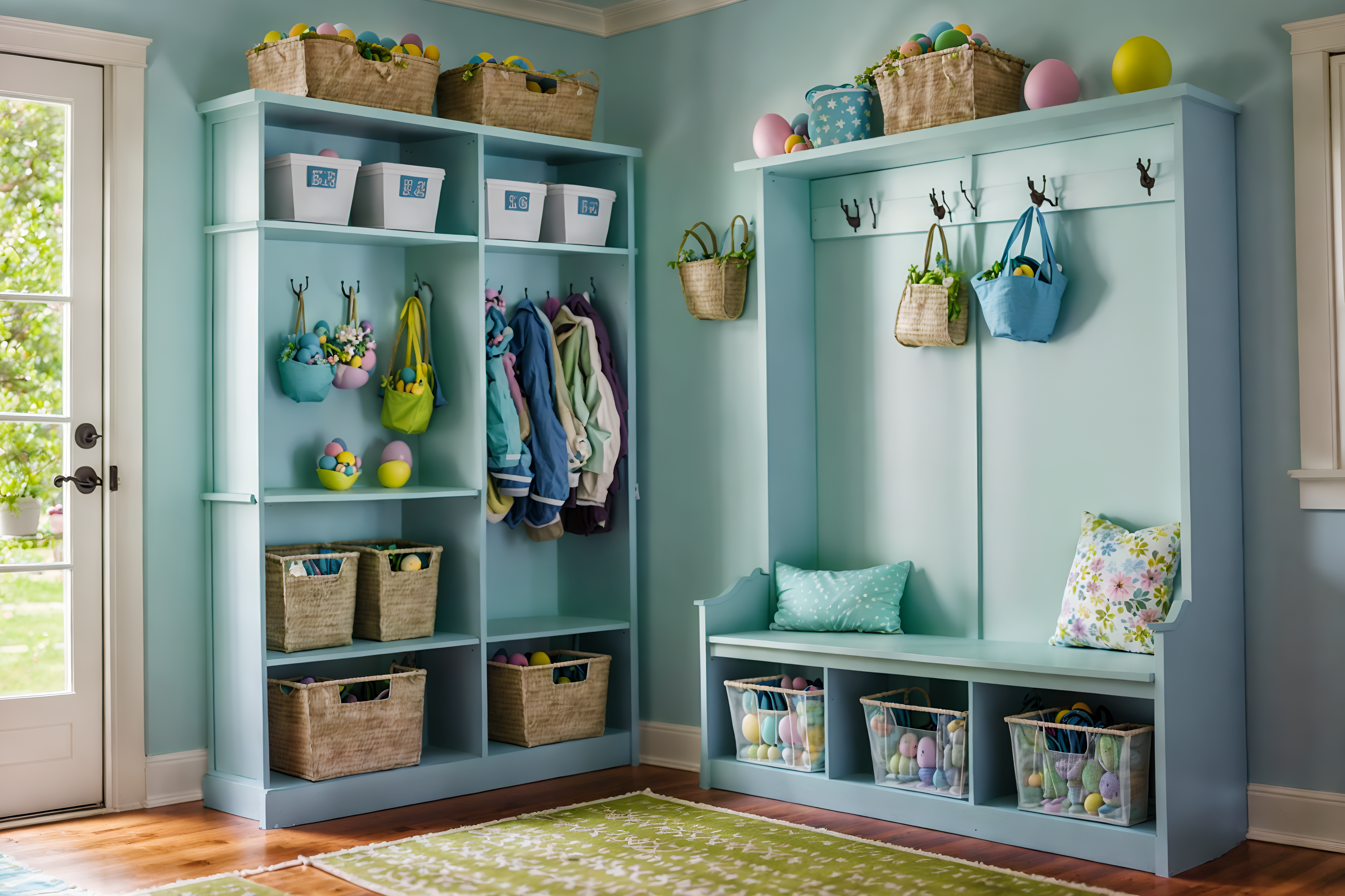 photo from pinterest of easter-style interior designed (mudroom interior) with a bench and cubbies and storage drawers and wall hooks for coats and cabinets and shelves for shoes and storage baskets and high up storage. . with spring decorations and light blue colors and colorful easter eggs and flowers on table and easter decorations and spring decorations. . cinematic photo, highly detailed, cinematic lighting, ultra-detailed, ultrarealistic, photorealism, 8k. trending on pinterest. easter interior design style. masterpiece, cinematic light, ultrarealistic+, photorealistic+, 8k, raw photo, realistic, sharp focus on eyes, (symmetrical eyes), (intact eyes), hyperrealistic, highest quality, best quality, , highly detailed, masterpiece, best quality, extremely detailed 8k wallpaper, masterpiece, best quality, ultra-detailed, best shadow, detailed background, detailed face, detailed eyes, high contrast, best illumination, detailed face, dulux, caustic, dynamic angle, detailed glow. dramatic lighting. highly detailed, insanely detailed hair, symmetrical, intricate details, professionally retouched, 8k high definition. strong bokeh. award winning photo.