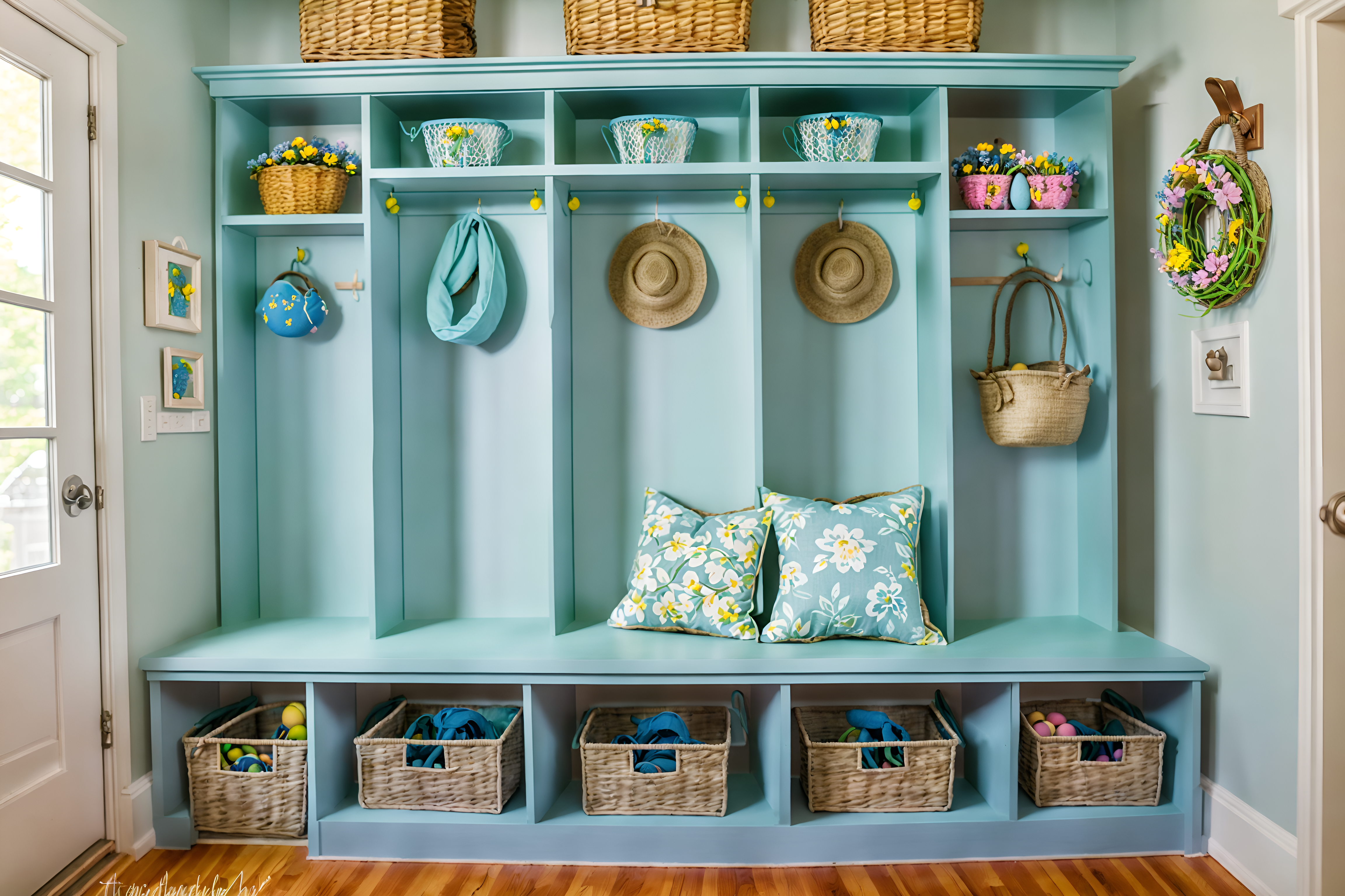 easter mudroomsinterior decorate this mudroom with easter style. . . with a bench and cabinets and storage baskets and wall hooks for coats and storage drawers and shelves for shoes and high up storage and cubbies. . with light blue colors and easter decorations and flowers on table and colorful easter eggs and spring decorations and light blue colors. . .