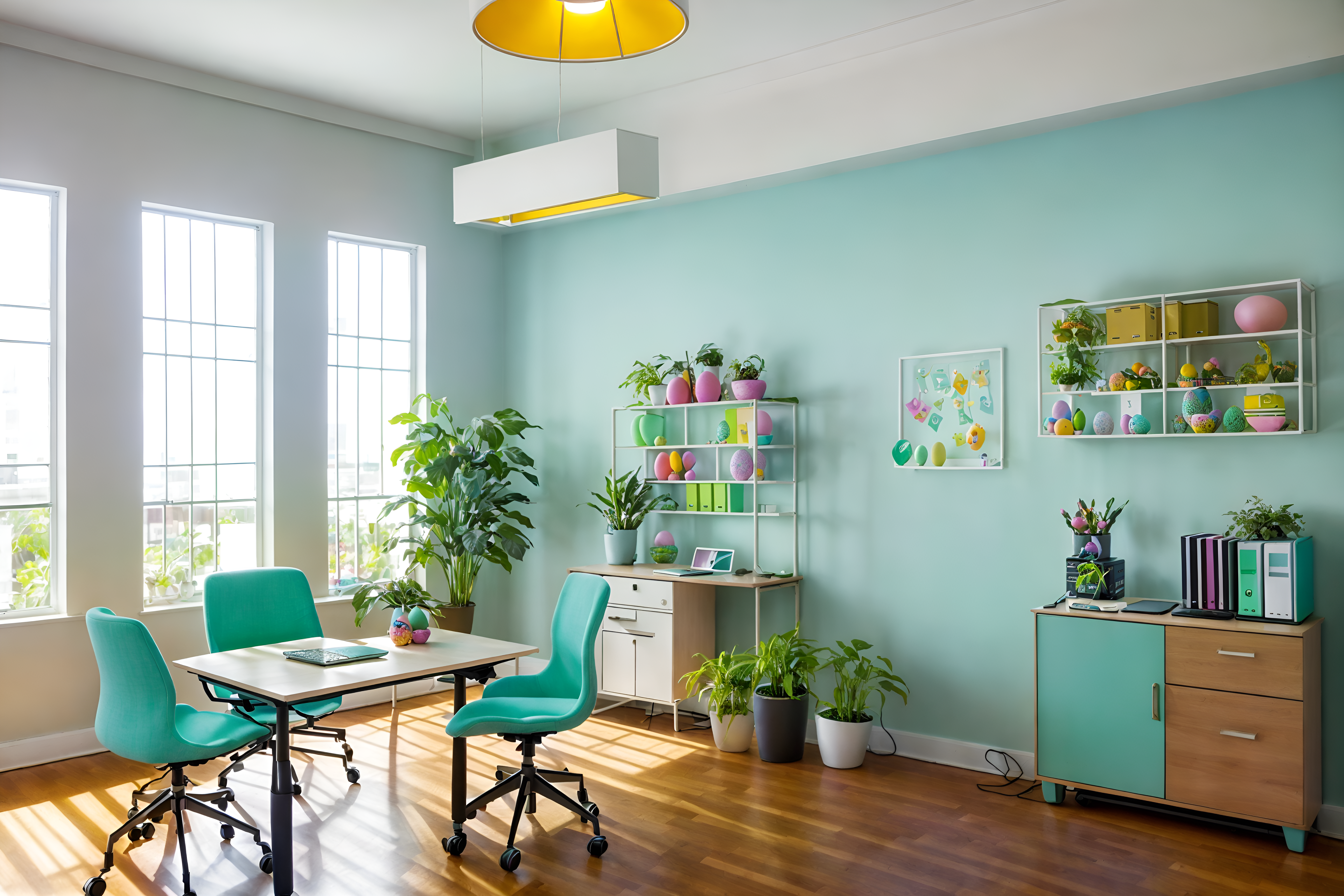 photo from pinterest of easter-style interior designed (office interior) with plants and computer desks and office chairs and office desks and lounge chairs and cabinets and desk lamps and windows. . with colorful easter eggs and light blue colors and spring decorations and easter decorations and flowers on table and colorful easter eggs. . cinematic photo, highly detailed, cinematic lighting, ultra-detailed, ultrarealistic, photorealism, 8k. trending on pinterest. easter interior design style. masterpiece, cinematic light, ultrarealistic+, photorealistic+, 8k, raw photo, realistic, sharp focus on eyes, (symmetrical eyes), (intact eyes), hyperrealistic, highest quality, best quality, , highly detailed, masterpiece, best quality, extremely detailed 8k wallpaper, masterpiece, best quality, ultra-detailed, best shadow, detailed background, detailed face, detailed eyes, high contrast, best illumination, detailed face, dulux, caustic, dynamic angle, detailed glow. dramatic lighting. highly detailed, insanely detailed hair, symmetrical, intricate details, professionally retouched, 8k high definition. strong bokeh. award winning photo.