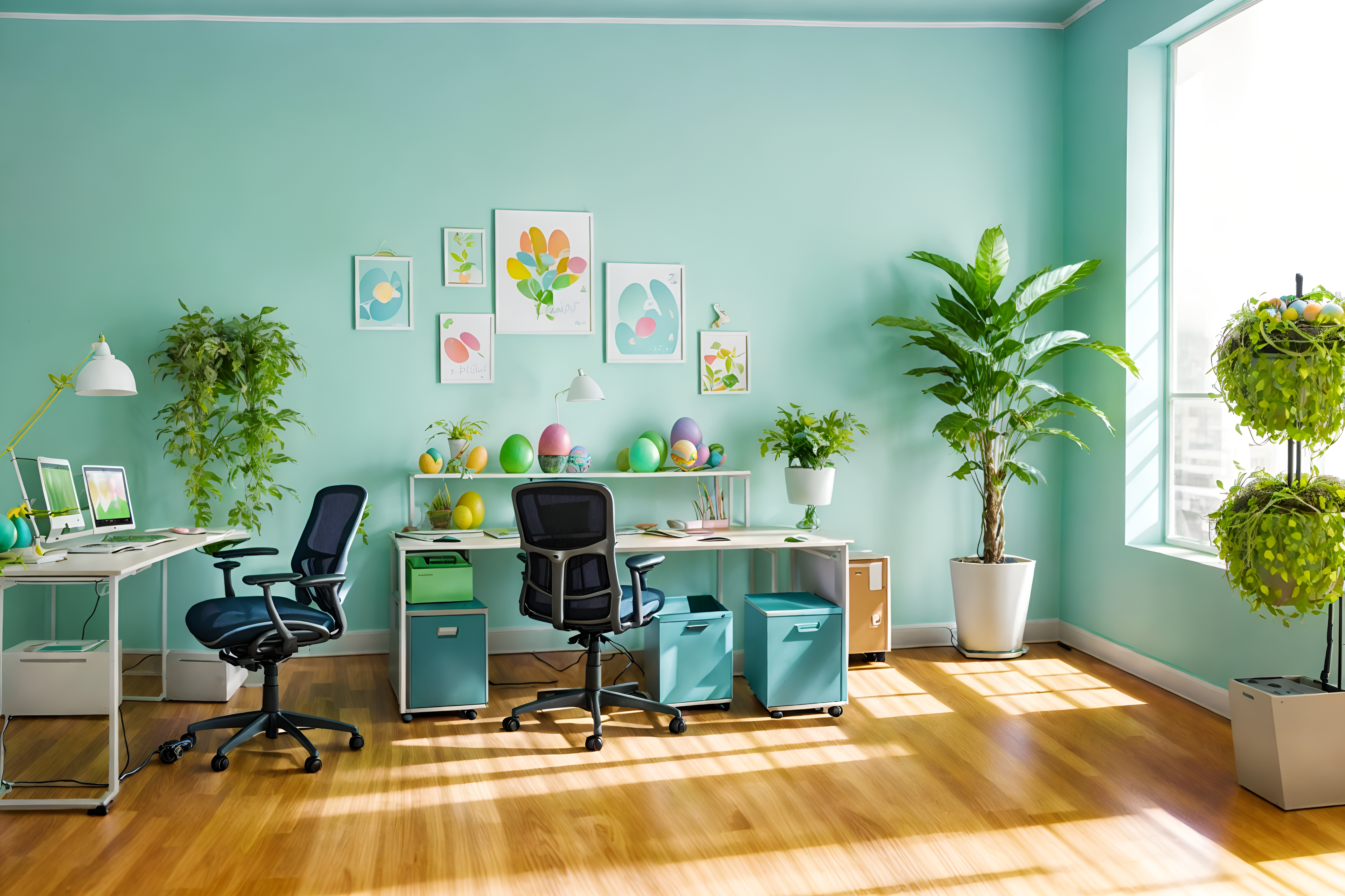 easter officesinterior decorate this office with easter style. . . with windows and desk lamps and plants and office desks and computer desks and lounge chairs and office chairs and cabinets. . with light blue colors and spring decorations and flowers on table and easter decorations and colorful easter eggs and light blue colors. . .