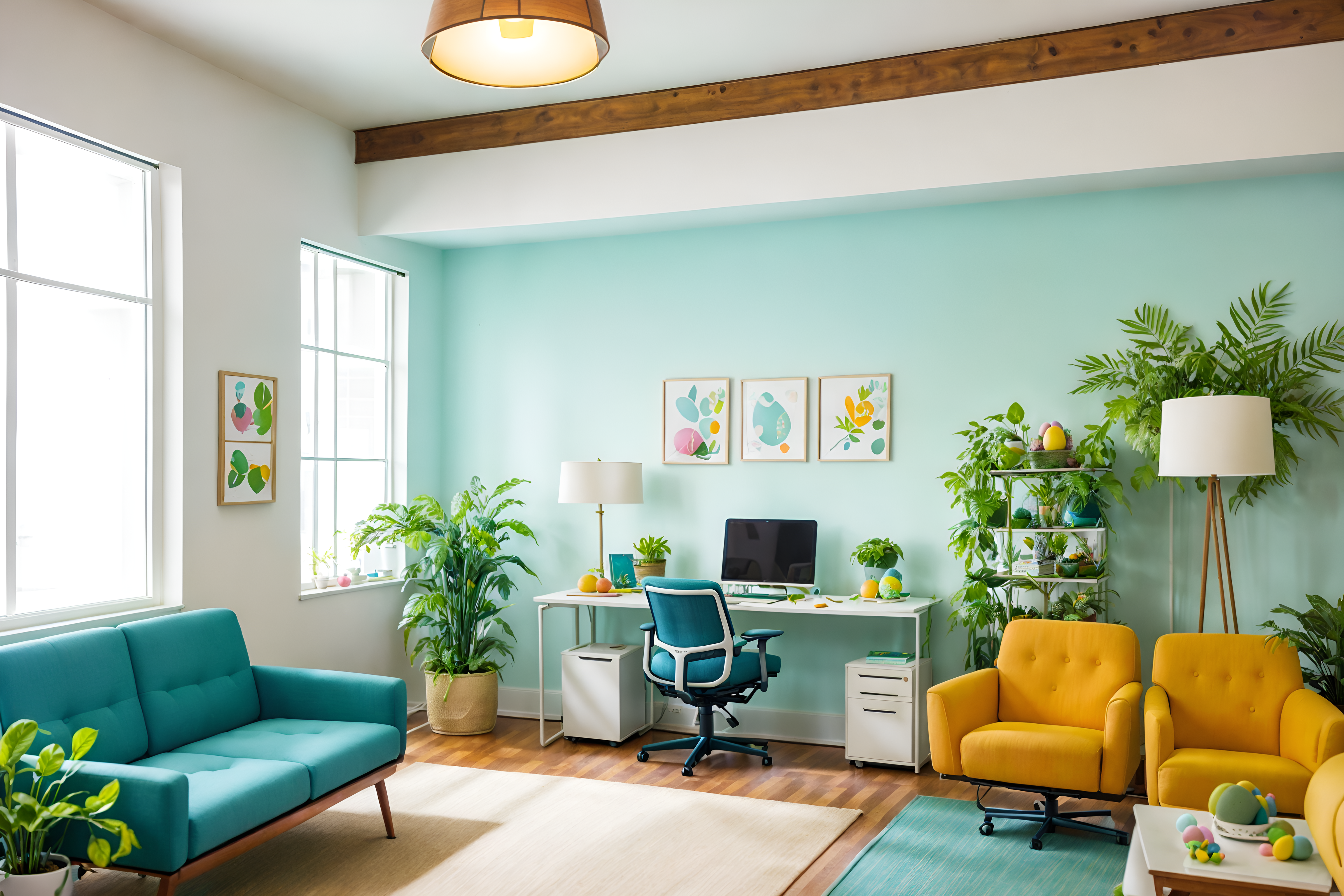 photo from pinterest of easter-style interior designed (office interior) with plants and lounge chairs and desk lamps and windows and cabinets and seating area with sofa and office chairs and office desks. . with spring decorations and light blue colors and easter decorations and colorful easter eggs and flowers on table and spring decorations. . cinematic photo, highly detailed, cinematic lighting, ultra-detailed, ultrarealistic, photorealism, 8k. trending on pinterest. easter interior design style. masterpiece, cinematic light, ultrarealistic+, photorealistic+, 8k, raw photo, realistic, sharp focus on eyes, (symmetrical eyes), (intact eyes), hyperrealistic, highest quality, best quality, , highly detailed, masterpiece, best quality, extremely detailed 8k wallpaper, masterpiece, best quality, ultra-detailed, best shadow, detailed background, detailed face, detailed eyes, high contrast, best illumination, detailed face, dulux, caustic, dynamic angle, detailed glow. dramatic lighting. highly detailed, insanely detailed hair, symmetrical, intricate details, professionally retouched, 8k high definition. strong bokeh. award winning photo.