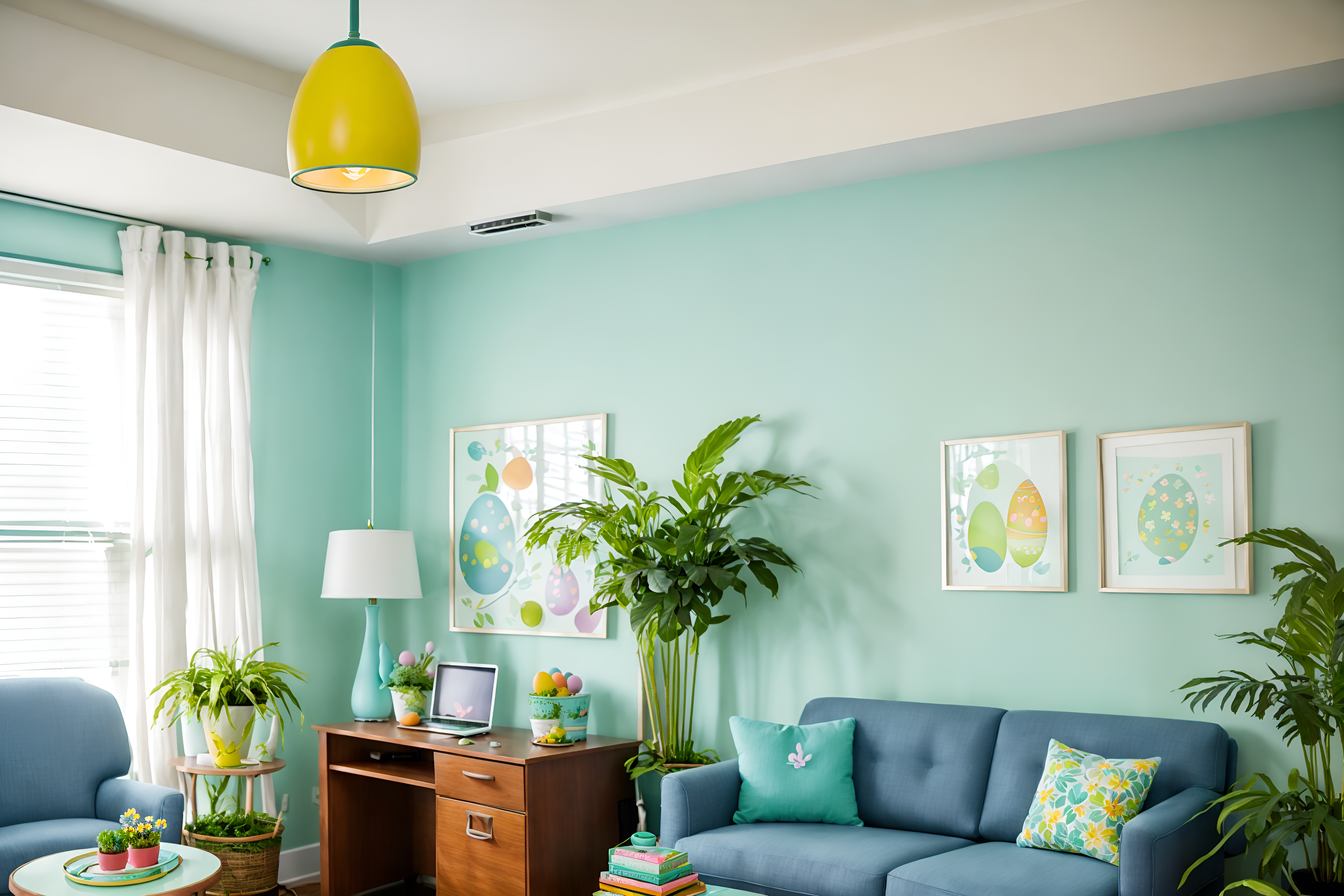 photo from pinterest of easter-style interior designed (office interior) with plants and lounge chairs and desk lamps and windows and cabinets and seating area with sofa and office chairs and office desks. . with spring decorations and light blue colors and easter decorations and colorful easter eggs and flowers on table and spring decorations. . cinematic photo, highly detailed, cinematic lighting, ultra-detailed, ultrarealistic, photorealism, 8k. trending on pinterest. easter interior design style. masterpiece, cinematic light, ultrarealistic+, photorealistic+, 8k, raw photo, realistic, sharp focus on eyes, (symmetrical eyes), (intact eyes), hyperrealistic, highest quality, best quality, , highly detailed, masterpiece, best quality, extremely detailed 8k wallpaper, masterpiece, best quality, ultra-detailed, best shadow, detailed background, detailed face, detailed eyes, high contrast, best illumination, detailed face, dulux, caustic, dynamic angle, detailed glow. dramatic lighting. highly detailed, insanely detailed hair, symmetrical, intricate details, professionally retouched, 8k high definition. strong bokeh. award winning photo.