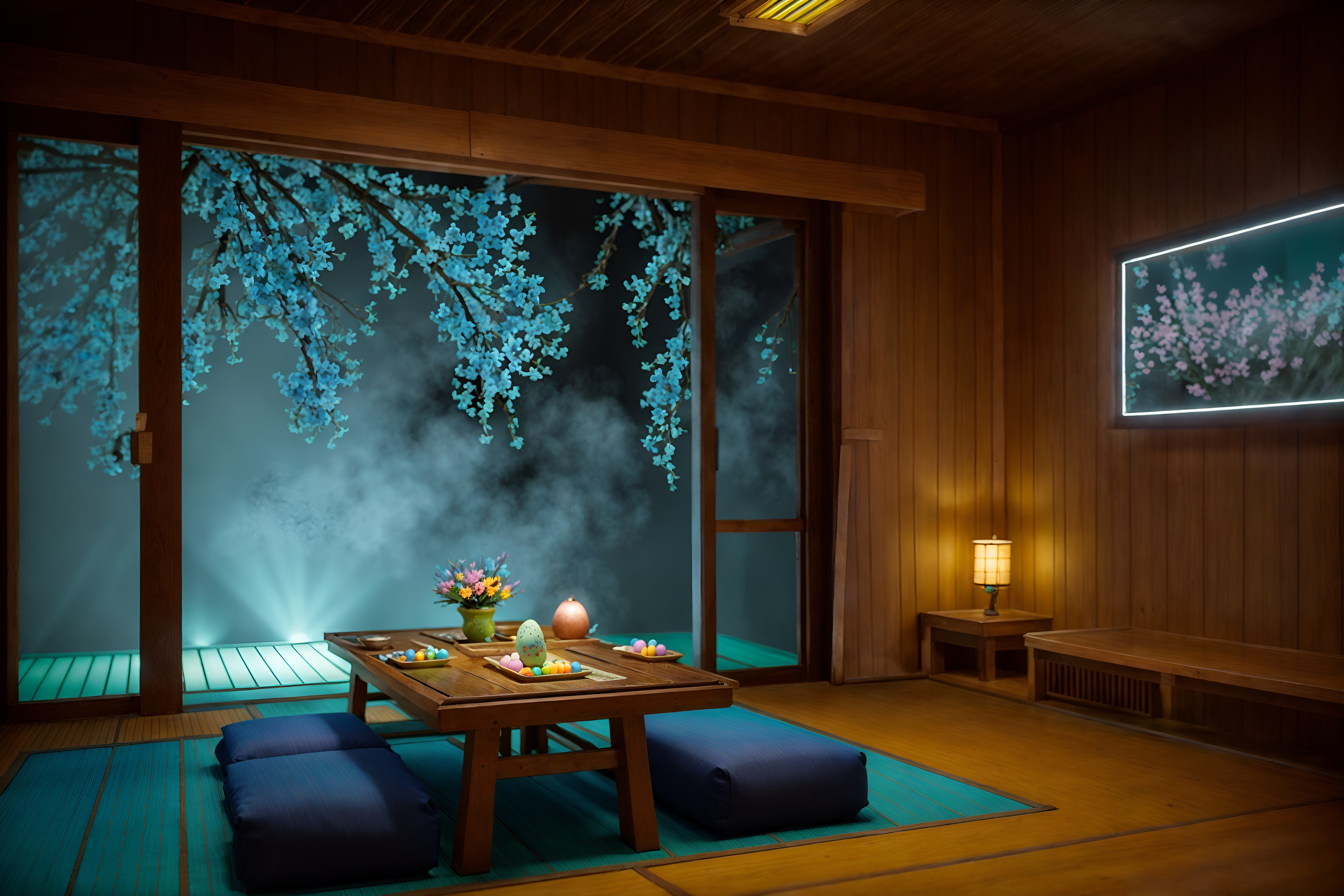photo from pinterest of easter-style interior designed (onsen interior) . with colorful easter eggs and flowers on table and easter decorations and light blue colors and spring decorations and colorful easter eggs. . cinematic photo, highly detailed, cinematic lighting, ultra-detailed, ultrarealistic, photorealism, 8k. trending on pinterest. easter interior design style. masterpiece, cinematic light, ultrarealistic+, photorealistic+, 8k, raw photo, realistic, sharp focus on eyes, (symmetrical eyes), (intact eyes), hyperrealistic, highest quality, best quality, , highly detailed, masterpiece, best quality, extremely detailed 8k wallpaper, masterpiece, best quality, ultra-detailed, best shadow, detailed background, detailed face, detailed eyes, high contrast, best illumination, detailed face, dulux, caustic, dynamic angle, detailed glow. dramatic lighting. highly detailed, insanely detailed hair, symmetrical, intricate details, professionally retouched, 8k high definition. strong bokeh. award winning photo.