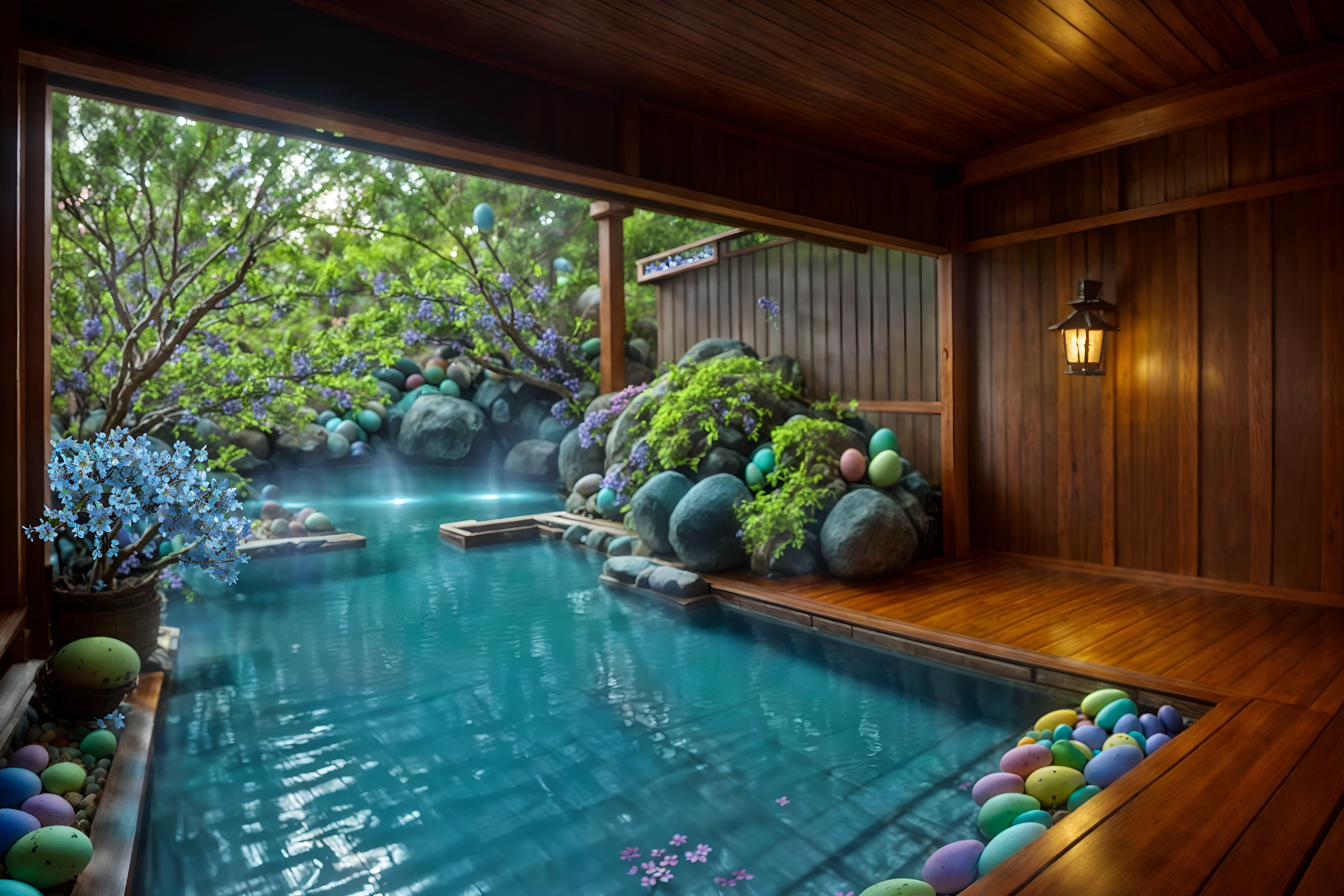 photo from pinterest of easter-style interior designed (onsen interior) . with colorful easter eggs and flowers on table and easter decorations and light blue colors and spring decorations and colorful easter eggs. . cinematic photo, highly detailed, cinematic lighting, ultra-detailed, ultrarealistic, photorealism, 8k. trending on pinterest. easter interior design style. masterpiece, cinematic light, ultrarealistic+, photorealistic+, 8k, raw photo, realistic, sharp focus on eyes, (symmetrical eyes), (intact eyes), hyperrealistic, highest quality, best quality, , highly detailed, masterpiece, best quality, extremely detailed 8k wallpaper, masterpiece, best quality, ultra-detailed, best shadow, detailed background, detailed face, detailed eyes, high contrast, best illumination, detailed face, dulux, caustic, dynamic angle, detailed glow. dramatic lighting. highly detailed, insanely detailed hair, symmetrical, intricate details, professionally retouched, 8k high definition. strong bokeh. award winning photo.