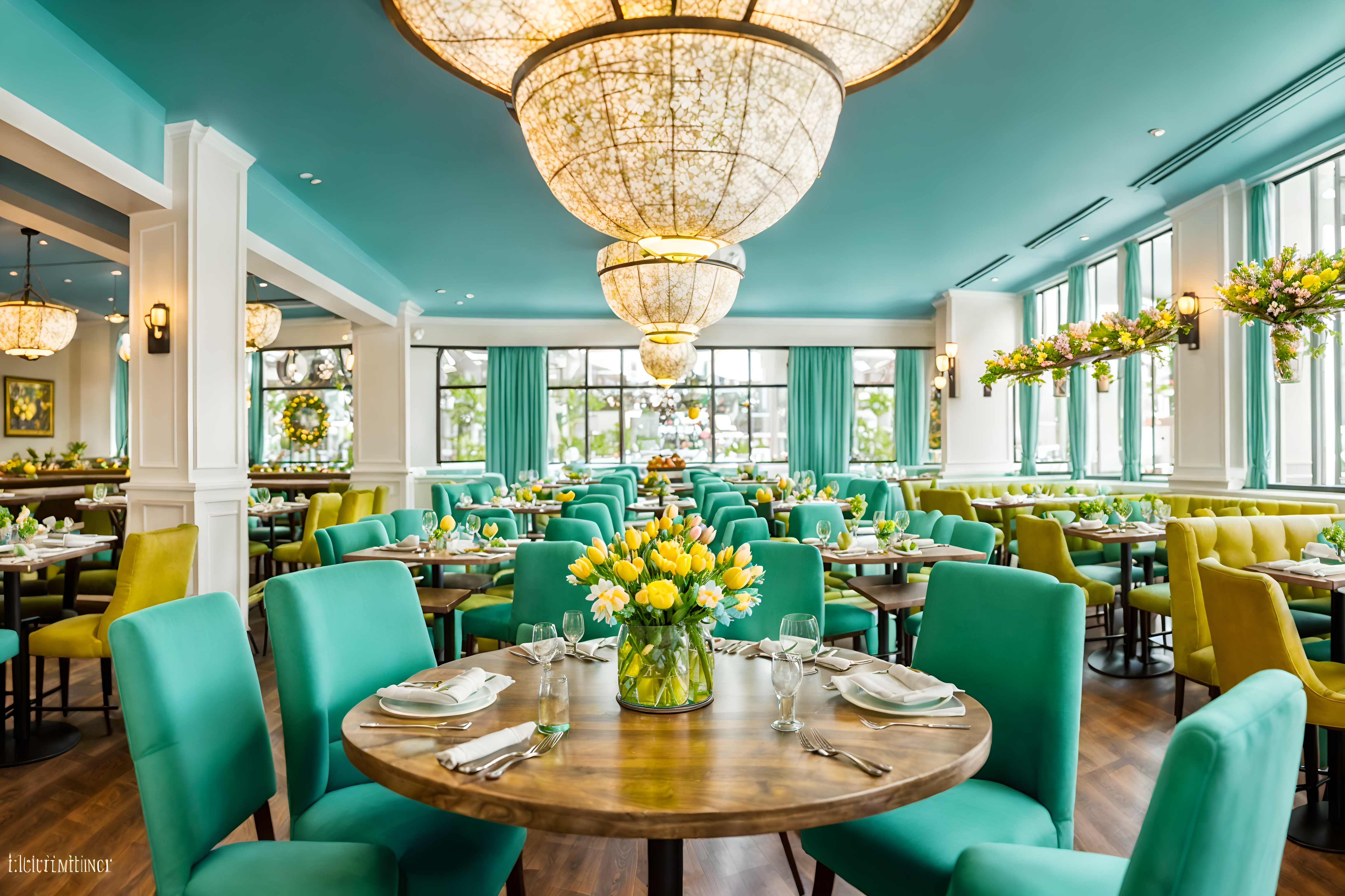 photo from pinterest of easter-style interior designed (restaurant interior) with restaurant dining tables and restaurant bar and restaurant chairs and restaurant decor and restaurant dining tables. . with spring decorations and light blue colors and flowers on table and colorful easter eggs and easter decorations and spring decorations. . cinematic photo, highly detailed, cinematic lighting, ultra-detailed, ultrarealistic, photorealism, 8k. trending on pinterest. easter interior design style. masterpiece, cinematic light, ultrarealistic+, photorealistic+, 8k, raw photo, realistic, sharp focus on eyes, (symmetrical eyes), (intact eyes), hyperrealistic, highest quality, best quality, , highly detailed, masterpiece, best quality, extremely detailed 8k wallpaper, masterpiece, best quality, ultra-detailed, best shadow, detailed background, detailed face, detailed eyes, high contrast, best illumination, detailed face, dulux, caustic, dynamic angle, detailed glow. dramatic lighting. highly detailed, insanely detailed hair, symmetrical, intricate details, professionally retouched, 8k high definition. strong bokeh. award winning photo.