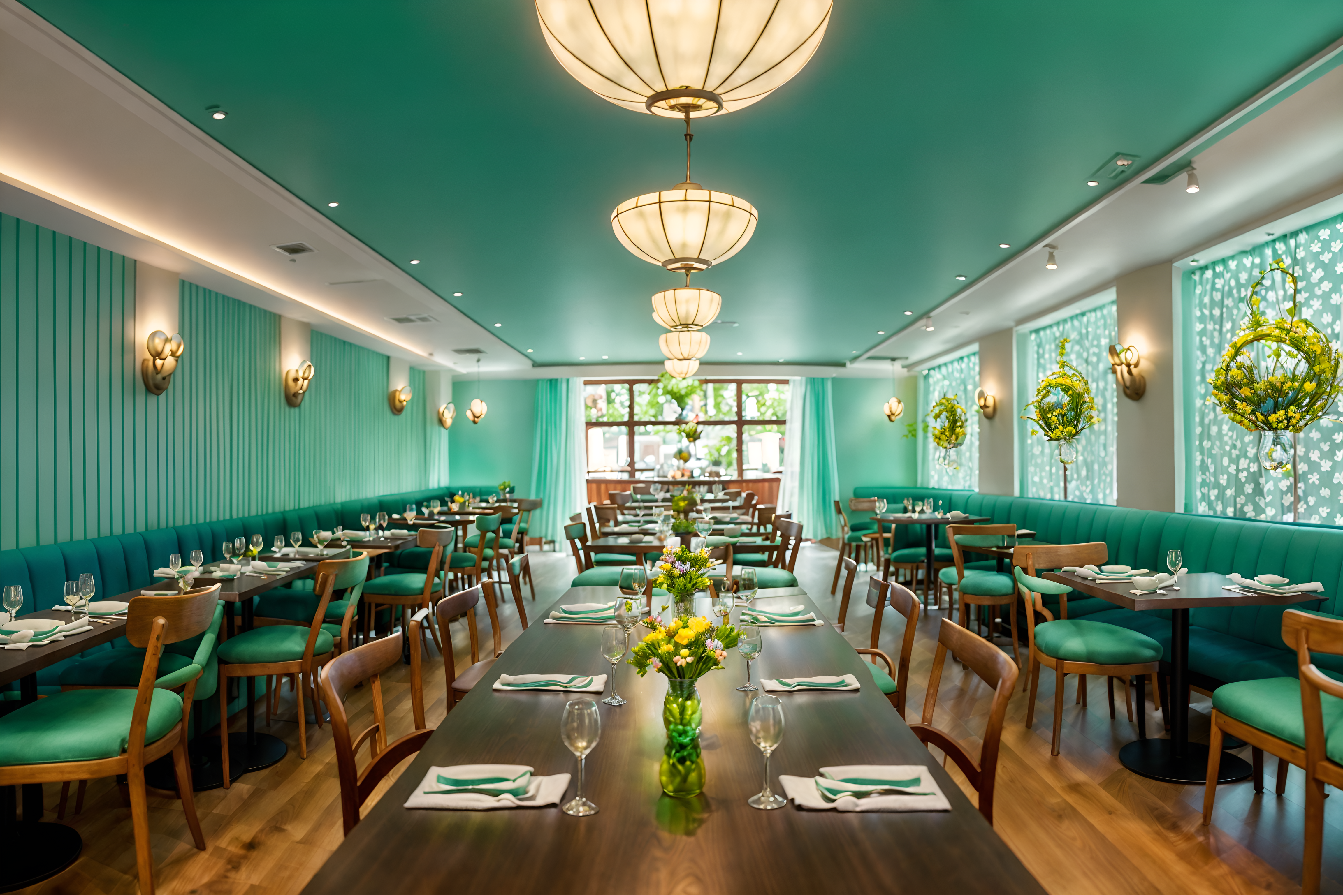 photo from pinterest of easter-style interior designed (restaurant interior) with restaurant dining tables and restaurant bar and restaurant chairs and restaurant decor and restaurant dining tables. . with spring decorations and light blue colors and flowers on table and colorful easter eggs and easter decorations and spring decorations. . cinematic photo, highly detailed, cinematic lighting, ultra-detailed, ultrarealistic, photorealism, 8k. trending on pinterest. easter interior design style. masterpiece, cinematic light, ultrarealistic+, photorealistic+, 8k, raw photo, realistic, sharp focus on eyes, (symmetrical eyes), (intact eyes), hyperrealistic, highest quality, best quality, , highly detailed, masterpiece, best quality, extremely detailed 8k wallpaper, masterpiece, best quality, ultra-detailed, best shadow, detailed background, detailed face, detailed eyes, high contrast, best illumination, detailed face, dulux, caustic, dynamic angle, detailed glow. dramatic lighting. highly detailed, insanely detailed hair, symmetrical, intricate details, professionally retouched, 8k high definition. strong bokeh. award winning photo.