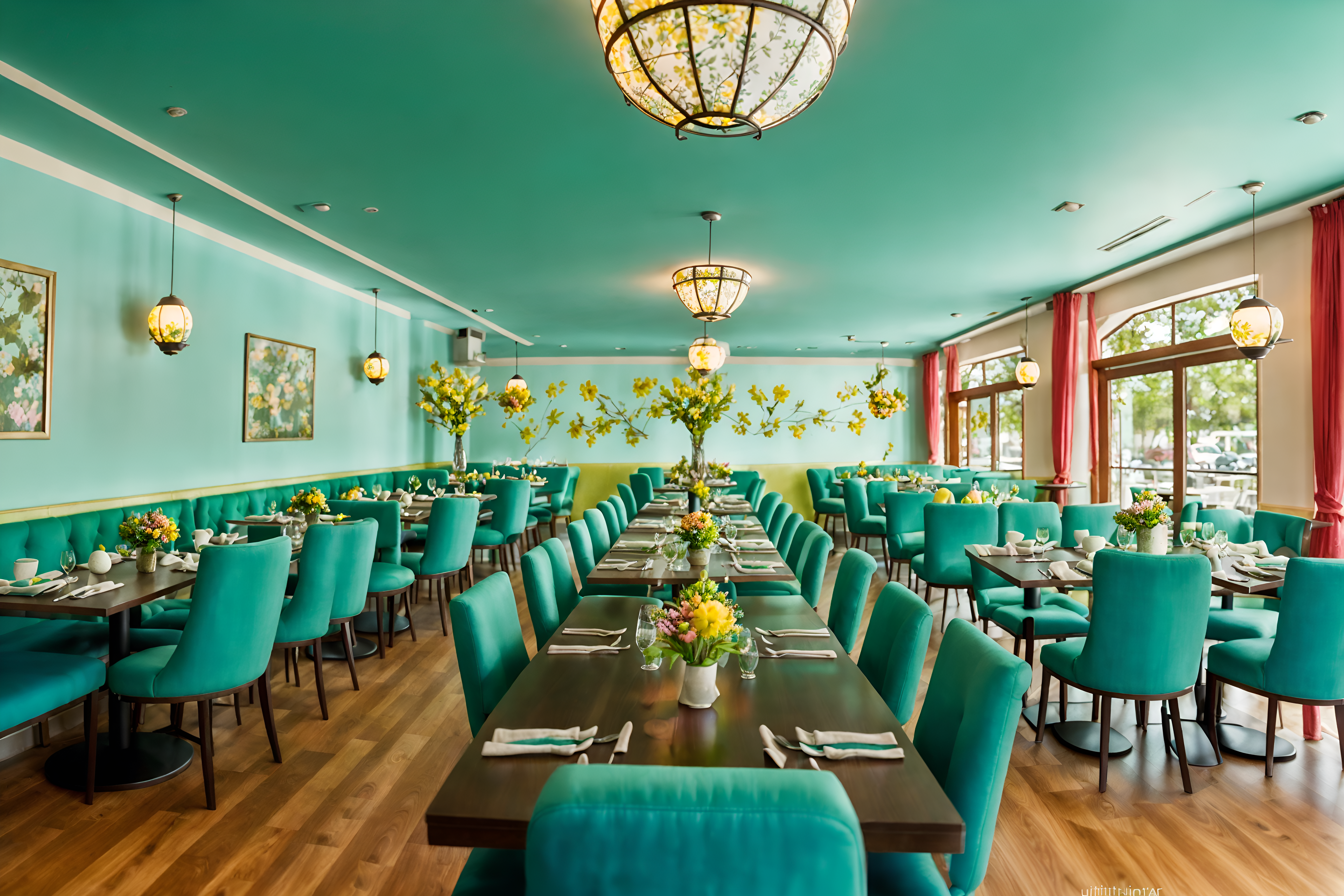 photo from pinterest of easter-style interior designed (restaurant interior) with restaurant dining tables and restaurant bar and restaurant chairs and restaurant decor and restaurant dining tables. . with spring decorations and light blue colors and flowers on table and colorful easter eggs and easter decorations and spring decorations. . cinematic photo, highly detailed, cinematic lighting, ultra-detailed, ultrarealistic, photorealism, 8k. trending on pinterest. easter interior design style. masterpiece, cinematic light, ultrarealistic+, photorealistic+, 8k, raw photo, realistic, sharp focus on eyes, (symmetrical eyes), (intact eyes), hyperrealistic, highest quality, best quality, , highly detailed, masterpiece, best quality, extremely detailed 8k wallpaper, masterpiece, best quality, ultra-detailed, best shadow, detailed background, detailed face, detailed eyes, high contrast, best illumination, detailed face, dulux, caustic, dynamic angle, detailed glow. dramatic lighting. highly detailed, insanely detailed hair, symmetrical, intricate details, professionally retouched, 8k high definition. strong bokeh. award winning photo.