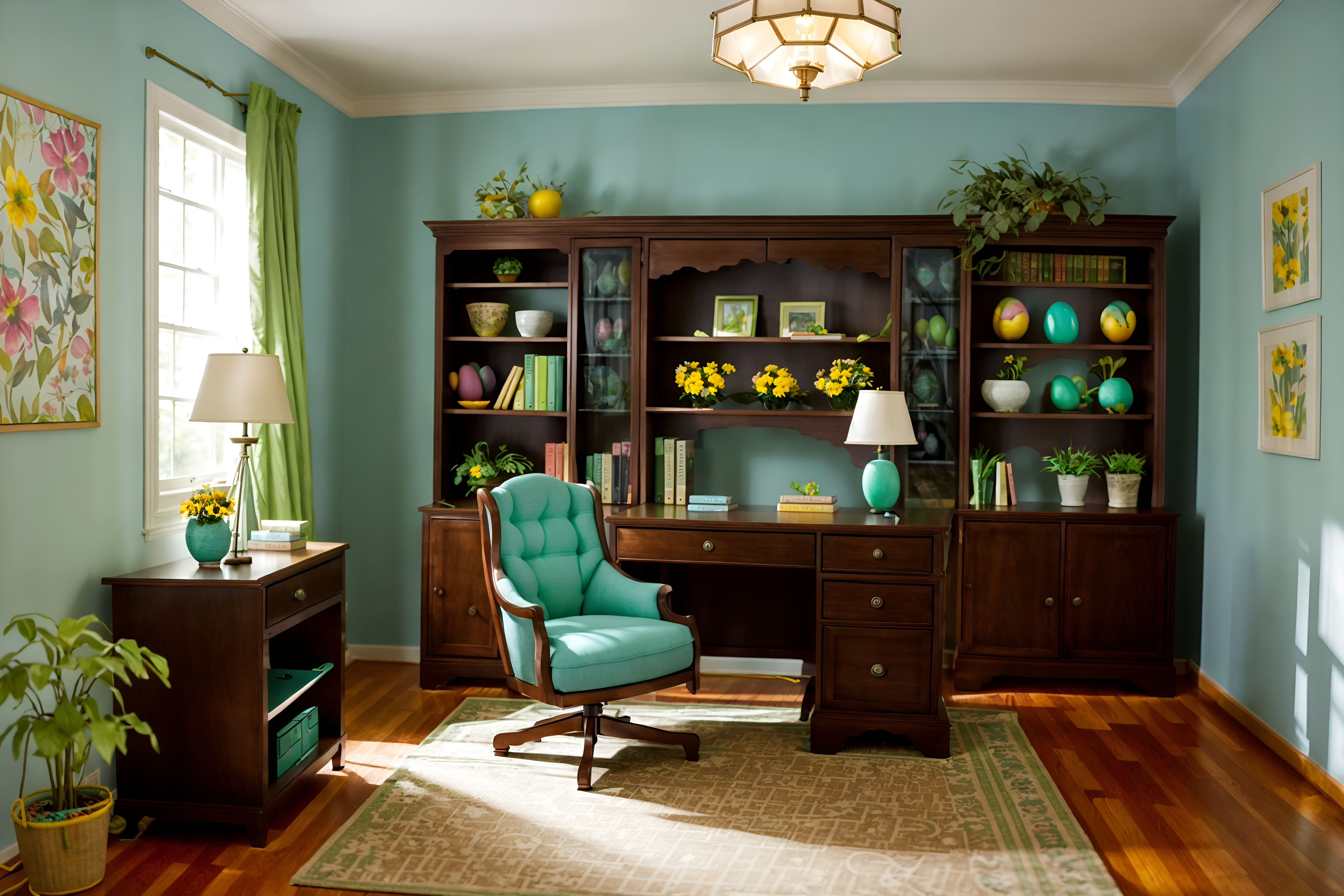 photo from pinterest of easter-style interior designed (study room interior) with lounge chair and cabinets and desk lamp and plant and office chair and bookshelves and writing desk and lounge chair. . with flowers on table and easter decorations and colorful easter eggs and light blue colors and spring decorations and flowers on table. . cinematic photo, highly detailed, cinematic lighting, ultra-detailed, ultrarealistic, photorealism, 8k. trending on pinterest. easter interior design style. masterpiece, cinematic light, ultrarealistic+, photorealistic+, 8k, raw photo, realistic, sharp focus on eyes, (symmetrical eyes), (intact eyes), hyperrealistic, highest quality, best quality, , highly detailed, masterpiece, best quality, extremely detailed 8k wallpaper, masterpiece, best quality, ultra-detailed, best shadow, detailed background, detailed face, detailed eyes, high contrast, best illumination, detailed face, dulux, caustic, dynamic angle, detailed glow. dramatic lighting. highly detailed, insanely detailed hair, symmetrical, intricate details, professionally retouched, 8k high definition. strong bokeh. award winning photo.