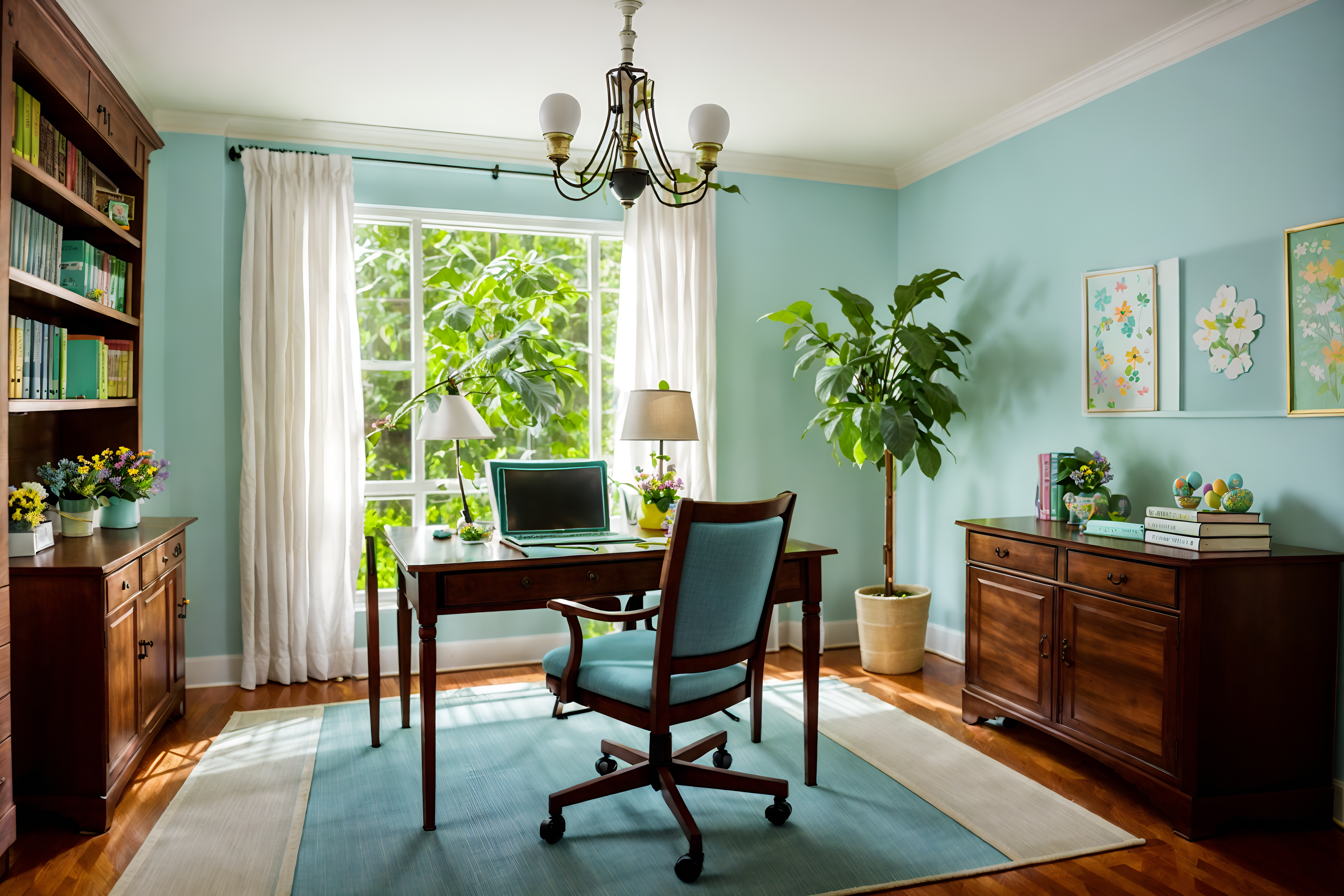 easter study roomsinterior decorate this study room with easter style. . . with cabinets and bookshelves and desk lamp and lounge chair and plant and writing desk and office chair and cabinets. . with spring decorations and flowers on table and colorful easter eggs and easter decorations and light blue colors and spring decorations. . .