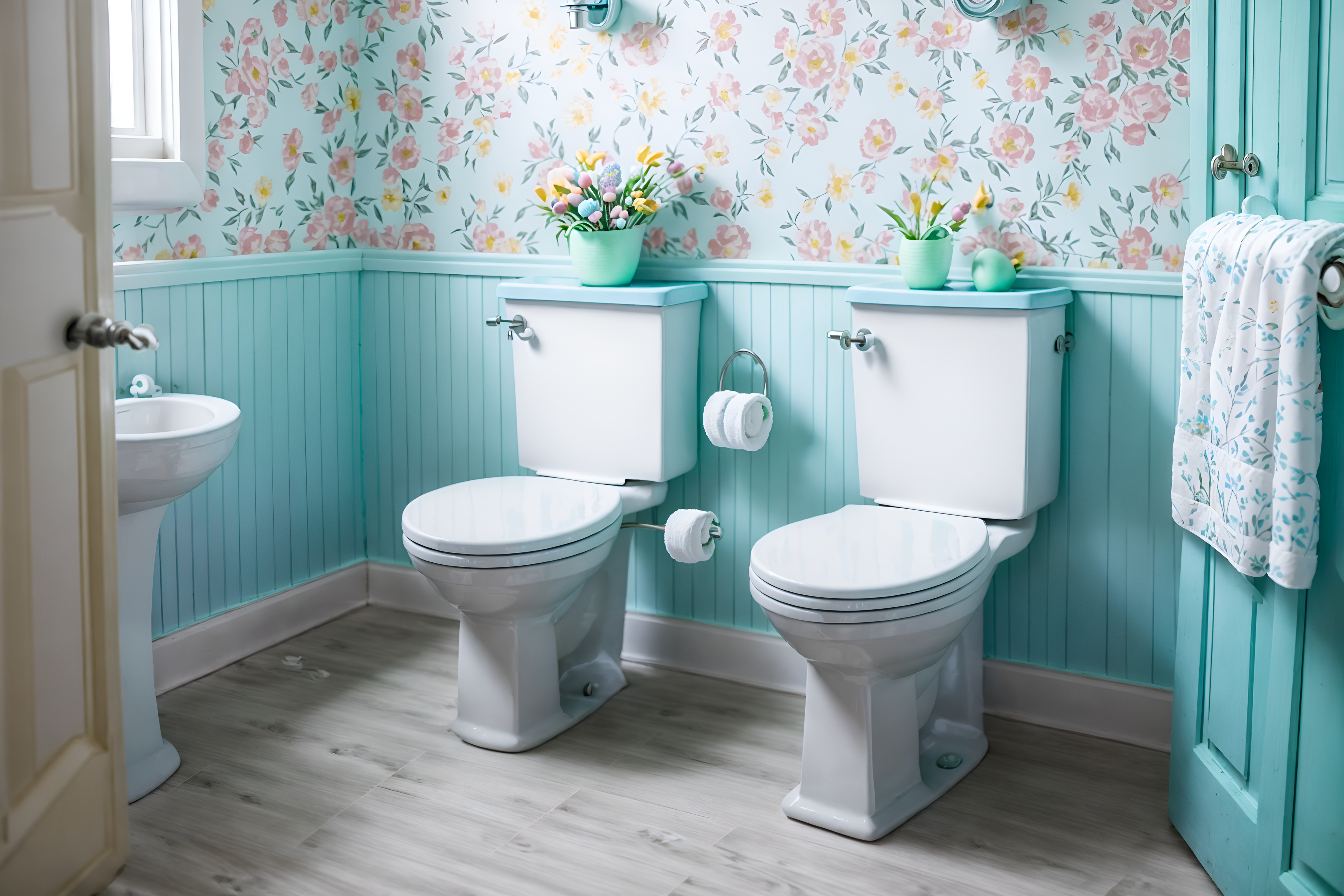 easter toiletsinterior decorate this toilet with easter style. . . with toilet paper hanger and toilet with toilet seat up and sink with tap and toilet paper hanger. . with easter decorations and flowers on table and spring decorations and light blue colors and colorful easter eggs and easter decorations. . .