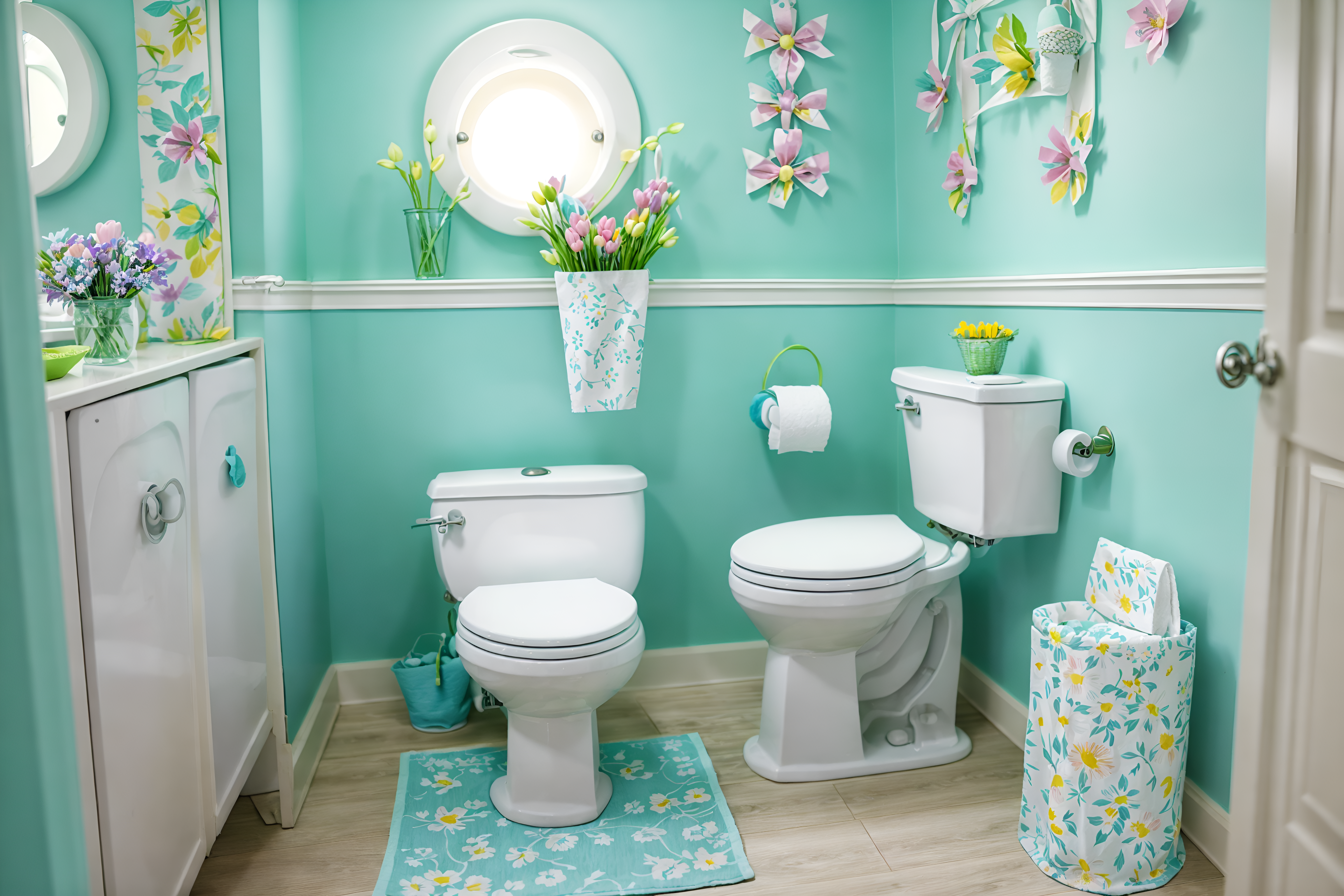 easter toiletsinterior decorate this toilet with easter style. . . with toilet paper hanger and toilet with toilet seat up and sink with tap and toilet paper hanger. . with easter decorations and flowers on table and spring decorations and light blue colors and colorful easter eggs and easter decorations. . .