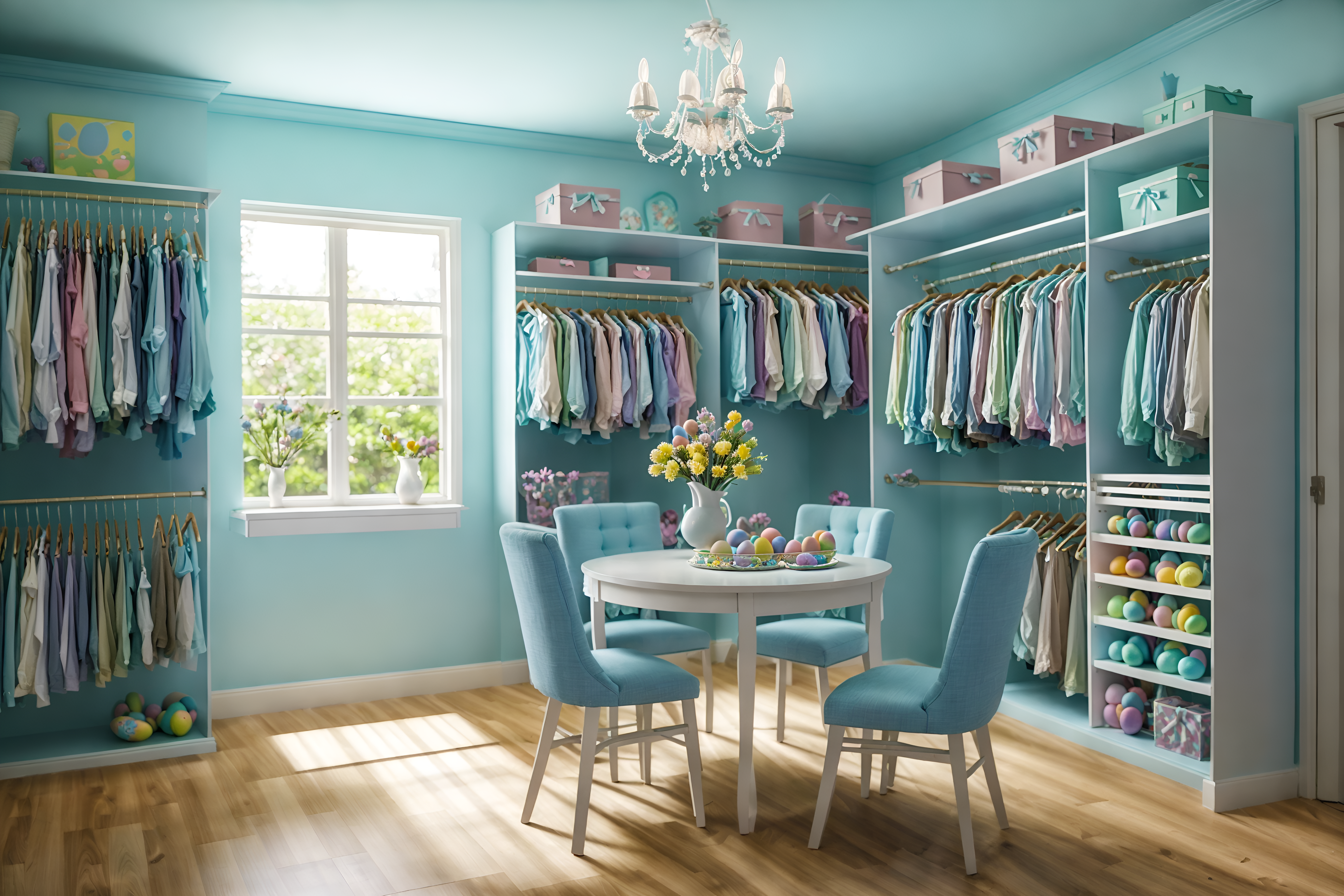 photo from pinterest of easter-style interior designed (walk in closet interior) . with light blue colors and easter decorations and colorful easter eggs and spring decorations and flowers on table and light blue colors. . cinematic photo, highly detailed, cinematic lighting, ultra-detailed, ultrarealistic, photorealism, 8k. trending on pinterest. easter interior design style. masterpiece, cinematic light, ultrarealistic+, photorealistic+, 8k, raw photo, realistic, sharp focus on eyes, (symmetrical eyes), (intact eyes), hyperrealistic, highest quality, best quality, , highly detailed, masterpiece, best quality, extremely detailed 8k wallpaper, masterpiece, best quality, ultra-detailed, best shadow, detailed background, detailed face, detailed eyes, high contrast, best illumination, detailed face, dulux, caustic, dynamic angle, detailed glow. dramatic lighting. highly detailed, insanely detailed hair, symmetrical, intricate details, professionally retouched, 8k high definition. strong bokeh. award winning photo.