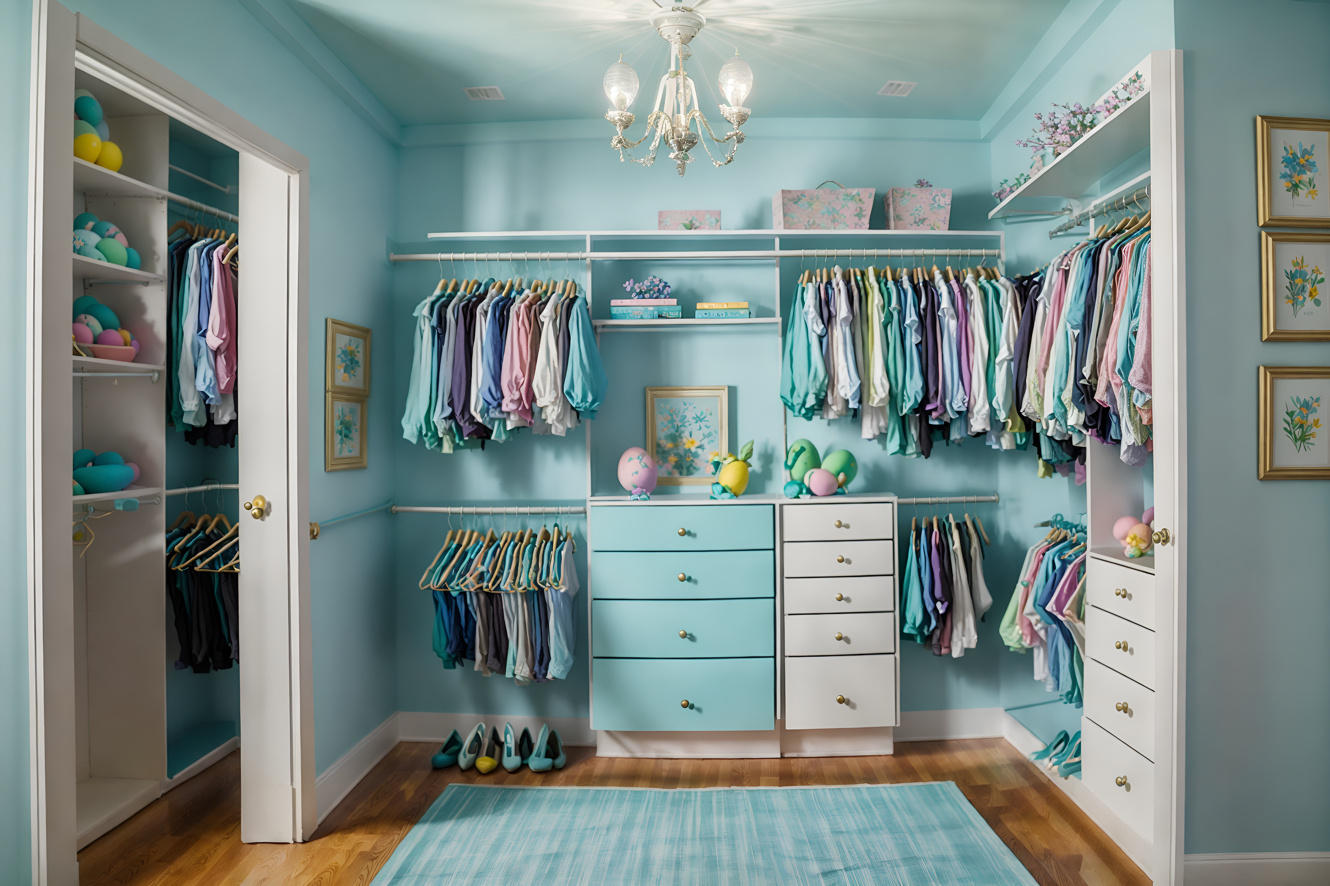 photo from pinterest of easter-style interior designed (walk in closet interior) . with light blue colors and easter decorations and colorful easter eggs and spring decorations and flowers on table and light blue colors. . cinematic photo, highly detailed, cinematic lighting, ultra-detailed, ultrarealistic, photorealism, 8k. trending on pinterest. easter interior design style. masterpiece, cinematic light, ultrarealistic+, photorealistic+, 8k, raw photo, realistic, sharp focus on eyes, (symmetrical eyes), (intact eyes), hyperrealistic, highest quality, best quality, , highly detailed, masterpiece, best quality, extremely detailed 8k wallpaper, masterpiece, best quality, ultra-detailed, best shadow, detailed background, detailed face, detailed eyes, high contrast, best illumination, detailed face, dulux, caustic, dynamic angle, detailed glow. dramatic lighting. highly detailed, insanely detailed hair, symmetrical, intricate details, professionally retouched, 8k high definition. strong bokeh. award winning photo.