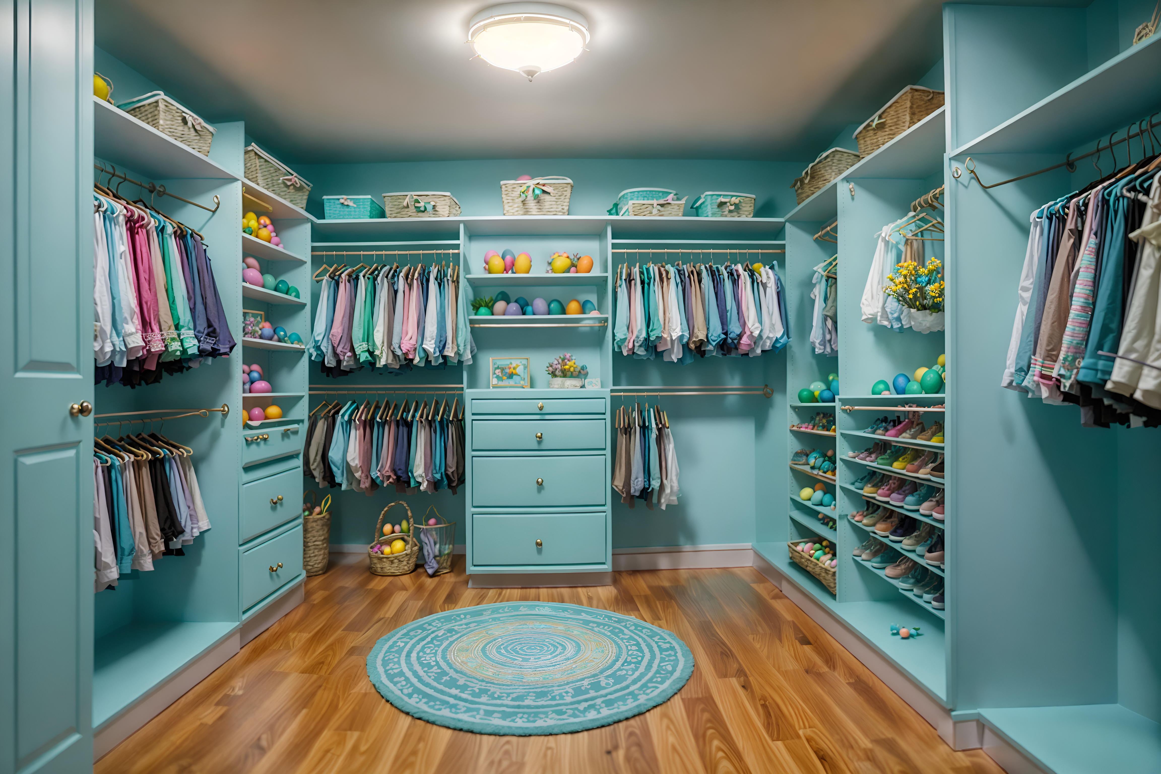 photo from pinterest of easter-style interior designed (walk in closet interior) . with light blue colors and easter decorations and colorful easter eggs and spring decorations and flowers on table and light blue colors. . cinematic photo, highly detailed, cinematic lighting, ultra-detailed, ultrarealistic, photorealism, 8k. trending on pinterest. easter interior design style. masterpiece, cinematic light, ultrarealistic+, photorealistic+, 8k, raw photo, realistic, sharp focus on eyes, (symmetrical eyes), (intact eyes), hyperrealistic, highest quality, best quality, , highly detailed, masterpiece, best quality, extremely detailed 8k wallpaper, masterpiece, best quality, ultra-detailed, best shadow, detailed background, detailed face, detailed eyes, high contrast, best illumination, detailed face, dulux, caustic, dynamic angle, detailed glow. dramatic lighting. highly detailed, insanely detailed hair, symmetrical, intricate details, professionally retouched, 8k high definition. strong bokeh. award winning photo.