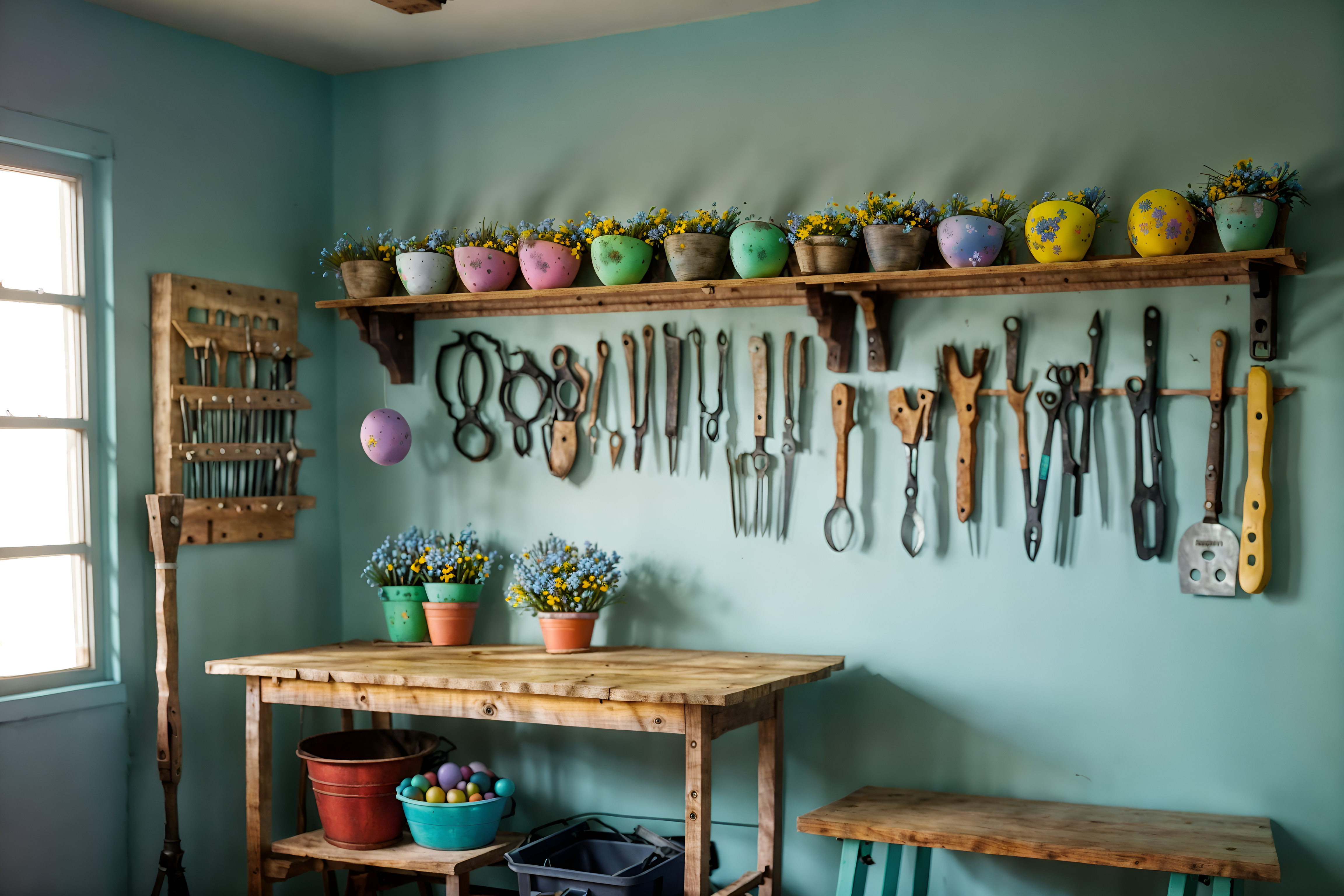 photo from pinterest of easter-style interior designed (workshop interior) with wooden workbench and messy and tool wall and wooden workbench. . with easter decorations and spring decorations and flowers on table and colorful easter eggs and light blue colors and easter decorations. . cinematic photo, highly detailed, cinematic lighting, ultra-detailed, ultrarealistic, photorealism, 8k. trending on pinterest. easter interior design style. masterpiece, cinematic light, ultrarealistic+, photorealistic+, 8k, raw photo, realistic, sharp focus on eyes, (symmetrical eyes), (intact eyes), hyperrealistic, highest quality, best quality, , highly detailed, masterpiece, best quality, extremely detailed 8k wallpaper, masterpiece, best quality, ultra-detailed, best shadow, detailed background, detailed face, detailed eyes, high contrast, best illumination, detailed face, dulux, caustic, dynamic angle, detailed glow. dramatic lighting. highly detailed, insanely detailed hair, symmetrical, intricate details, professionally retouched, 8k high definition. strong bokeh. award winning photo.