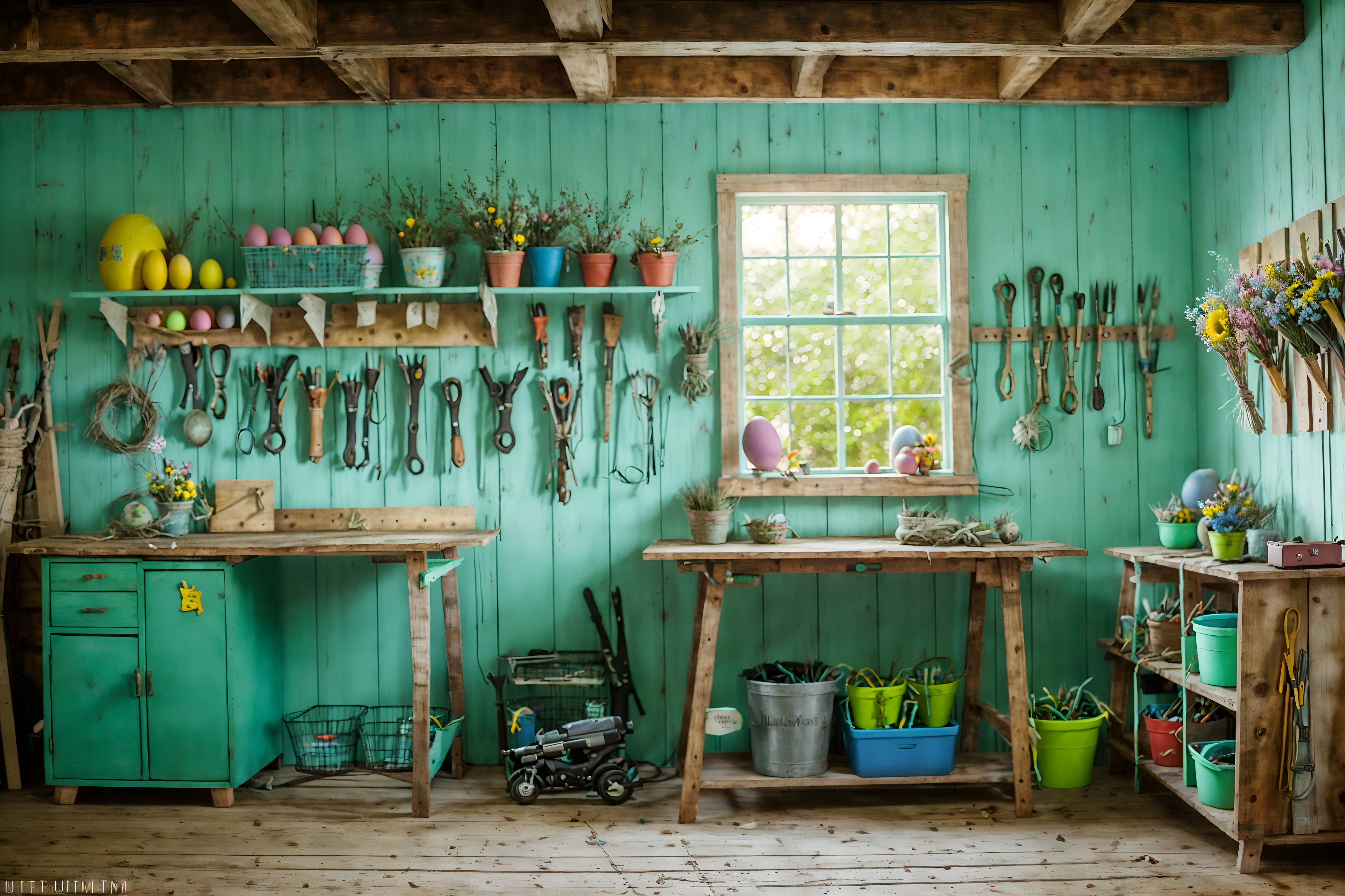 photo from pinterest of easter-style interior designed (workshop interior) with wooden workbench and messy and tool wall and wooden workbench. . with easter decorations and spring decorations and flowers on table and colorful easter eggs and light blue colors and easter decorations. . cinematic photo, highly detailed, cinematic lighting, ultra-detailed, ultrarealistic, photorealism, 8k. trending on pinterest. easter interior design style. masterpiece, cinematic light, ultrarealistic+, photorealistic+, 8k, raw photo, realistic, sharp focus on eyes, (symmetrical eyes), (intact eyes), hyperrealistic, highest quality, best quality, , highly detailed, masterpiece, best quality, extremely detailed 8k wallpaper, masterpiece, best quality, ultra-detailed, best shadow, detailed background, detailed face, detailed eyes, high contrast, best illumination, detailed face, dulux, caustic, dynamic angle, detailed glow. dramatic lighting. highly detailed, insanely detailed hair, symmetrical, intricate details, professionally retouched, 8k high definition. strong bokeh. award winning photo.
