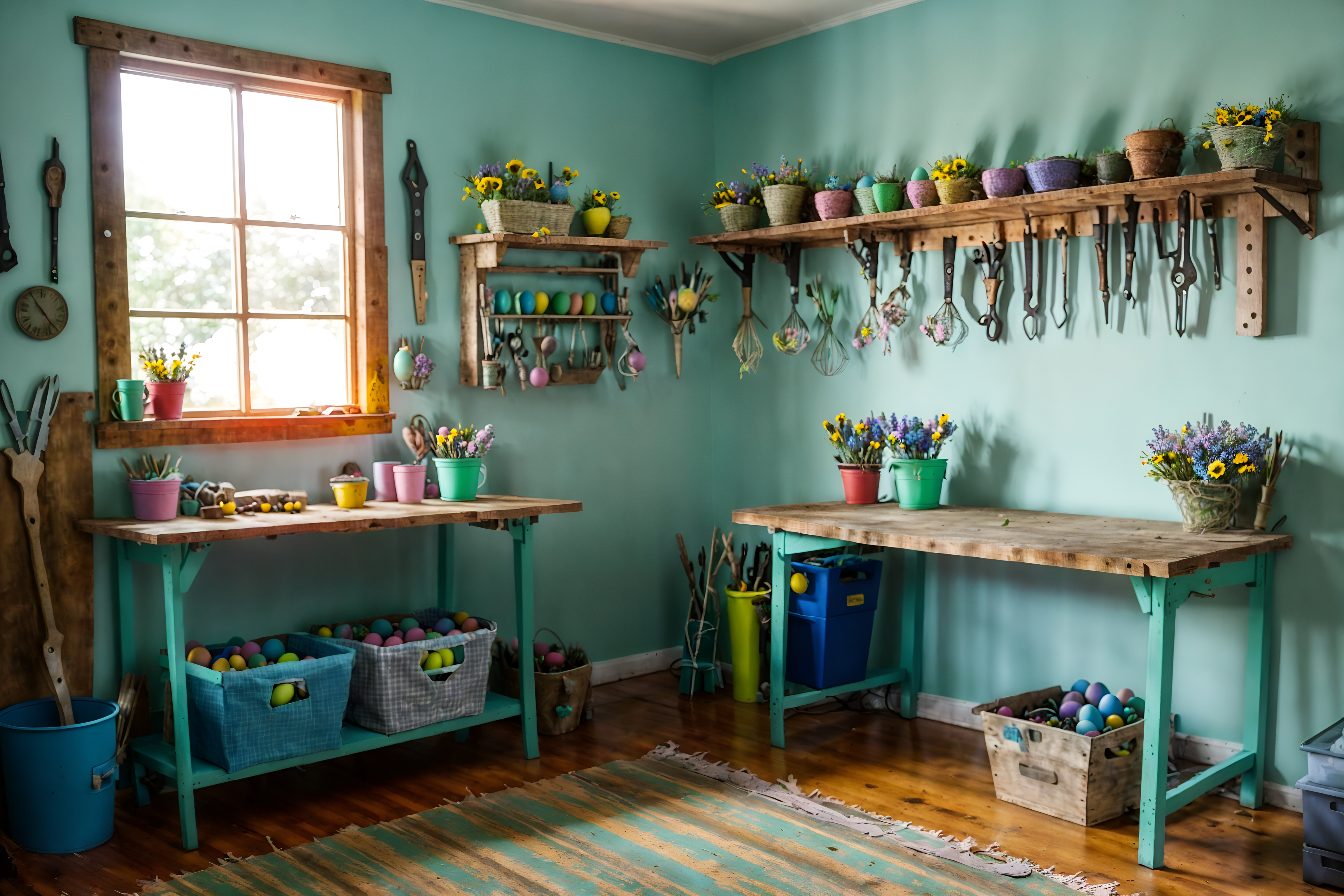 photo from pinterest of easter-style interior designed (workshop interior) with wooden workbench and messy and tool wall and wooden workbench. . with easter decorations and spring decorations and flowers on table and colorful easter eggs and light blue colors and easter decorations. . cinematic photo, highly detailed, cinematic lighting, ultra-detailed, ultrarealistic, photorealism, 8k. trending on pinterest. easter interior design style. masterpiece, cinematic light, ultrarealistic+, photorealistic+, 8k, raw photo, realistic, sharp focus on eyes, (symmetrical eyes), (intact eyes), hyperrealistic, highest quality, best quality, , highly detailed, masterpiece, best quality, extremely detailed 8k wallpaper, masterpiece, best quality, ultra-detailed, best shadow, detailed background, detailed face, detailed eyes, high contrast, best illumination, detailed face, dulux, caustic, dynamic angle, detailed glow. dramatic lighting. highly detailed, insanely detailed hair, symmetrical, intricate details, professionally retouched, 8k high definition. strong bokeh. award winning photo.