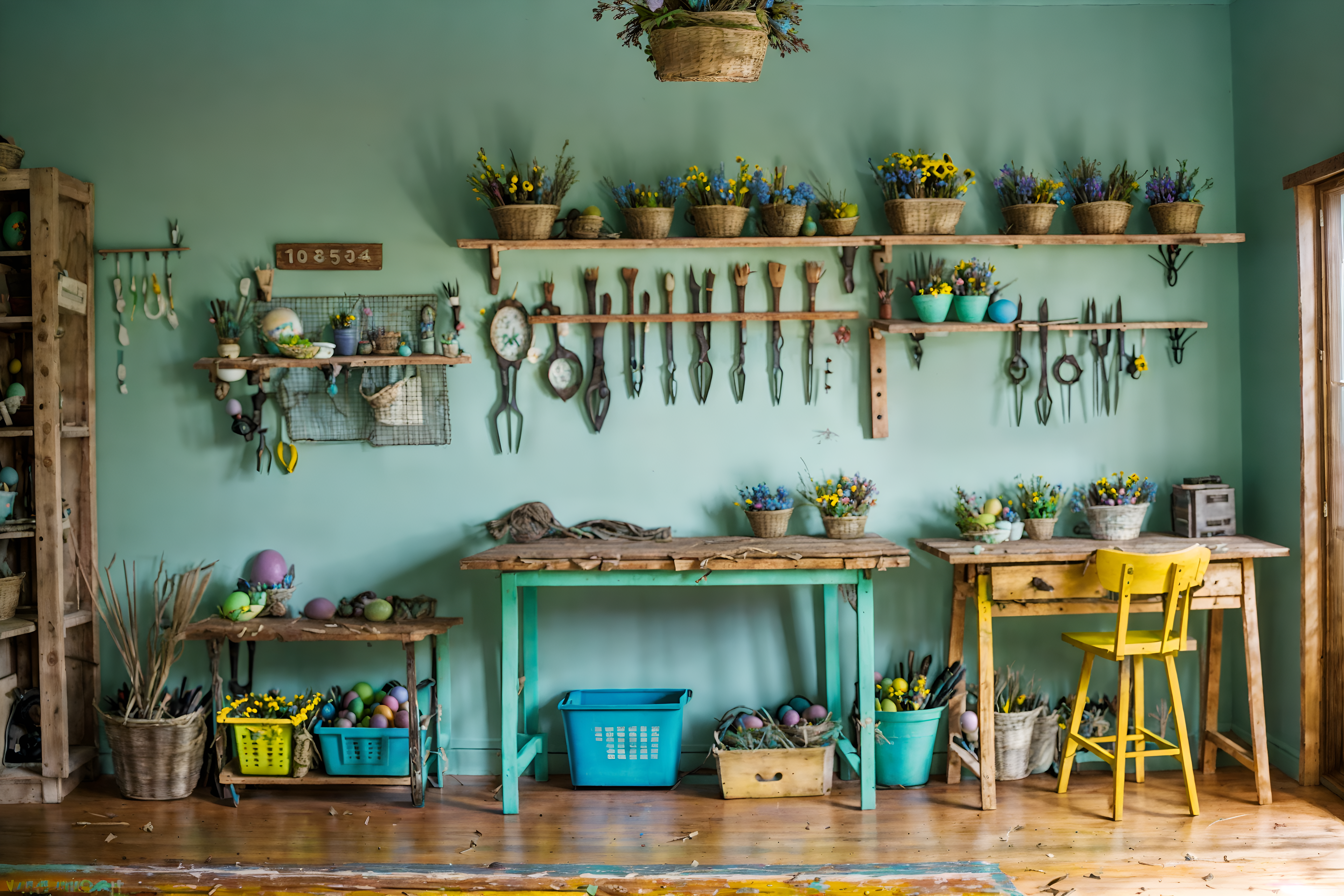 photo from pinterest of easter-style interior designed (workshop interior) with wooden workbench and messy and tool wall and wooden workbench. . with easter decorations and spring decorations and flowers on table and colorful easter eggs and light blue colors and easter decorations. . cinematic photo, highly detailed, cinematic lighting, ultra-detailed, ultrarealistic, photorealism, 8k. trending on pinterest. easter interior design style. masterpiece, cinematic light, ultrarealistic+, photorealistic+, 8k, raw photo, realistic, sharp focus on eyes, (symmetrical eyes), (intact eyes), hyperrealistic, highest quality, best quality, , highly detailed, masterpiece, best quality, extremely detailed 8k wallpaper, masterpiece, best quality, ultra-detailed, best shadow, detailed background, detailed face, detailed eyes, high contrast, best illumination, detailed face, dulux, caustic, dynamic angle, detailed glow. dramatic lighting. highly detailed, insanely detailed hair, symmetrical, intricate details, professionally retouched, 8k high definition. strong bokeh. award winning photo.