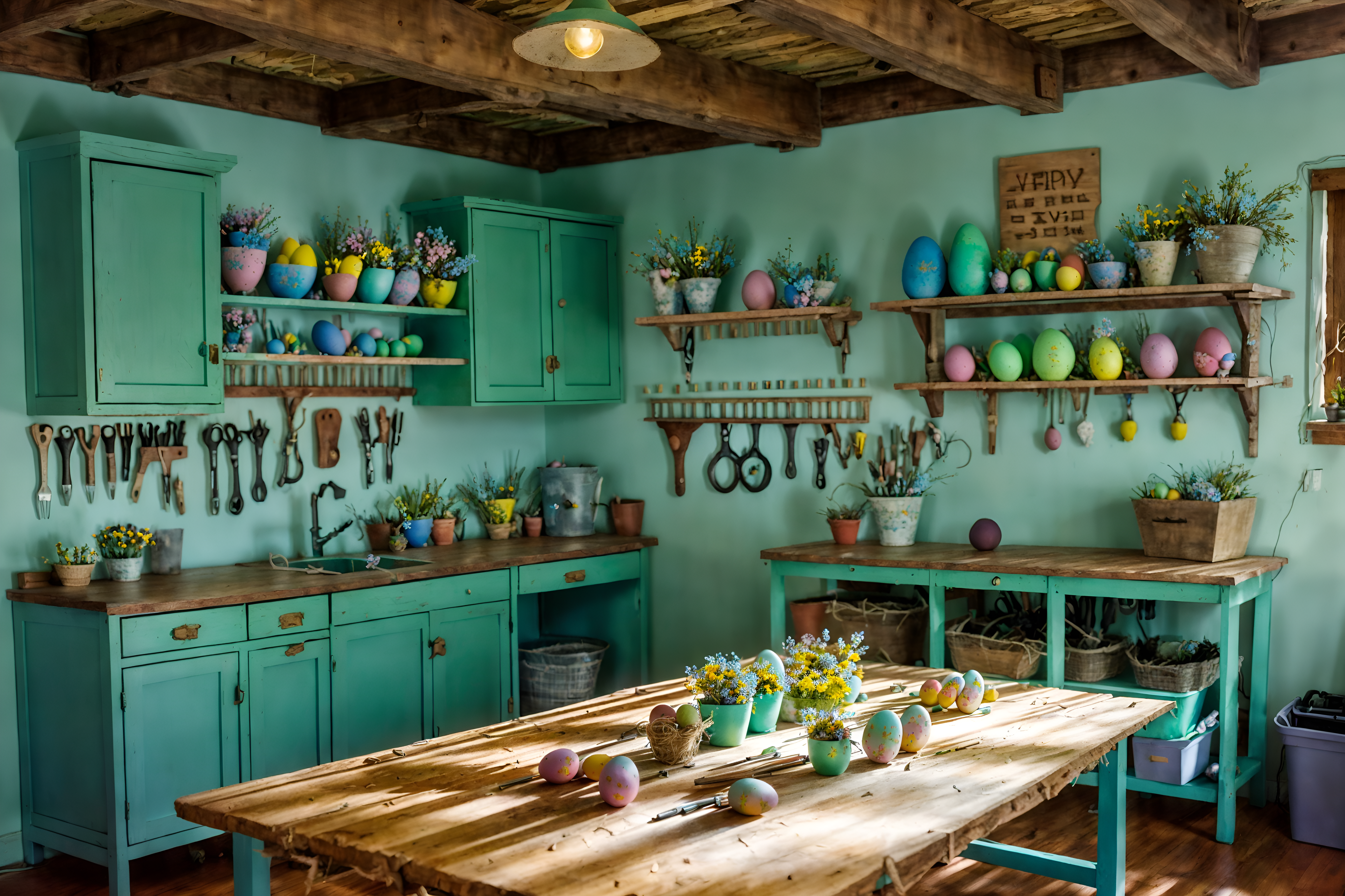 photo from pinterest of easter-style interior designed (workshop interior) with wooden workbench and tool wall and messy and wooden workbench. . with spring decorations and easter decorations and light blue colors and flowers on table and colorful easter eggs and spring decorations. . cinematic photo, highly detailed, cinematic lighting, ultra-detailed, ultrarealistic, photorealism, 8k. trending on pinterest. easter interior design style. masterpiece, cinematic light, ultrarealistic+, photorealistic+, 8k, raw photo, realistic, sharp focus on eyes, (symmetrical eyes), (intact eyes), hyperrealistic, highest quality, best quality, , highly detailed, masterpiece, best quality, extremely detailed 8k wallpaper, masterpiece, best quality, ultra-detailed, best shadow, detailed background, detailed face, detailed eyes, high contrast, best illumination, detailed face, dulux, caustic, dynamic angle, detailed glow. dramatic lighting. highly detailed, insanely detailed hair, symmetrical, intricate details, professionally retouched, 8k high definition. strong bokeh. award winning photo.