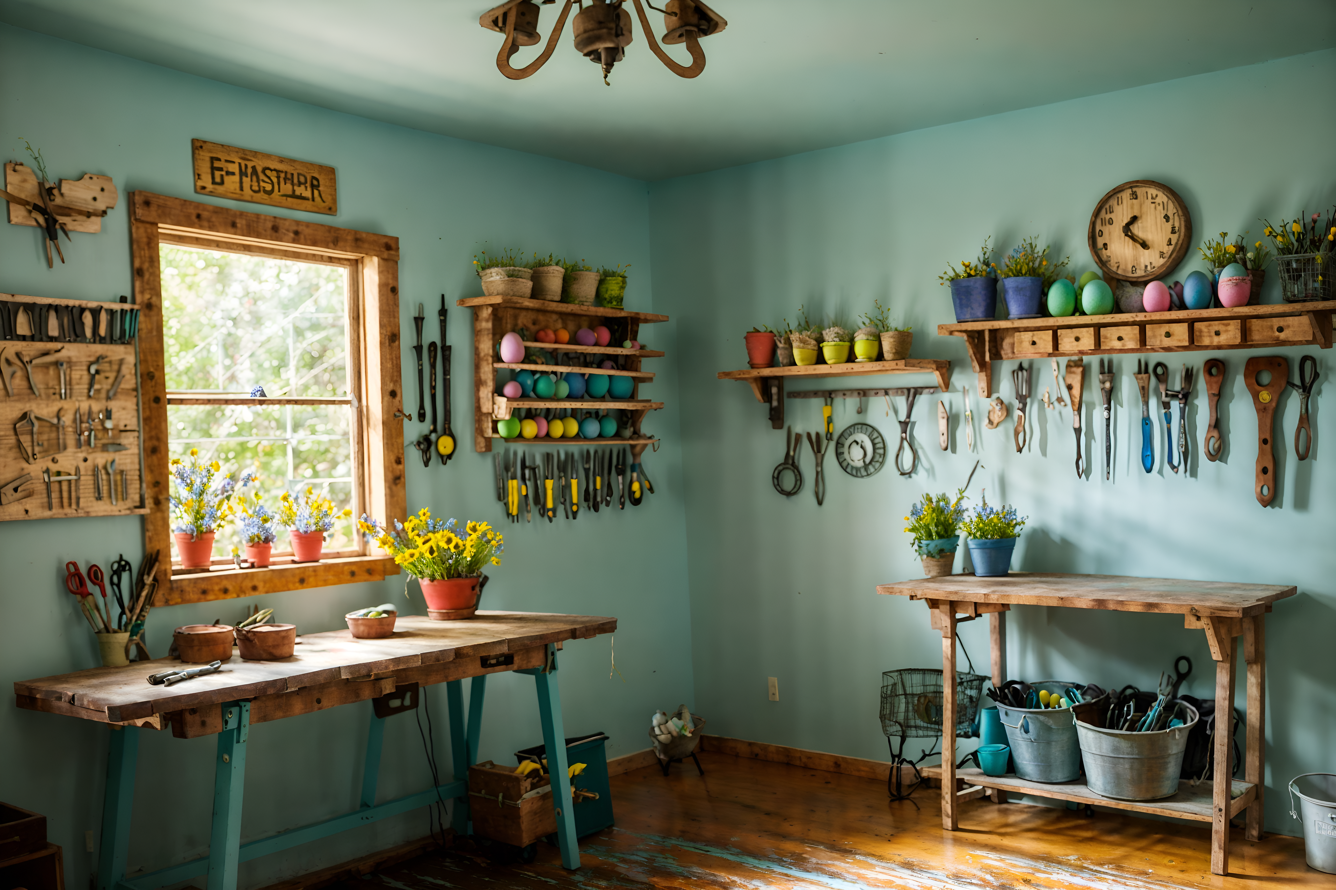 photo from pinterest of easter-style interior designed (workshop interior) with wooden workbench and tool wall and messy and wooden workbench. . with spring decorations and easter decorations and light blue colors and flowers on table and colorful easter eggs and spring decorations. . cinematic photo, highly detailed, cinematic lighting, ultra-detailed, ultrarealistic, photorealism, 8k. trending on pinterest. easter interior design style. masterpiece, cinematic light, ultrarealistic+, photorealistic+, 8k, raw photo, realistic, sharp focus on eyes, (symmetrical eyes), (intact eyes), hyperrealistic, highest quality, best quality, , highly detailed, masterpiece, best quality, extremely detailed 8k wallpaper, masterpiece, best quality, ultra-detailed, best shadow, detailed background, detailed face, detailed eyes, high contrast, best illumination, detailed face, dulux, caustic, dynamic angle, detailed glow. dramatic lighting. highly detailed, insanely detailed hair, symmetrical, intricate details, professionally retouched, 8k high definition. strong bokeh. award winning photo.