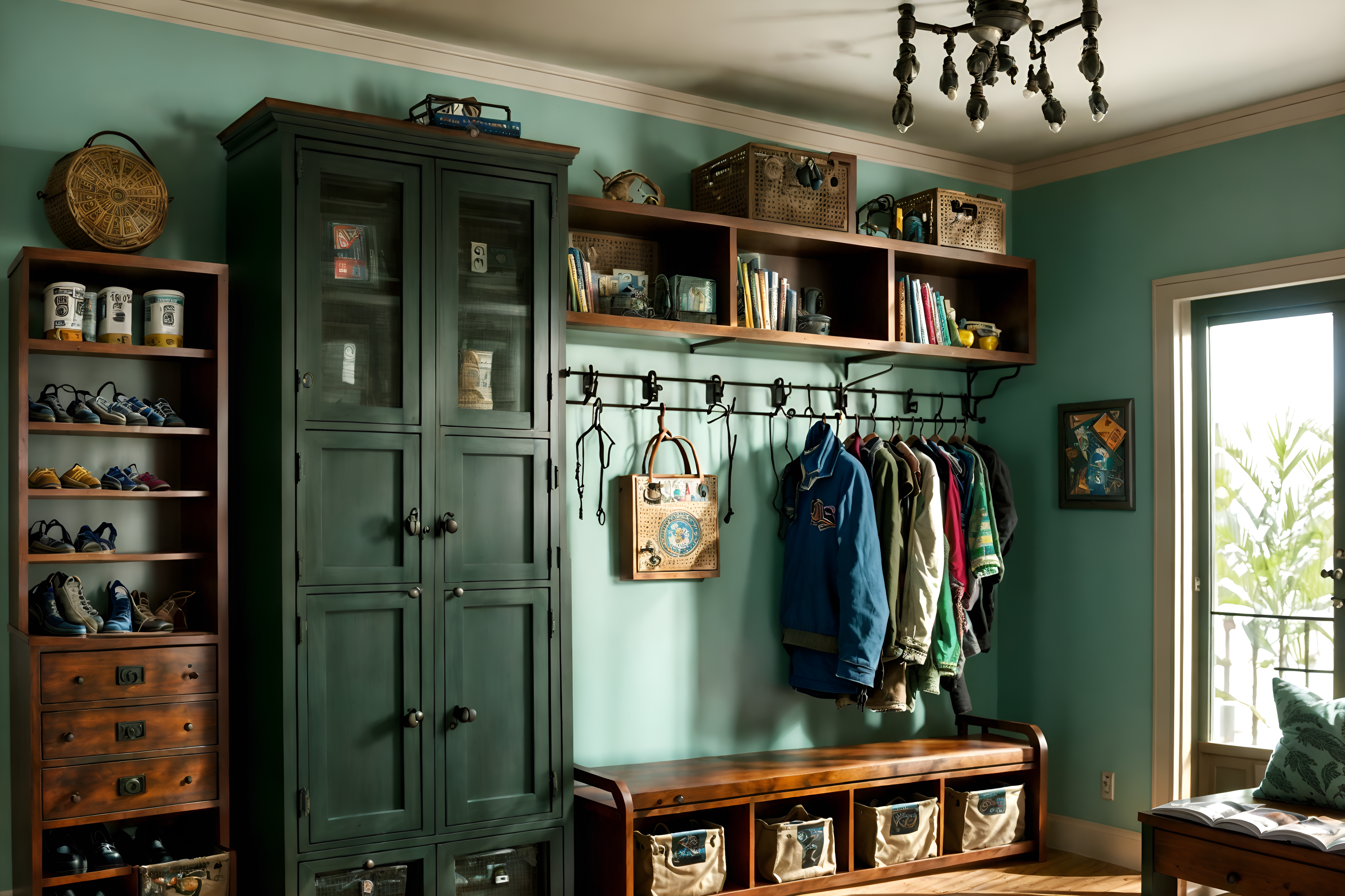 photo from pinterest of eclectic-style interior designed (drop zone interior) with lockers and a bench and high up storage and cabinets and shelves for shoes and cubbies and storage baskets and wall hooks for coats cinematic photo, highly detailed, cinematic lighting, ultra-detailed, ultrarealistic, photorealism, 8k. trending on pinterest. eclectic interior design style. masterpiece, cinematic light, ultrarealistic+, photorealistic+, 8k, raw photo, realistic, sharp focus on eyes, (symmetrical eyes), (intact eyes), hyperrealistic, highest quality, best quality, , highly detailed, masterpiece, best quality, extremely detailed 8k wallpaper, masterpiece, best quality, ultra-detailed, best shadow, detailed background, detailed face, detailed eyes, high contrast, best illumination, detailed face, dulux, caustic, dynamic angle, detailed glow. dramatic lighting. highly detailed, insanely detailed hair, symmetrical, intricate details, professionally retouched, 8k high definition. strong bokeh. award winning photo.
