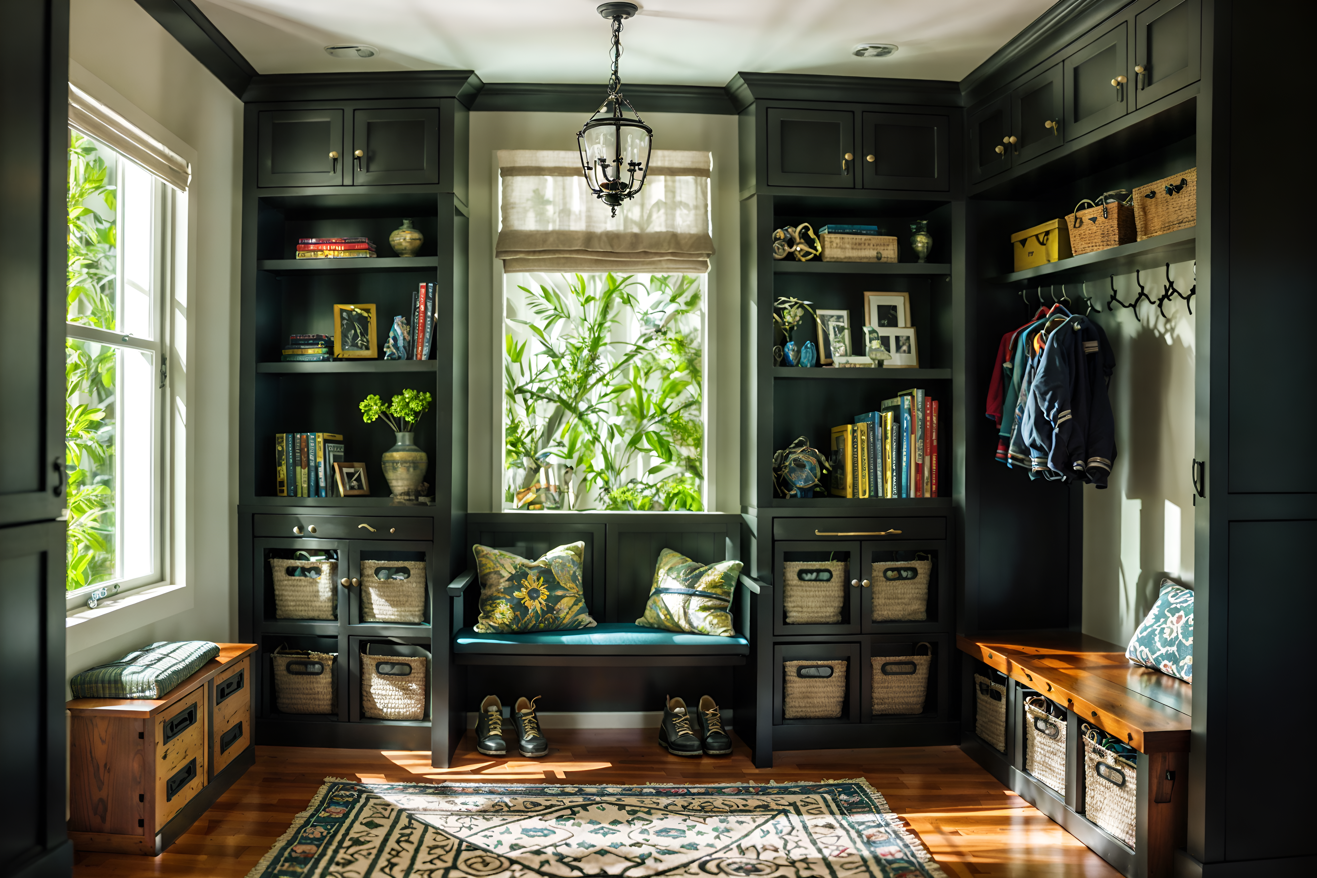 photo from pinterest of eclectic-style interior designed (drop zone interior) with lockers and a bench and high up storage and cabinets and shelves for shoes and cubbies and storage baskets and wall hooks for coats cinematic photo, highly detailed, cinematic lighting, ultra-detailed, ultrarealistic, photorealism, 8k. trending on pinterest. eclectic interior design style. masterpiece, cinematic light, ultrarealistic+, photorealistic+, 8k, raw photo, realistic, sharp focus on eyes, (symmetrical eyes), (intact eyes), hyperrealistic, highest quality, best quality, , highly detailed, masterpiece, best quality, extremely detailed 8k wallpaper, masterpiece, best quality, ultra-detailed, best shadow, detailed background, detailed face, detailed eyes, high contrast, best illumination, detailed face, dulux, caustic, dynamic angle, detailed glow. dramatic lighting. highly detailed, insanely detailed hair, symmetrical, intricate details, professionally retouched, 8k high definition. strong bokeh. award winning photo.
