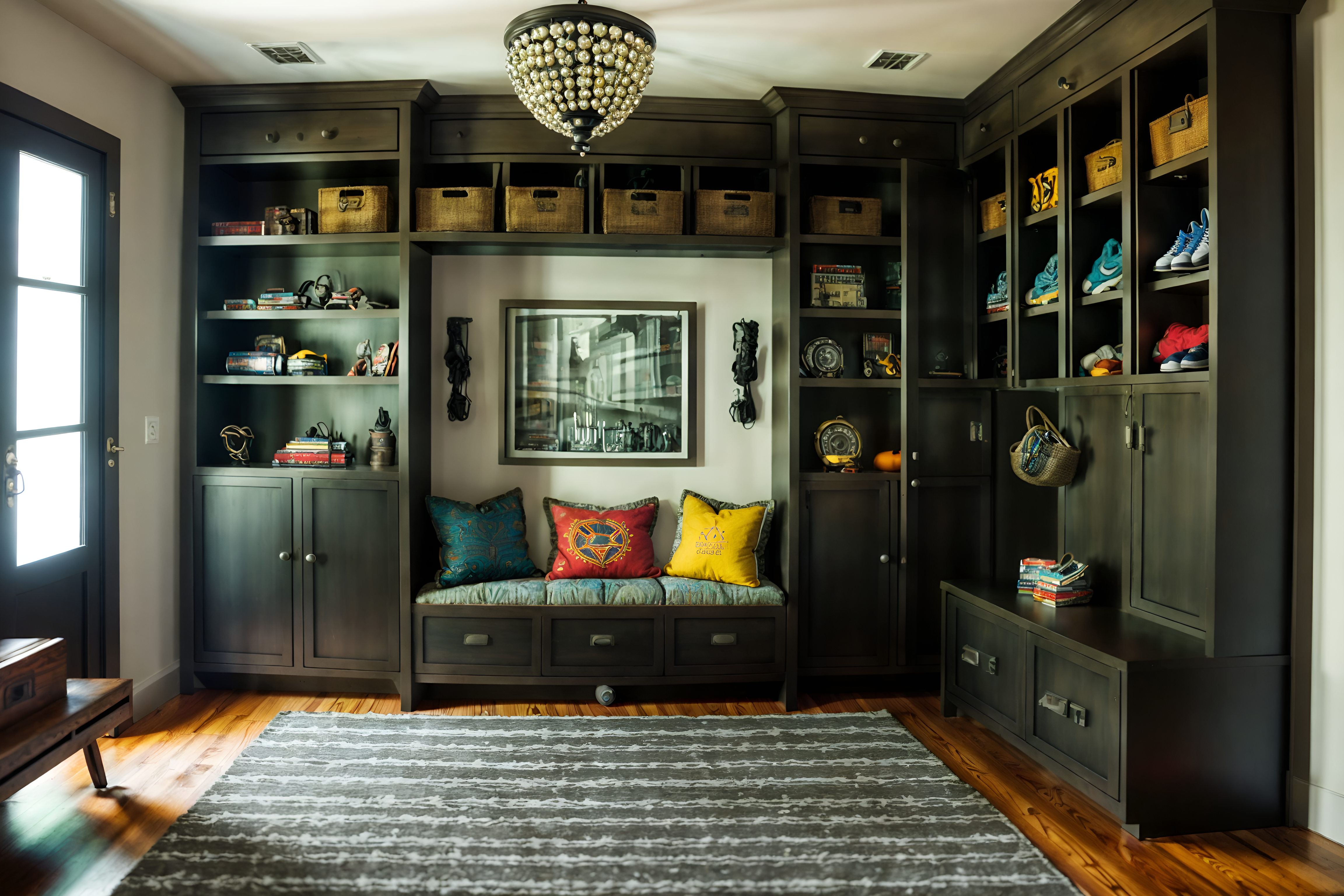 photo from pinterest of eclectic-style interior designed (drop zone interior) with lockers and a bench and high up storage and cabinets and shelves for shoes and cubbies and storage baskets and wall hooks for coats cinematic photo, highly detailed, cinematic lighting, ultra-detailed, ultrarealistic, photorealism, 8k. trending on pinterest. eclectic interior design style. masterpiece, cinematic light, ultrarealistic+, photorealistic+, 8k, raw photo, realistic, sharp focus on eyes, (symmetrical eyes), (intact eyes), hyperrealistic, highest quality, best quality, , highly detailed, masterpiece, best quality, extremely detailed 8k wallpaper, masterpiece, best quality, ultra-detailed, best shadow, detailed background, detailed face, detailed eyes, high contrast, best illumination, detailed face, dulux, caustic, dynamic angle, detailed glow. dramatic lighting. highly detailed, insanely detailed hair, symmetrical, intricate details, professionally retouched, 8k high definition. strong bokeh. award winning photo.