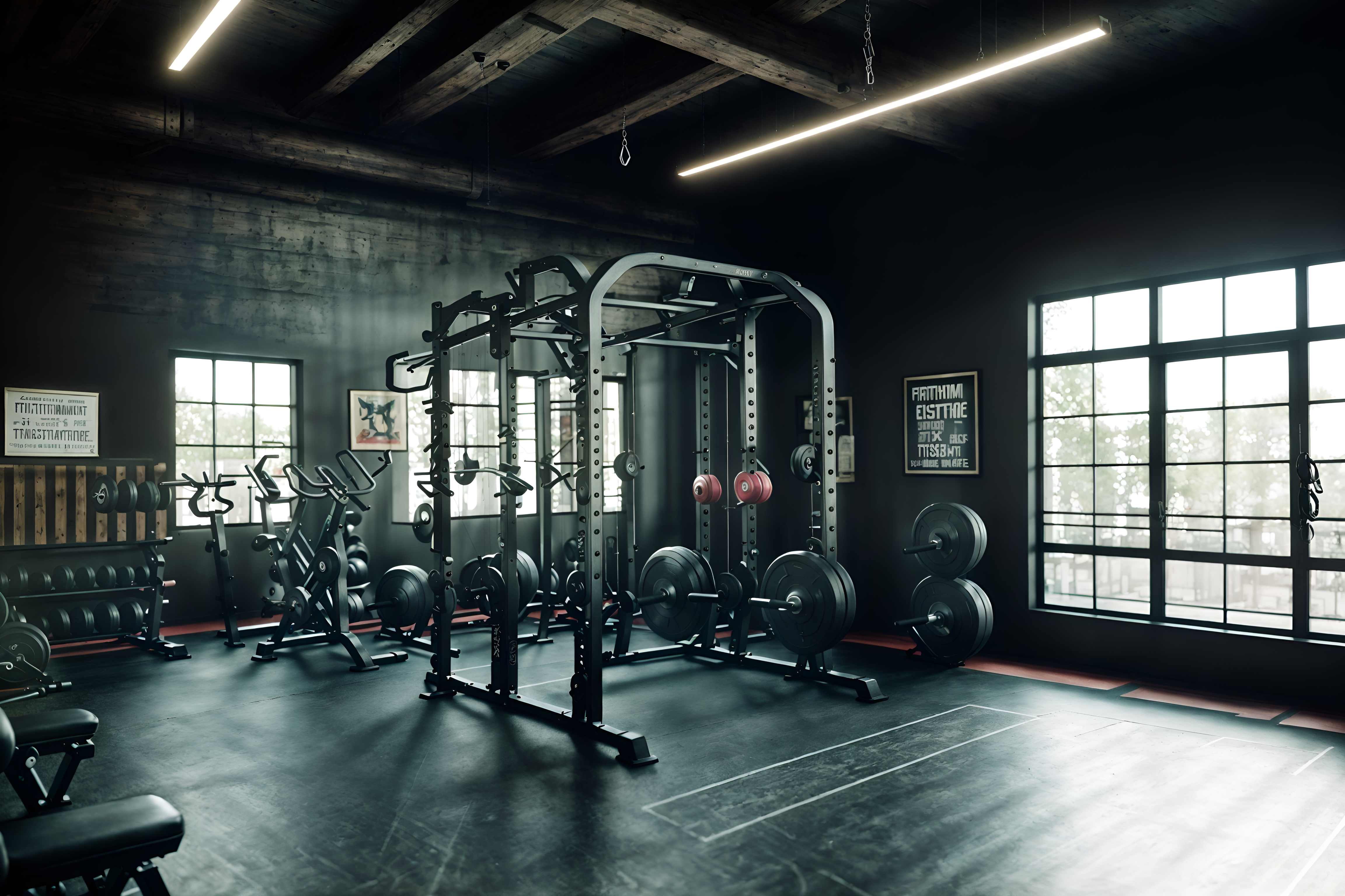 photo from pinterest of eclectic-style interior designed (fitness gym interior) with squat rack and crosstrainer and exercise bicycle and bench press and dumbbell stand and squat rack cinematic photo, highly detailed, cinematic lighting, ultra-detailed, ultrarealistic, photorealism, 8k. trending on pinterest. eclectic interior design style. masterpiece, cinematic light, ultrarealistic+, photorealistic+, 8k, raw photo, realistic, sharp focus on eyes, (symmetrical eyes), (intact eyes), hyperrealistic, highest quality, best quality, , highly detailed, masterpiece, best quality, extremely detailed 8k wallpaper, masterpiece, best quality, ultra-detailed, best shadow, detailed background, detailed face, detailed eyes, high contrast, best illumination, detailed face, dulux, caustic, dynamic angle, detailed glow. dramatic lighting. highly detailed, insanely detailed hair, symmetrical, intricate details, professionally retouched, 8k high definition. strong bokeh. award winning photo.