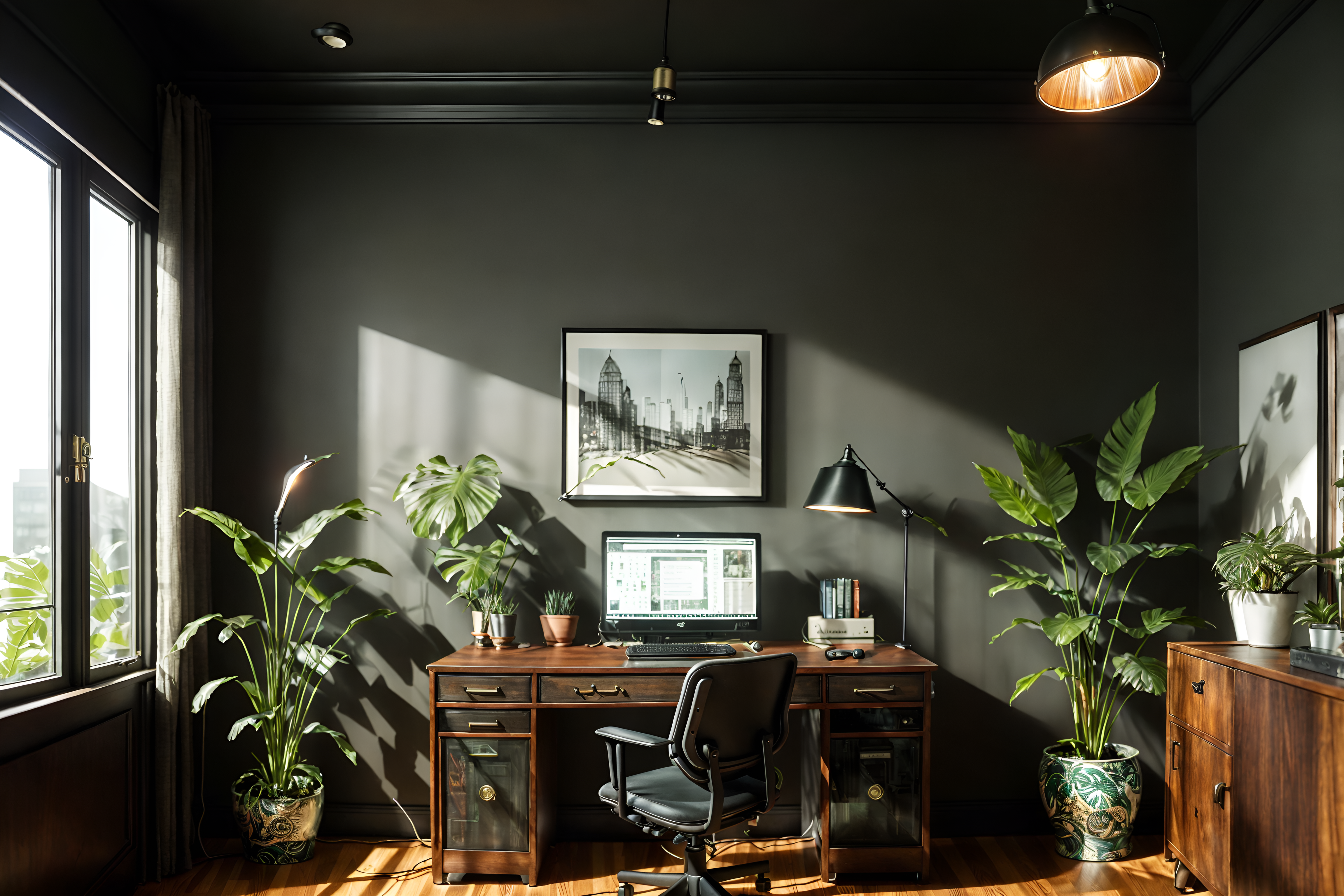 photo from pinterest of eclectic-style interior designed (home office interior) with plant and desk lamp and cabinets and computer desk and office chair and plant cinematic photo, highly detailed, cinematic lighting, ultra-detailed, ultrarealistic, photorealism, 8k. trending on pinterest. eclectic interior design style. masterpiece, cinematic light, ultrarealistic+, photorealistic+, 8k, raw photo, realistic, sharp focus on eyes, (symmetrical eyes), (intact eyes), hyperrealistic, highest quality, best quality, , highly detailed, masterpiece, best quality, extremely detailed 8k wallpaper, masterpiece, best quality, ultra-detailed, best shadow, detailed background, detailed face, detailed eyes, high contrast, best illumination, detailed face, dulux, caustic, dynamic angle, detailed glow. dramatic lighting. highly detailed, insanely detailed hair, symmetrical, intricate details, professionally retouched, 8k high definition. strong bokeh. award winning photo.
